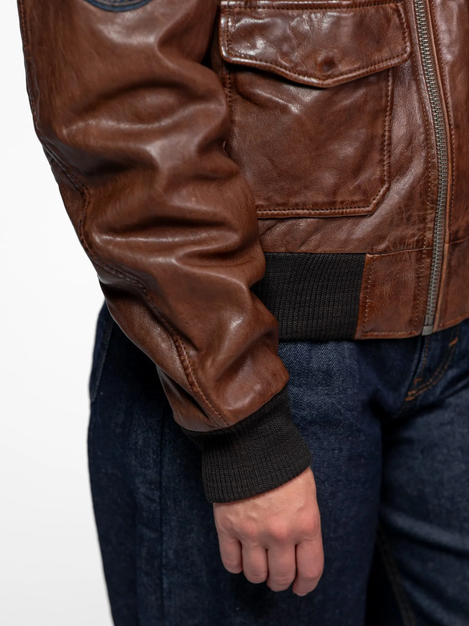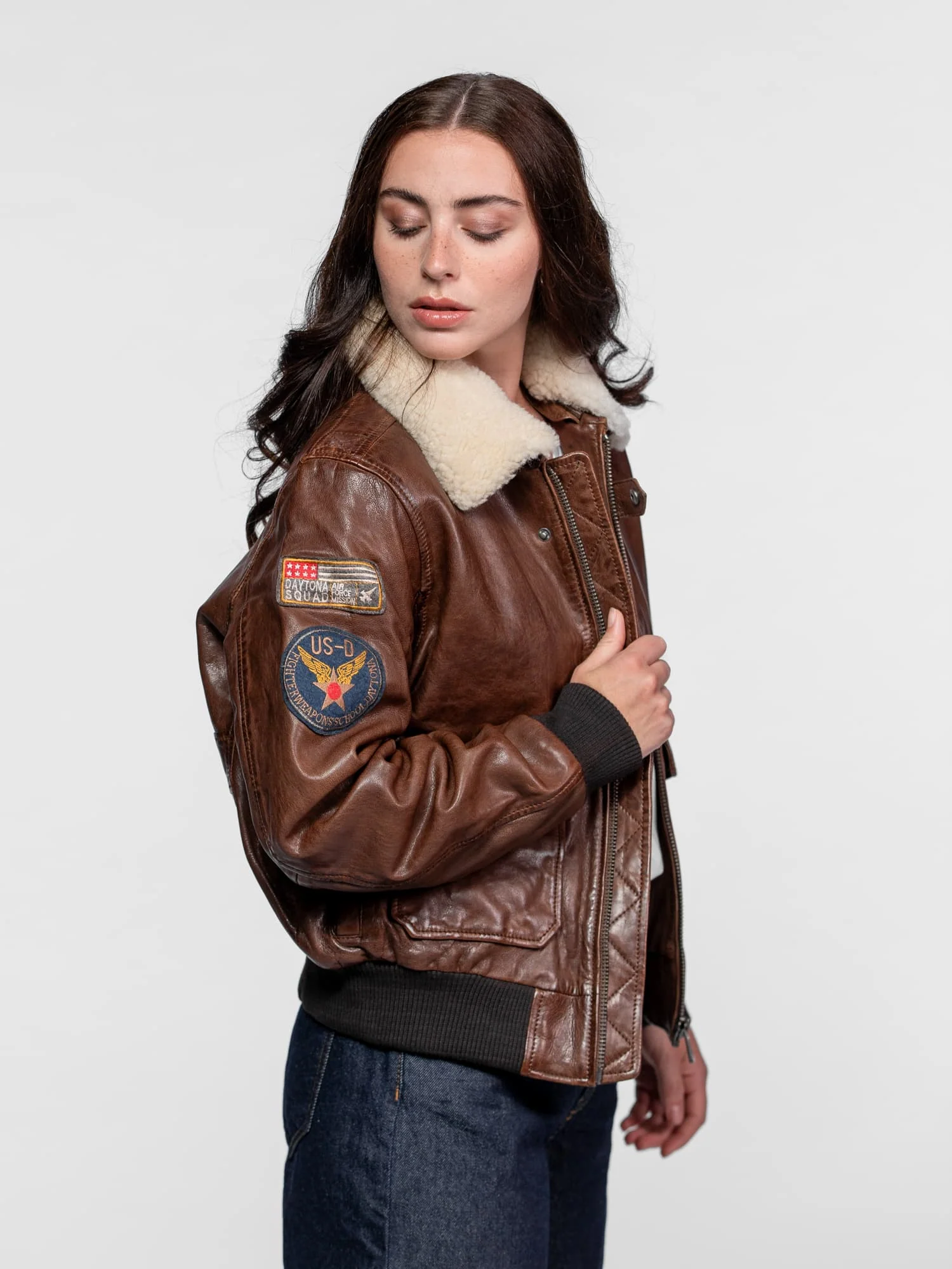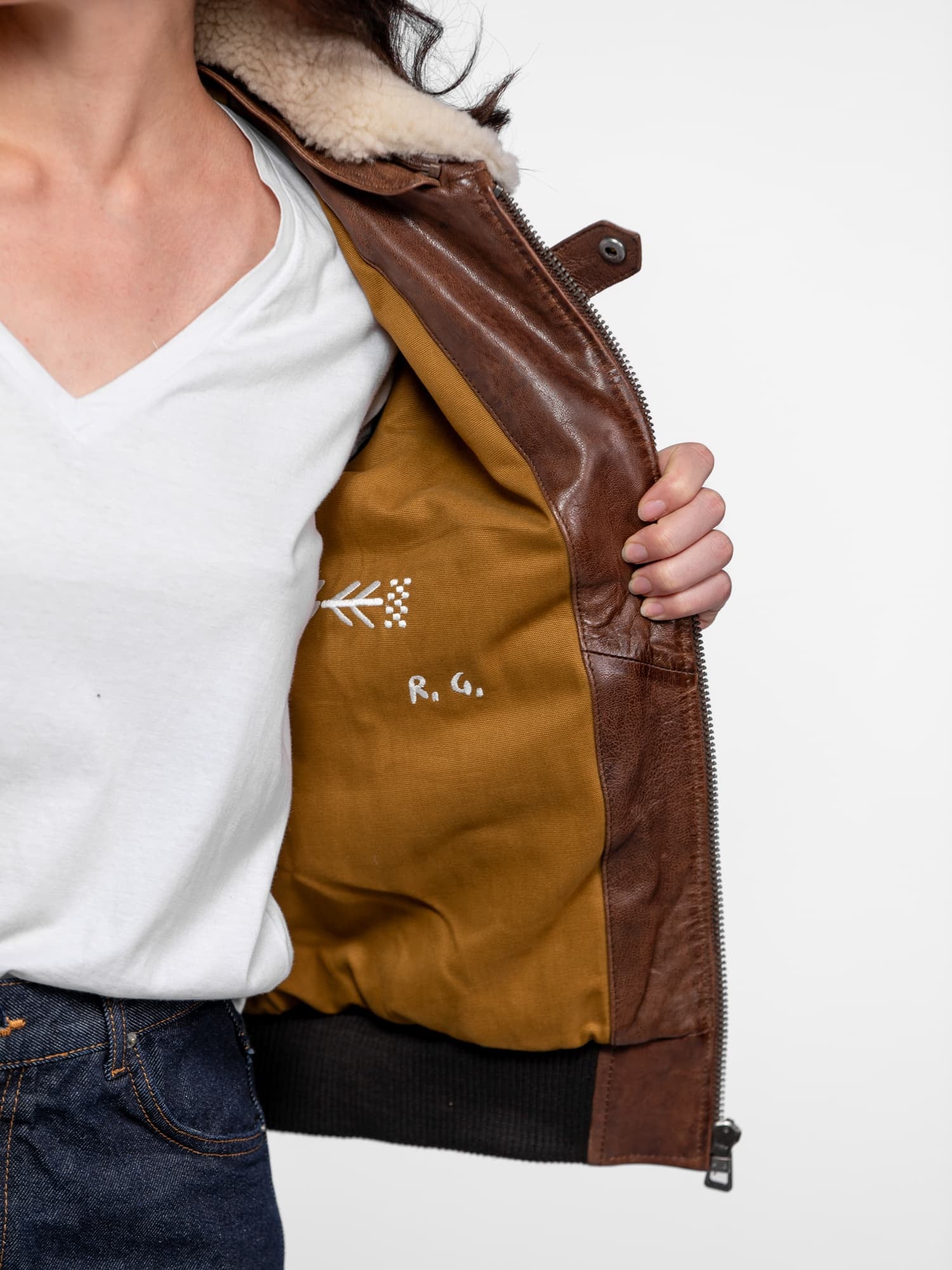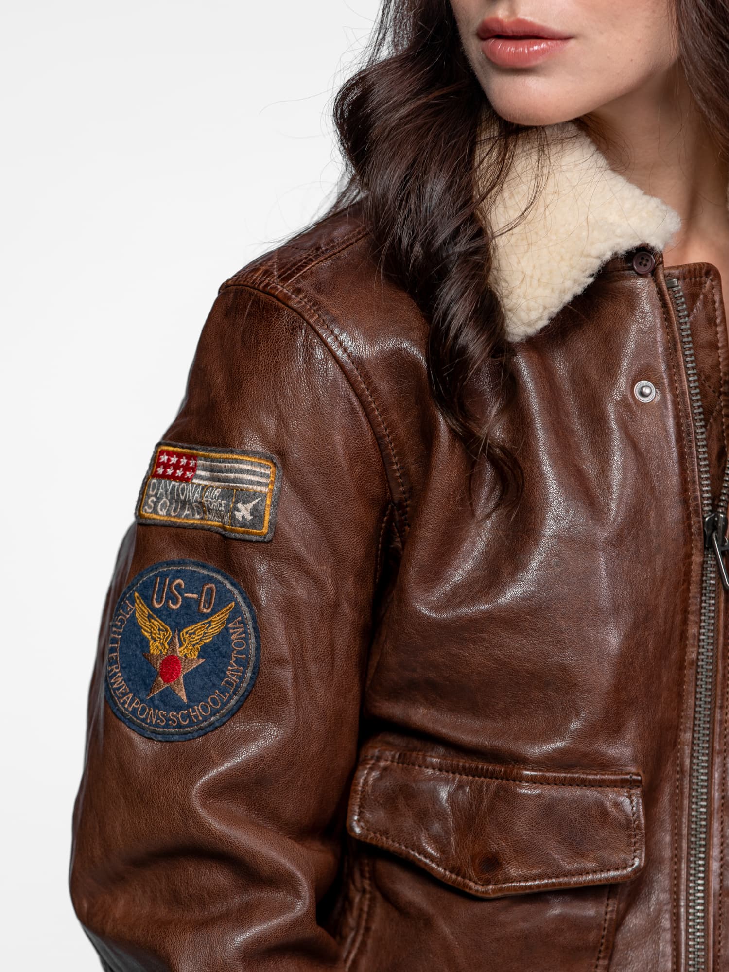 Optez pour un look aviateur avec cette flight jacket en cuir d’agneau. Ce blouson au style original et authentique possède de nombreux patchs brodés avec un col en mouton réel amovible. Muni d’une doublure chaude, il est parfait pour un hiver tendance.