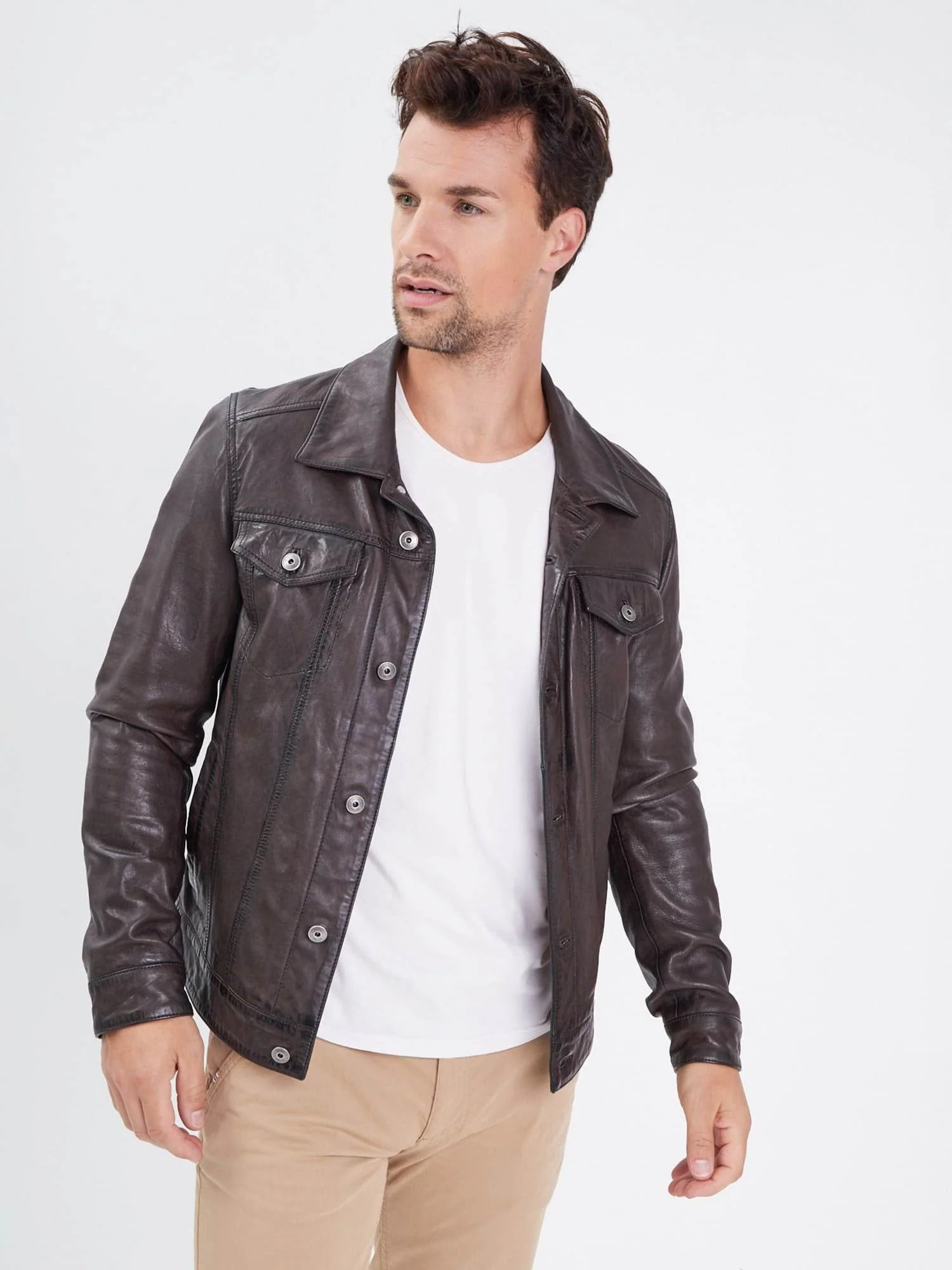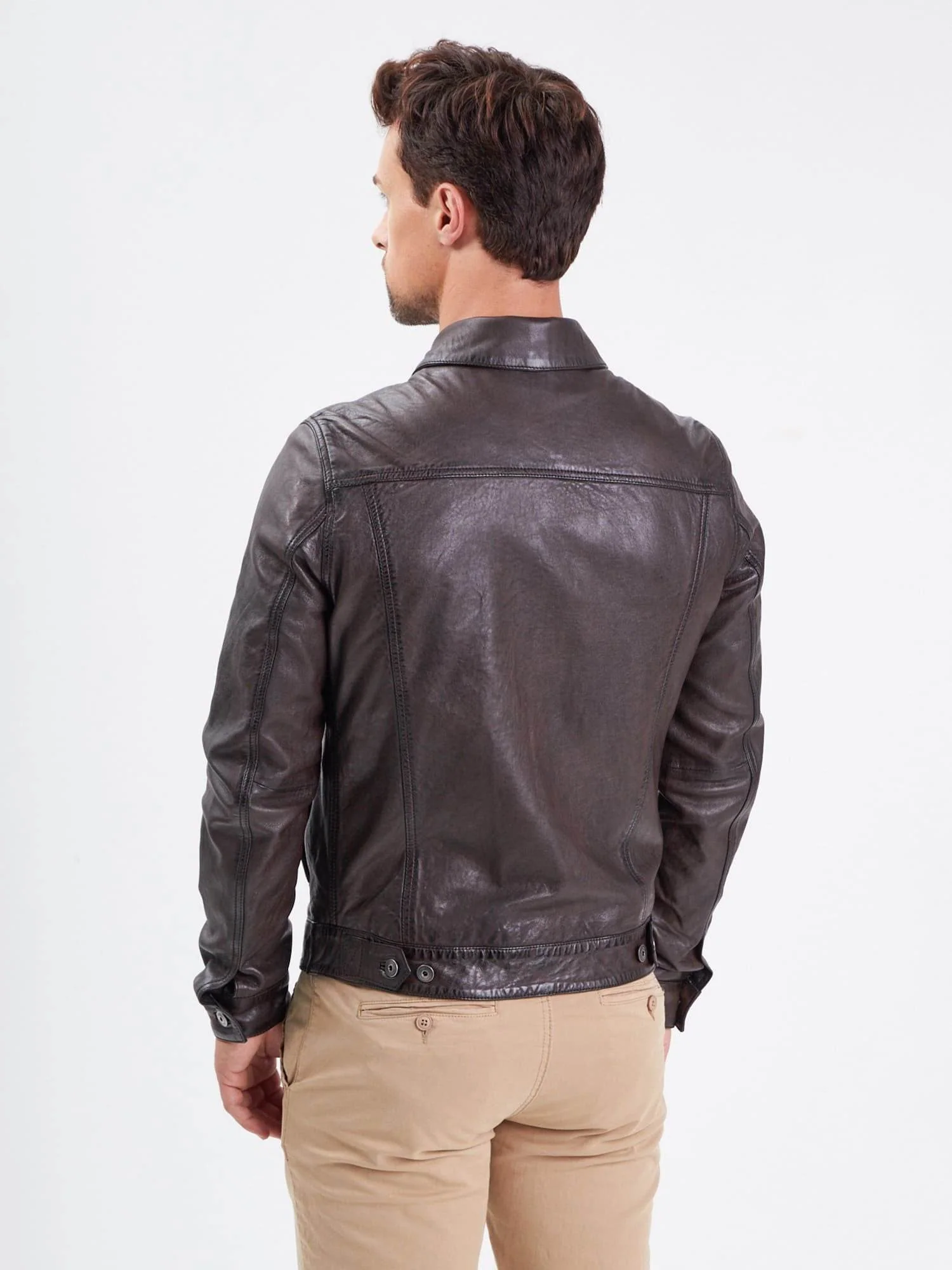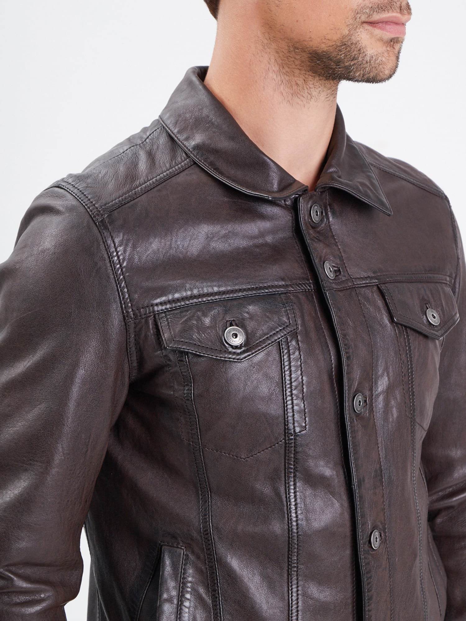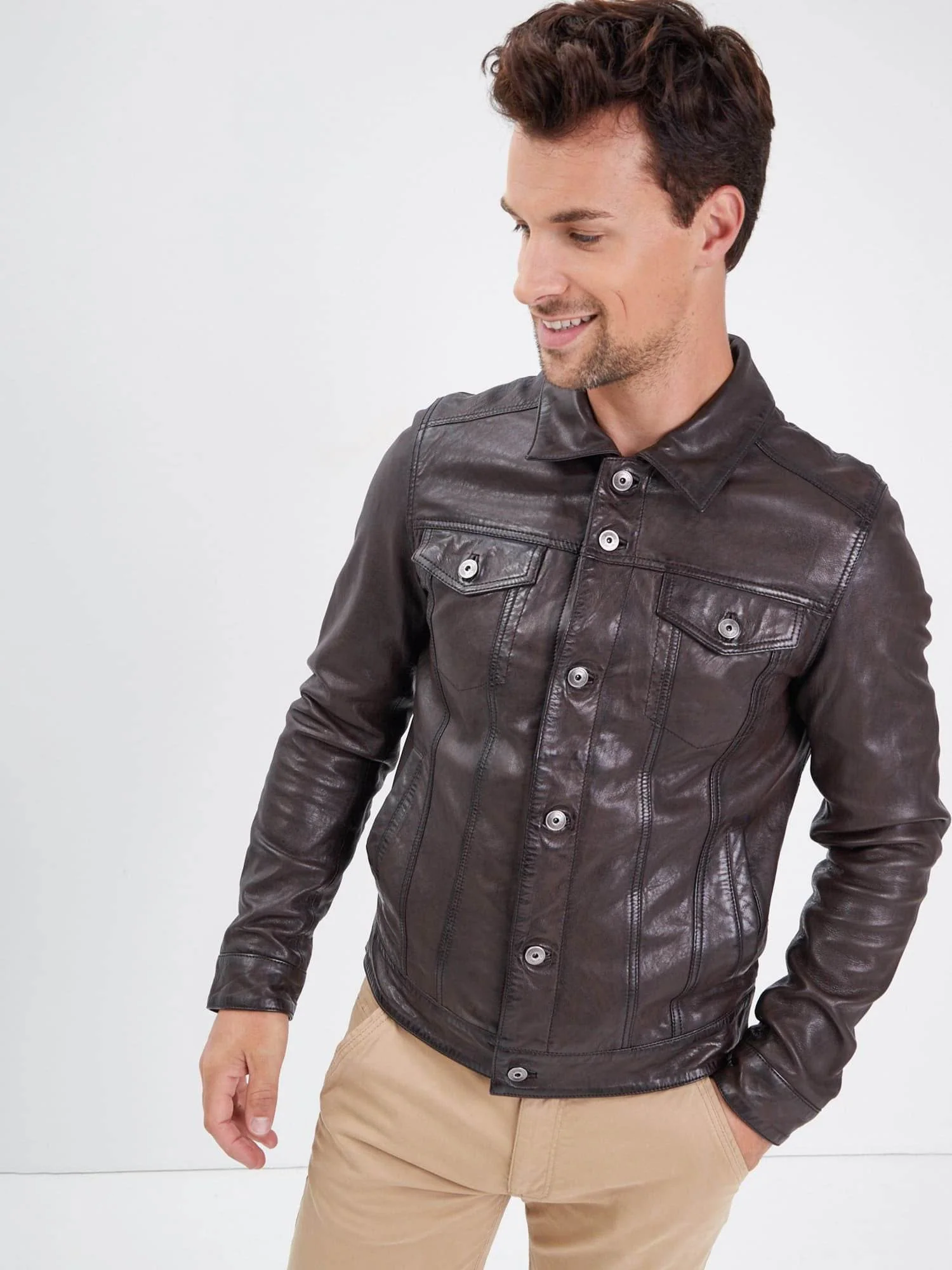 Notre bureau de création a revisité la classique veste style trucker pour la proposer dans un cuir d’agneau au tannage végétal. Tous les éléments de cet emblématique veste sont présents : col chemise, boutonnières, poches plaquées…