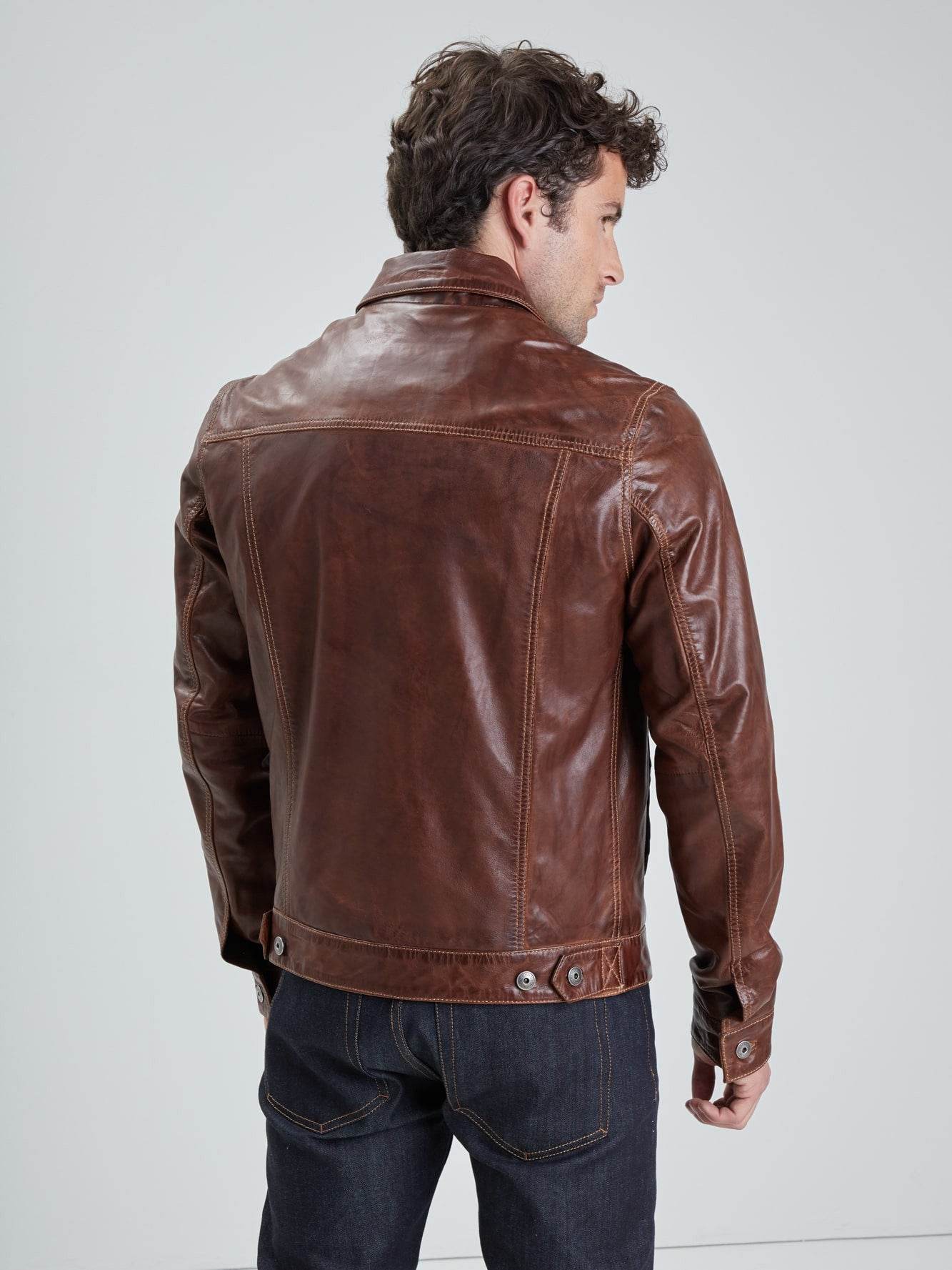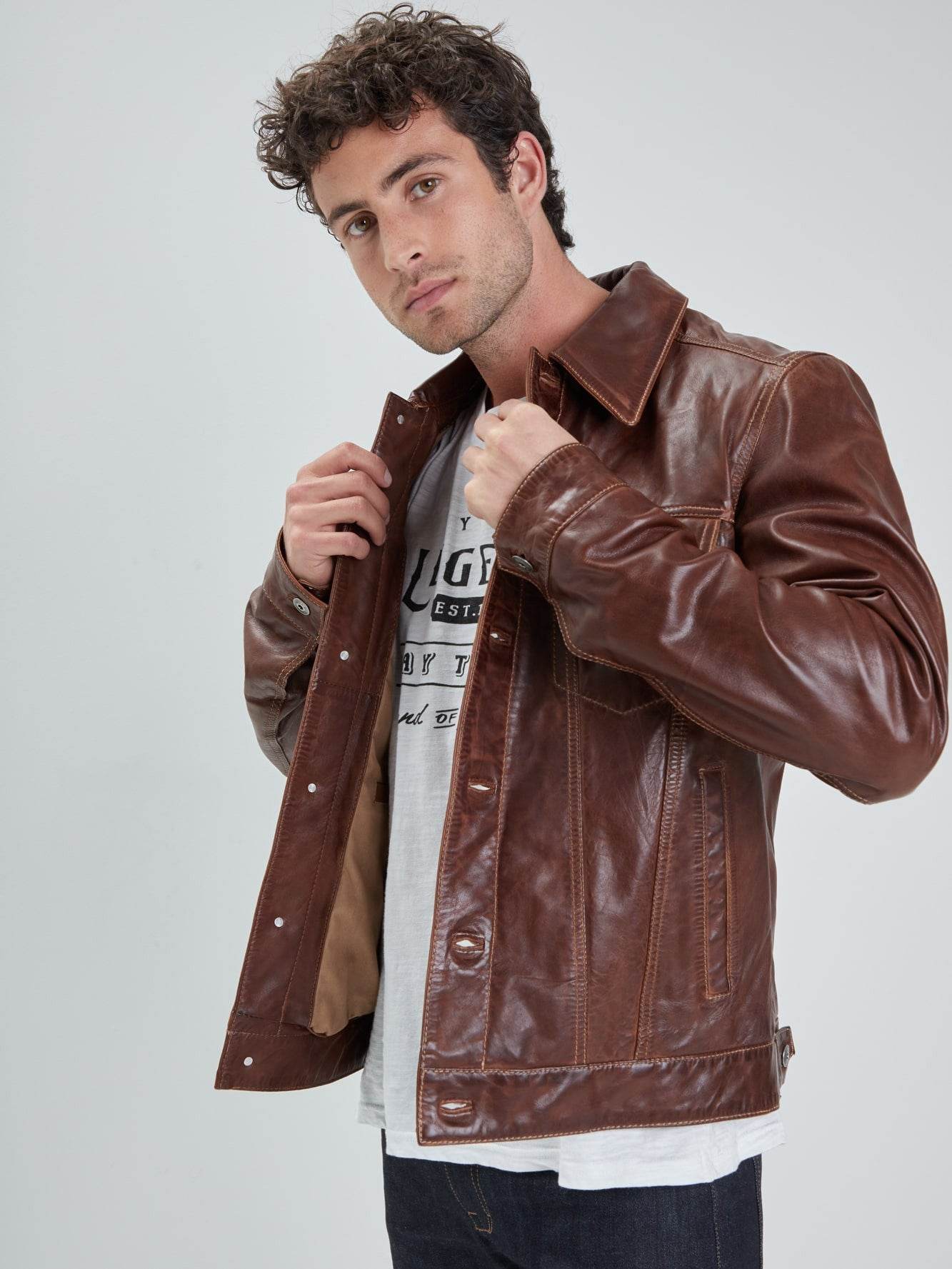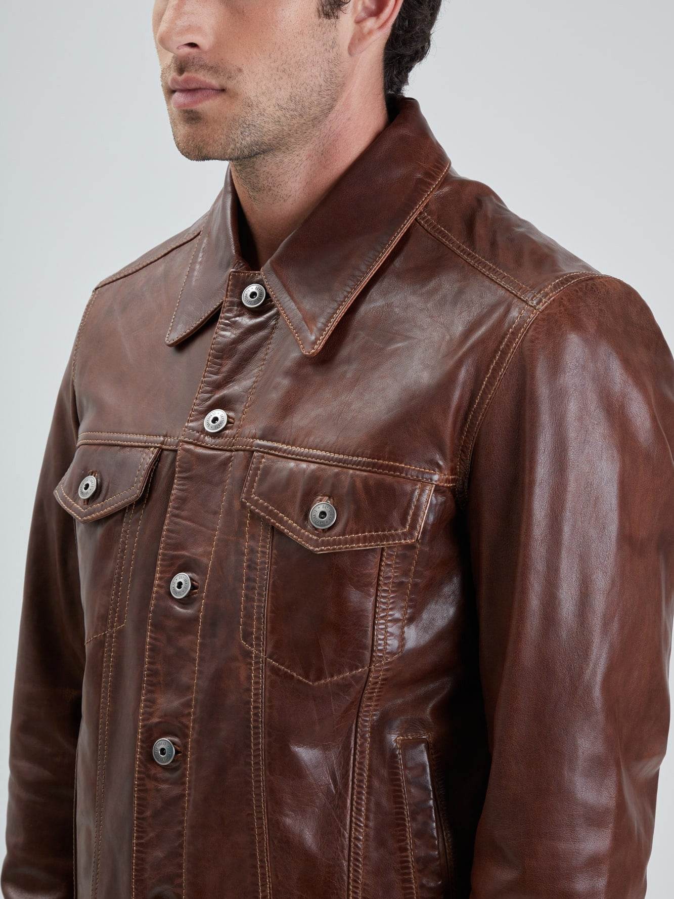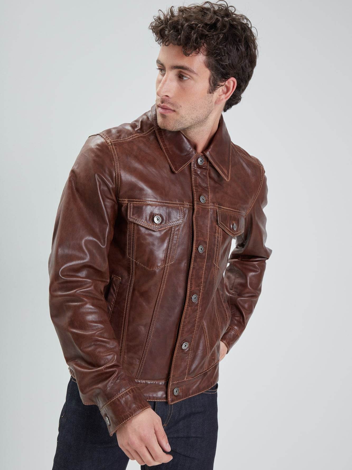 Notre bureau de création a revisité la classique veste style trucker pour la proposer dans un cuir d’agneau au tannage végétal. Tous les éléments de cet emblématique veste sont présents : col chemise, boutonnières, poches plaquées… Important: Ce modèle possède une coupe ajustée. Nous vous conseillons de choisir une taille supplémentaire.