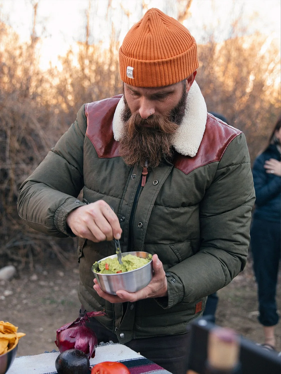 Avec cette nouvelle veste pour temps froid, nous souhaitions répondre à plusieurs besoins : confort idéal, chaleur supérieure, extérieur polyvalent, le tout dans une veste clé en main. Conçue avec un extérieur en toile de coton ciré épais, un col en mouton véritable, un empiècement en cuir de vachette au tannage végétal et un rembourrage en polyester, cette pièce d’extérieur est idéale pour l’hiver.