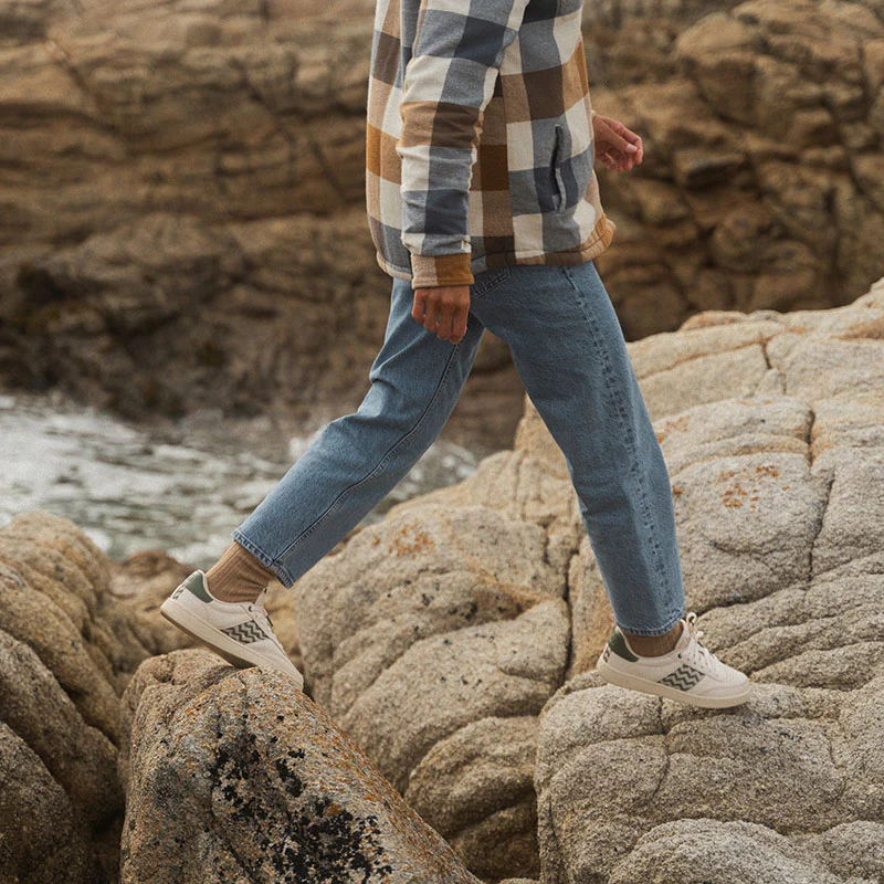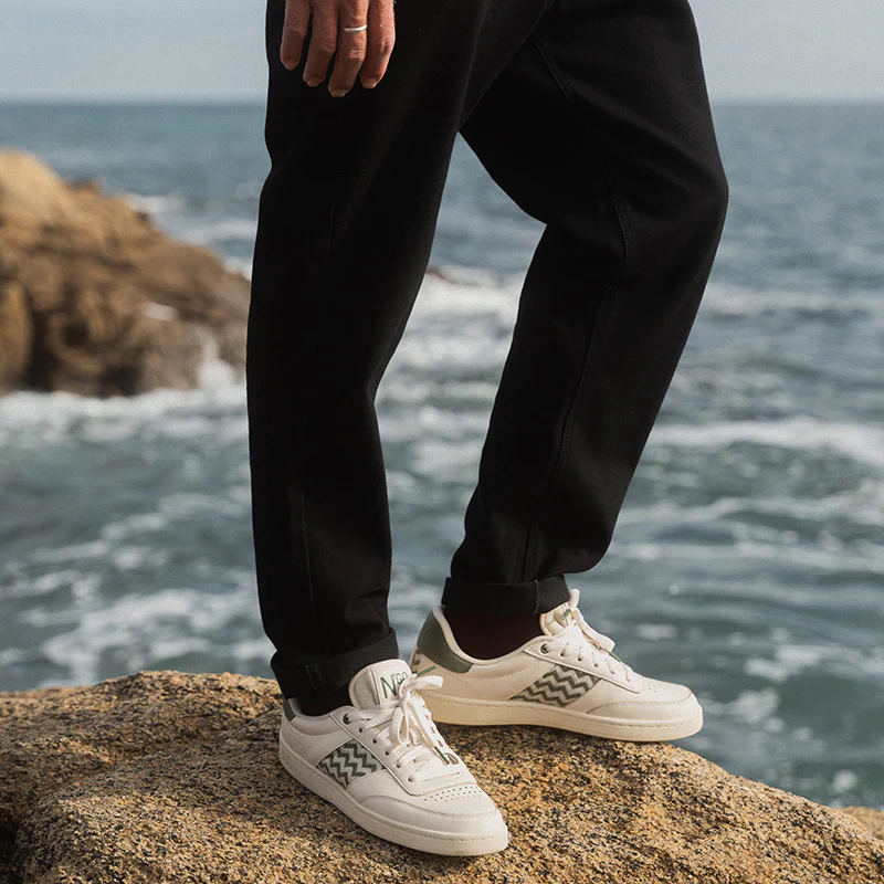 Composition : tige 100% cuir, tissage réalisé à la main en coton et polyester, doublure intérieure 100% polyester recyclé, semelle intérieure amovible 20% PET recyclé et 41% EVA bio sourcé (canne à sucre) et 39% EVA conventionnel, semelle extérieure 70% caoutchouc naturel vietnamien et 30% synthétique, lacets 100% polyester recyclé.
