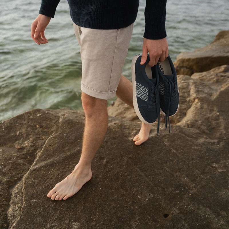 Composition : tige 100% coton biologique, tissage réalisé à la main en coton et polyester, doublure intérieure 100% coton bio, semelle intérieure amovible 20% PET recyclé et 41% EVA bio sourcé (canne à sucre) et 39% EVA conventionnel, semelle extérieure 70% caoutchouc naturel vietnamien et 30% synthétique, lacets 100% coton bio.