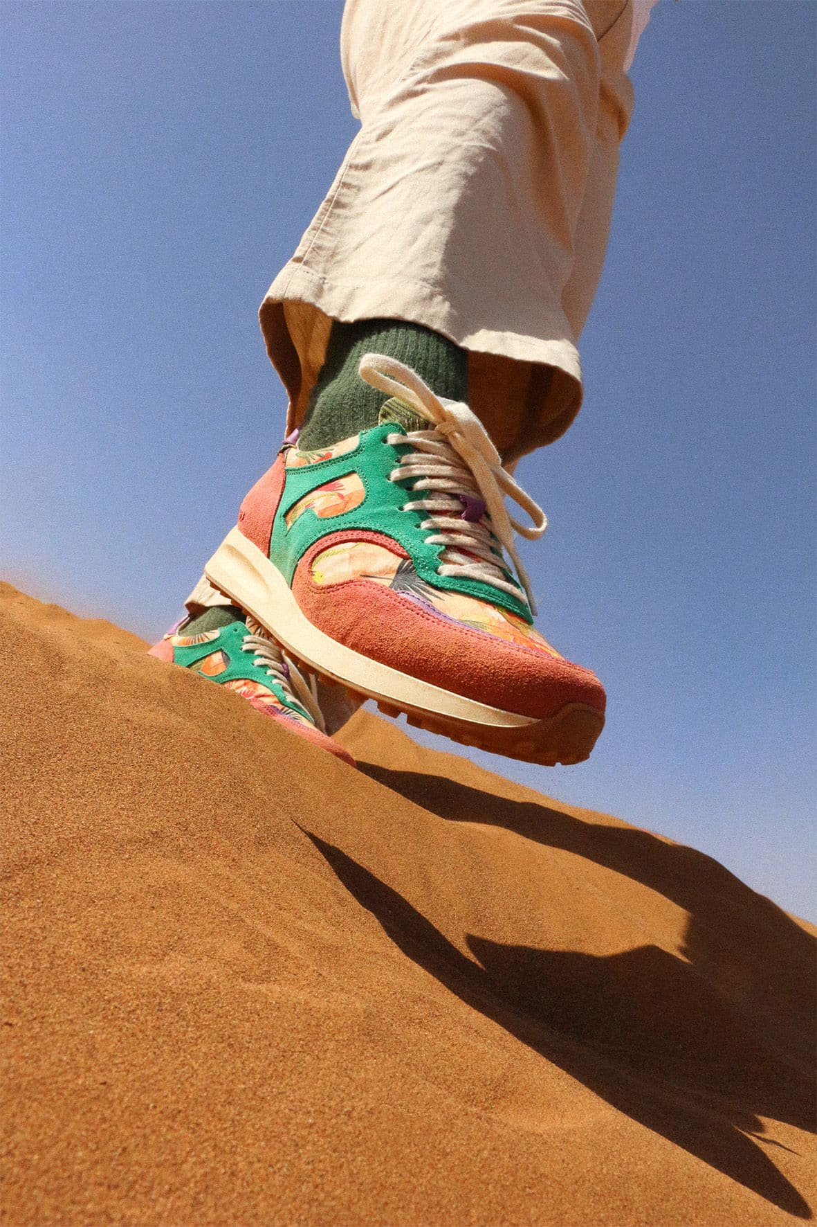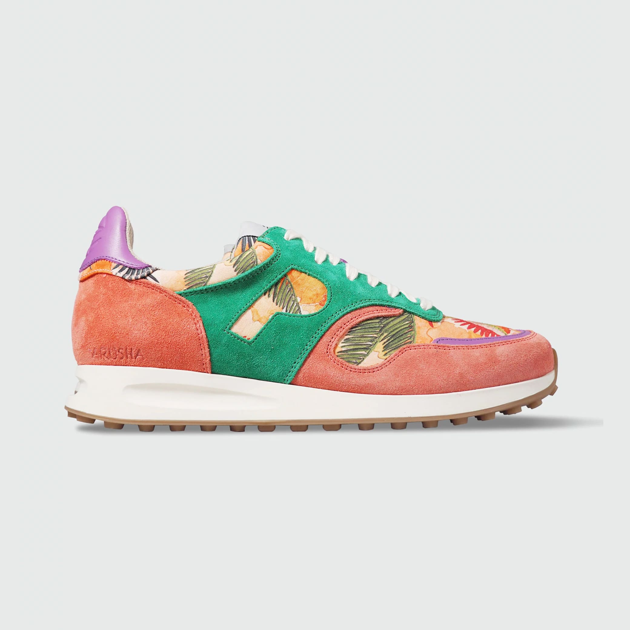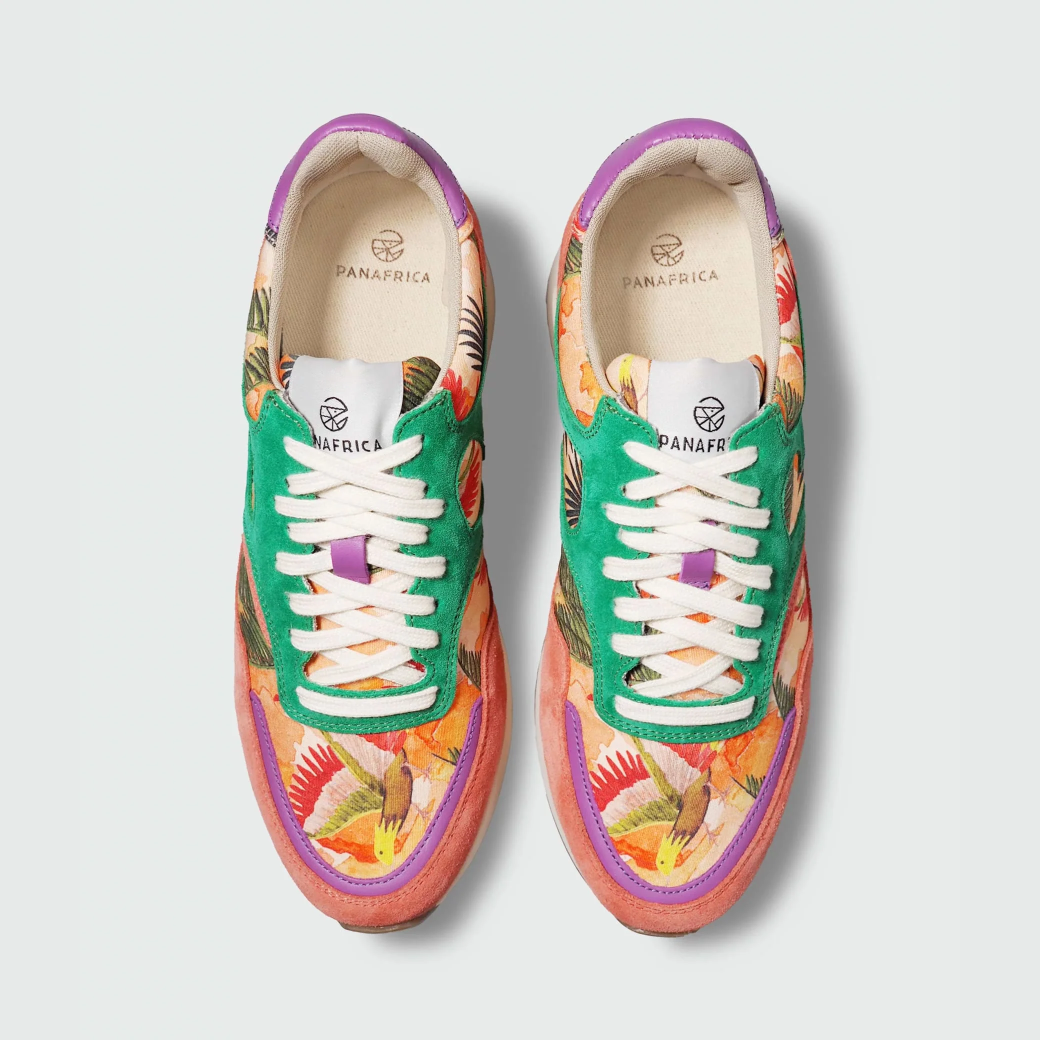 Composition : tige tissu wax 100% coton, cuir suède, doublure 100% polyester recyclé, semelle gomme, empiècements cuir pleine fleur, lacets 100% coton.