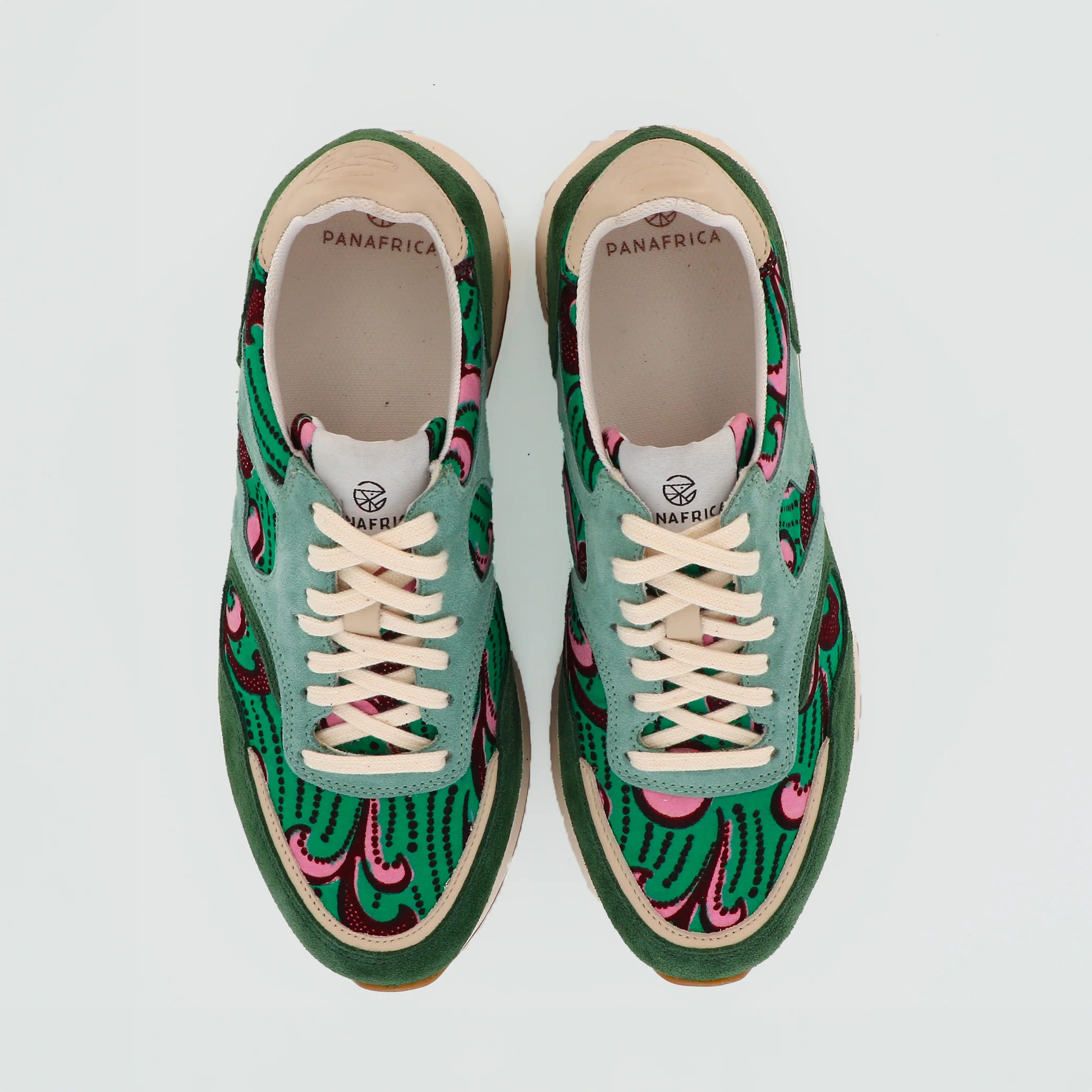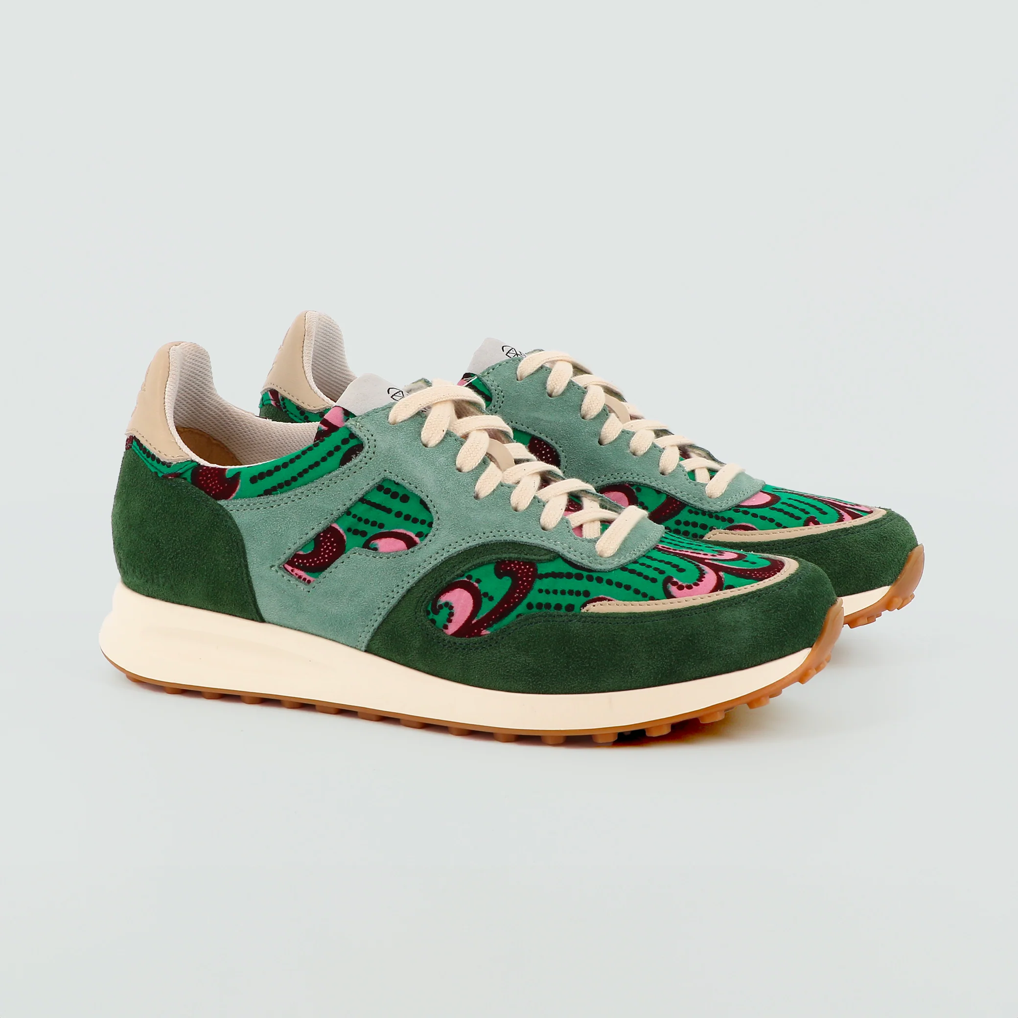 Composition : tige tissu wax 100% coton, cuir suède, doublure 100% polyester recyclé, semelle gomme, empiècements cuir pleine fleur, lacets 100% coton.