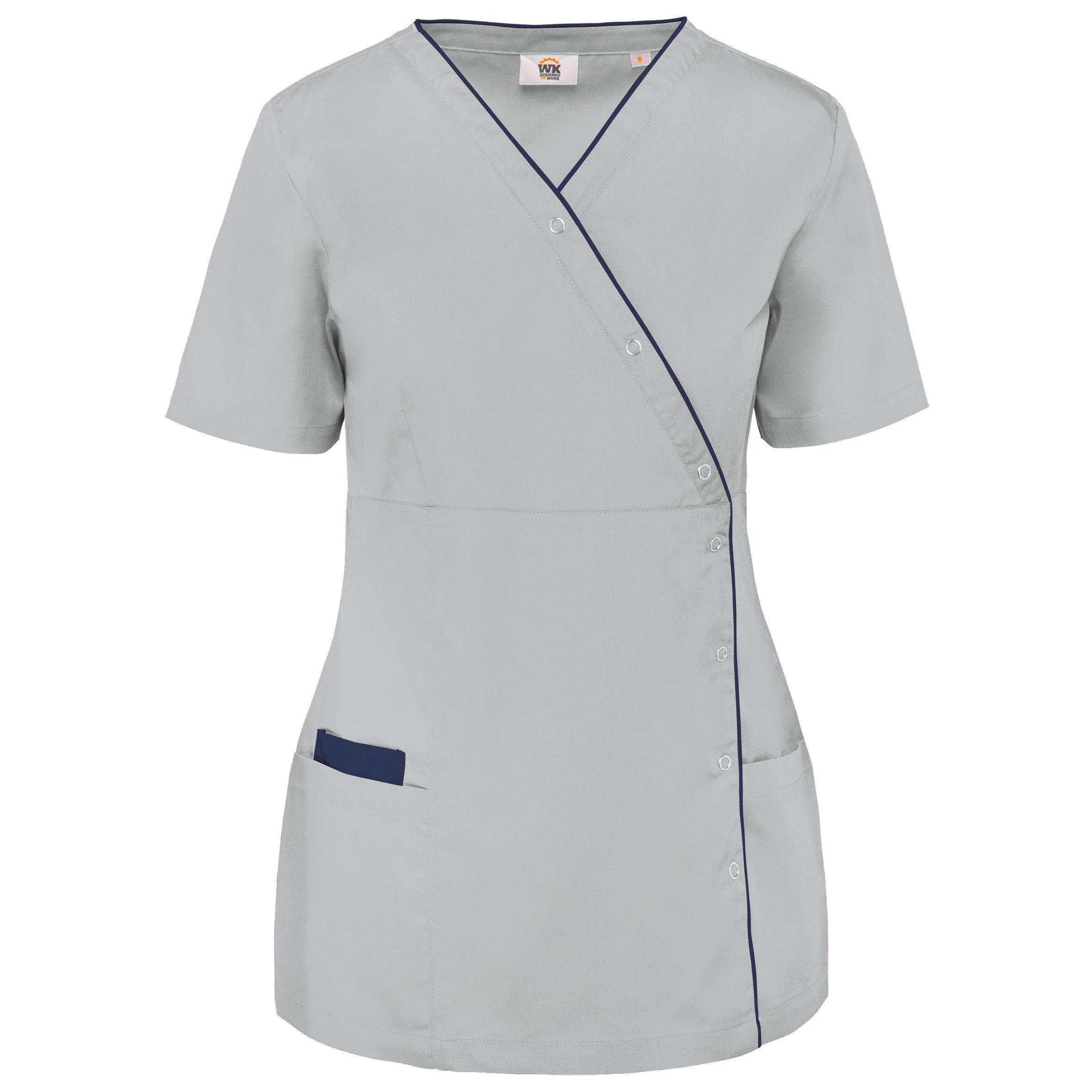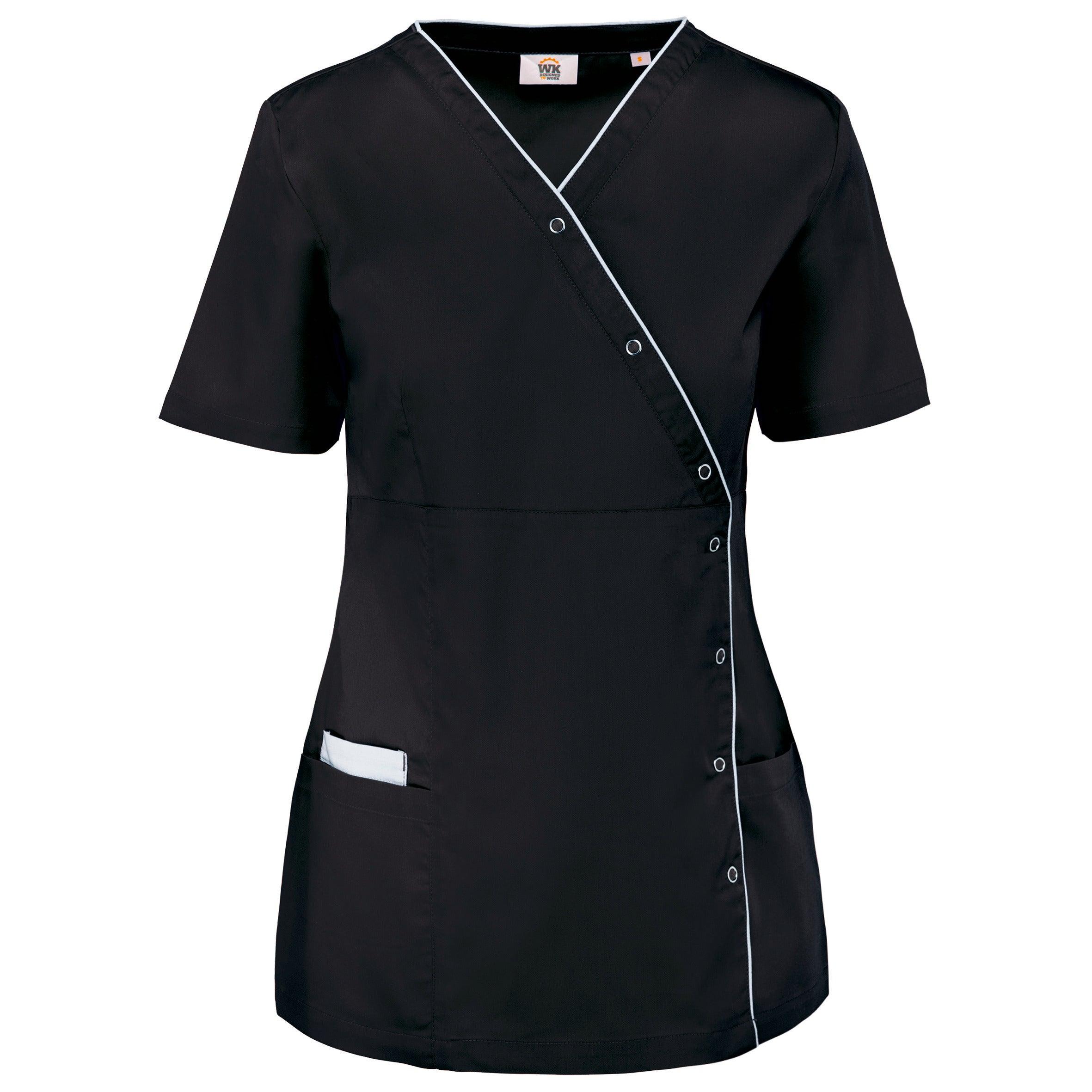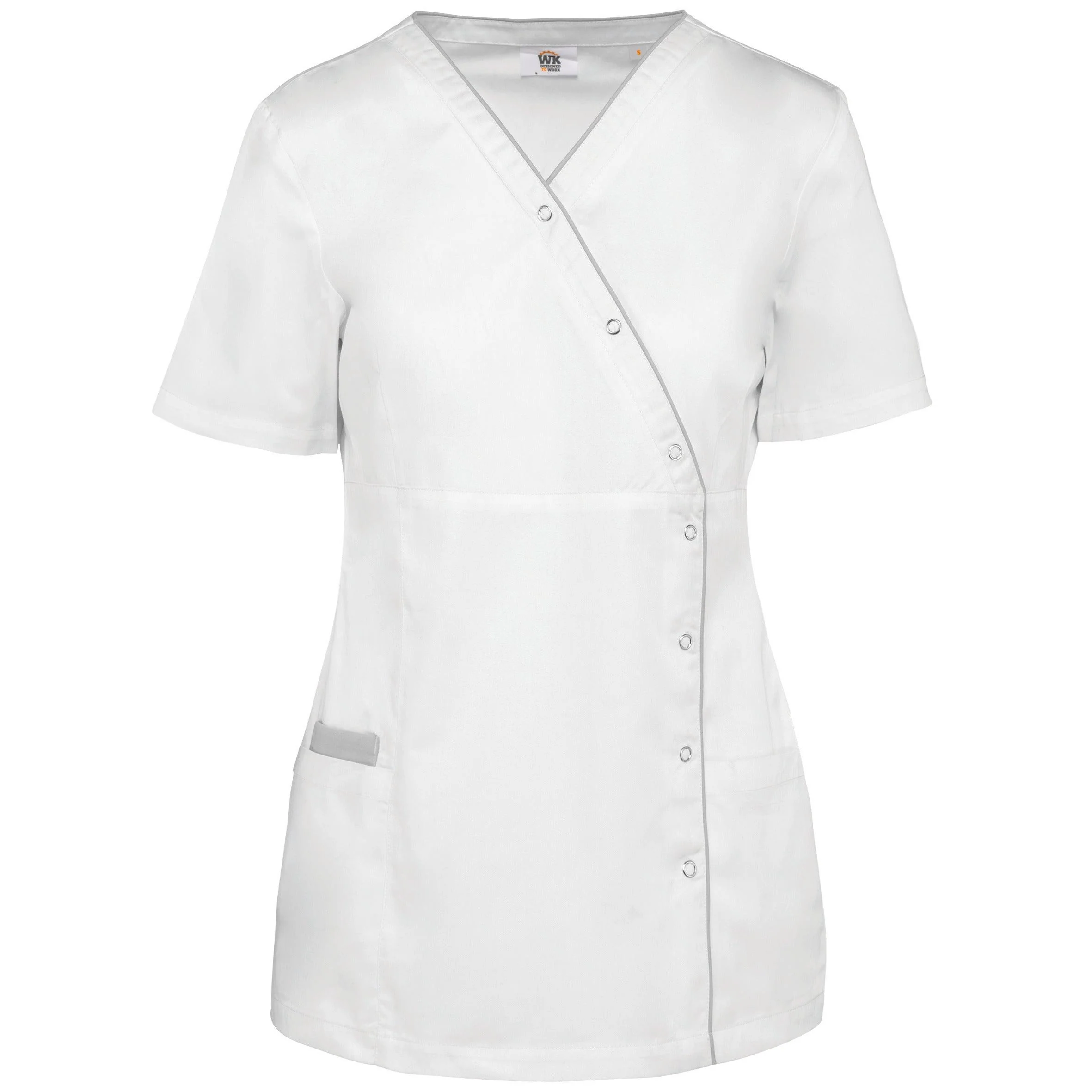 65% polyester / 35% coton. Tissu sergé. Norme ISO 15797 Lavage industriel 75°C (20 lavages). Coupe ajustée grâce à des pinces devant et dos pour une coupe plus féminine. Encolure en V, Boutonnage asymétrique par bouton-pression. 2 poches avant dont une (à droite) à double compartiments (poche intérieure à bord contrasté). Passepoil contrasté à l’encolure et le long de la patte de fermeture. Etiquette nom à l’intérieur du vêtement. Etiquette de marque Tear Away.