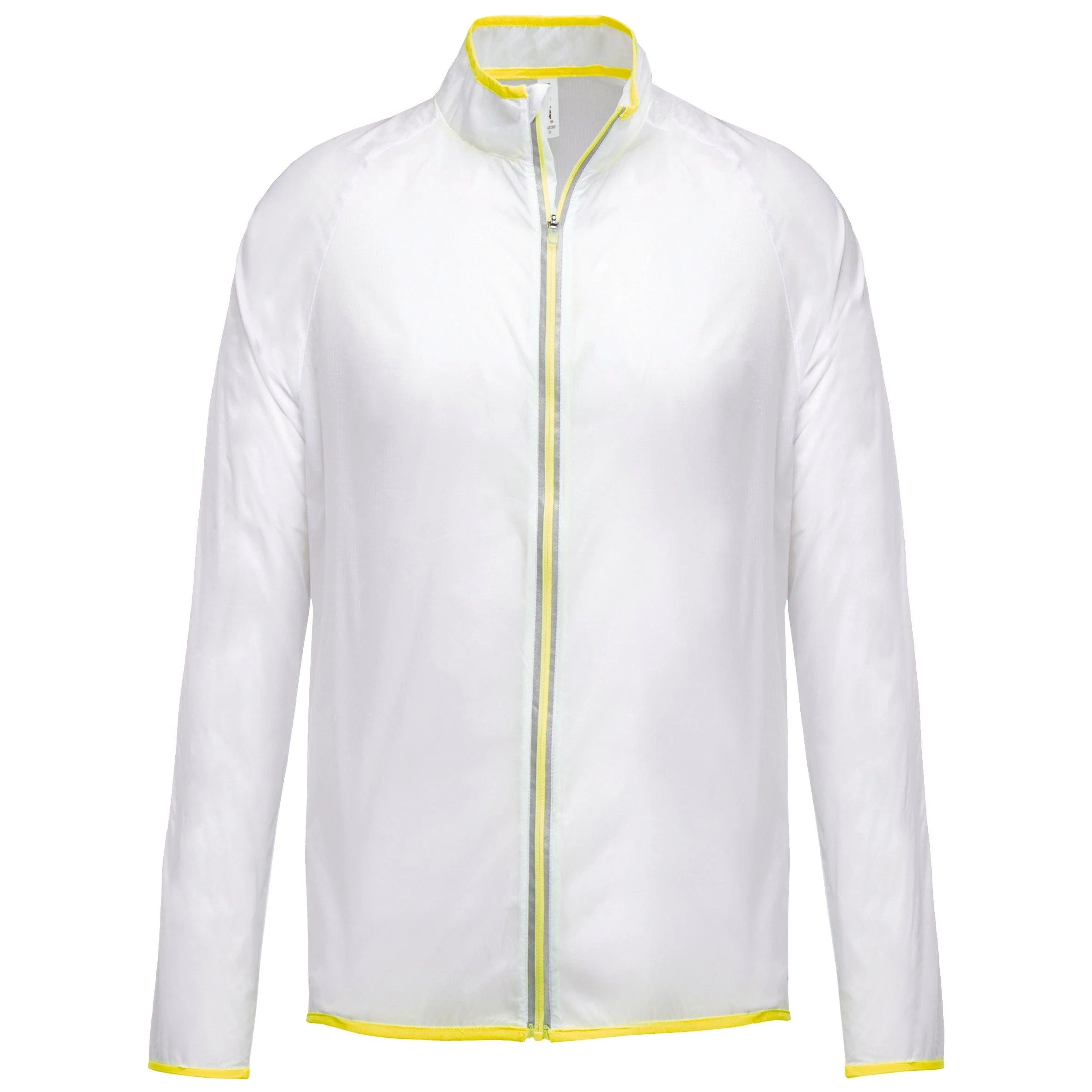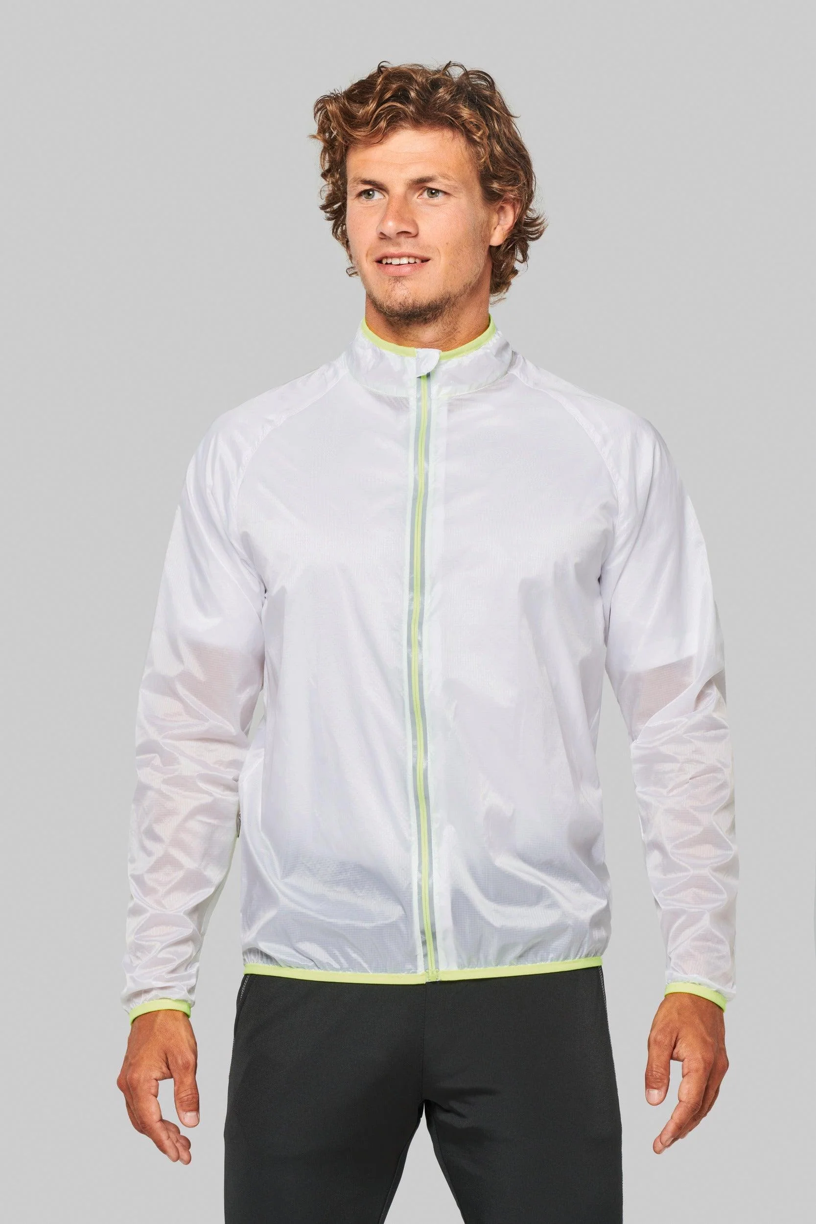 100% polyamide ripstop. Tissu ultra léger. Manches raglan. Biais élastiqués fluorescents col, bas de manches et de vêtement. Fermeture zippée avant avec bande réfléchissante. 1 poche zippée côté permettant de replier le blouson à l’intérieur (système K-way® avec crochet de suspension).