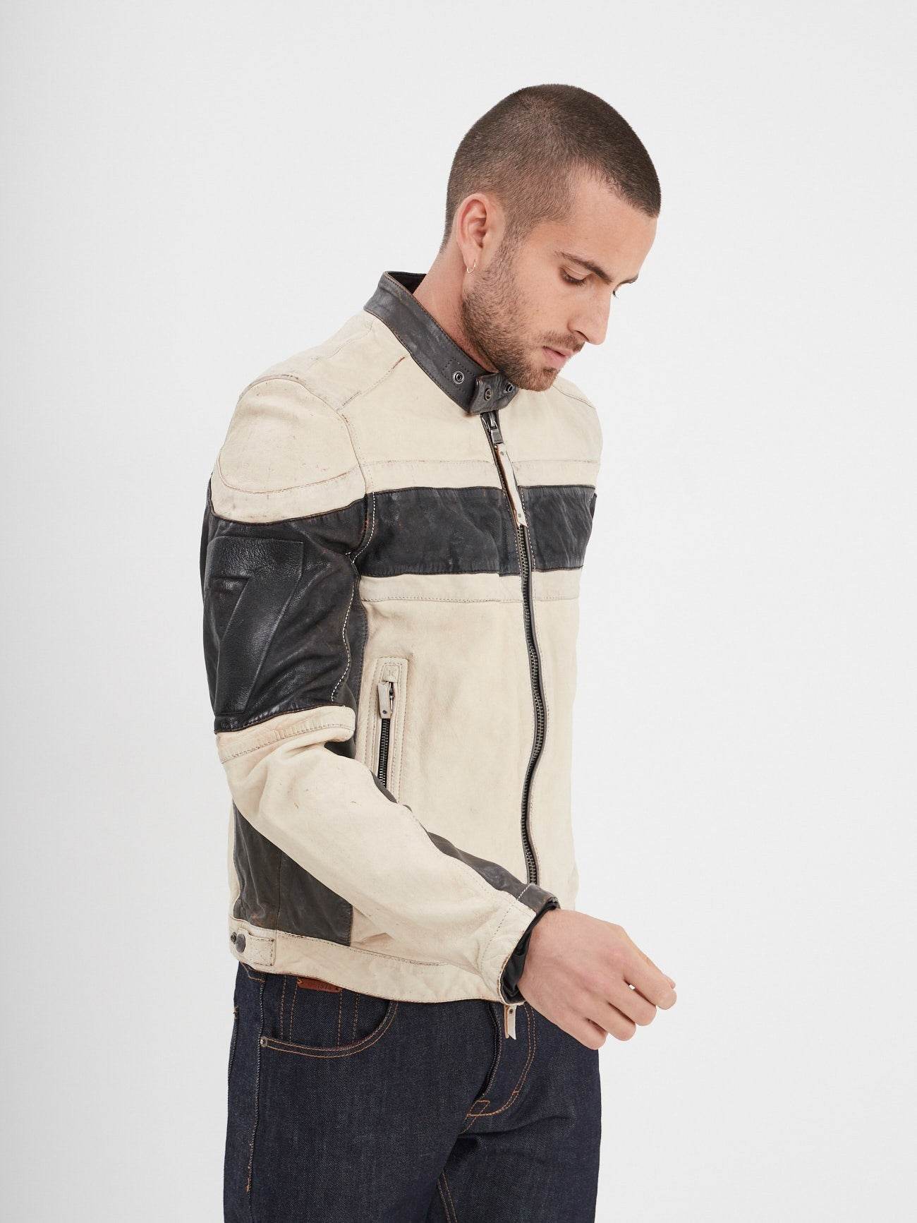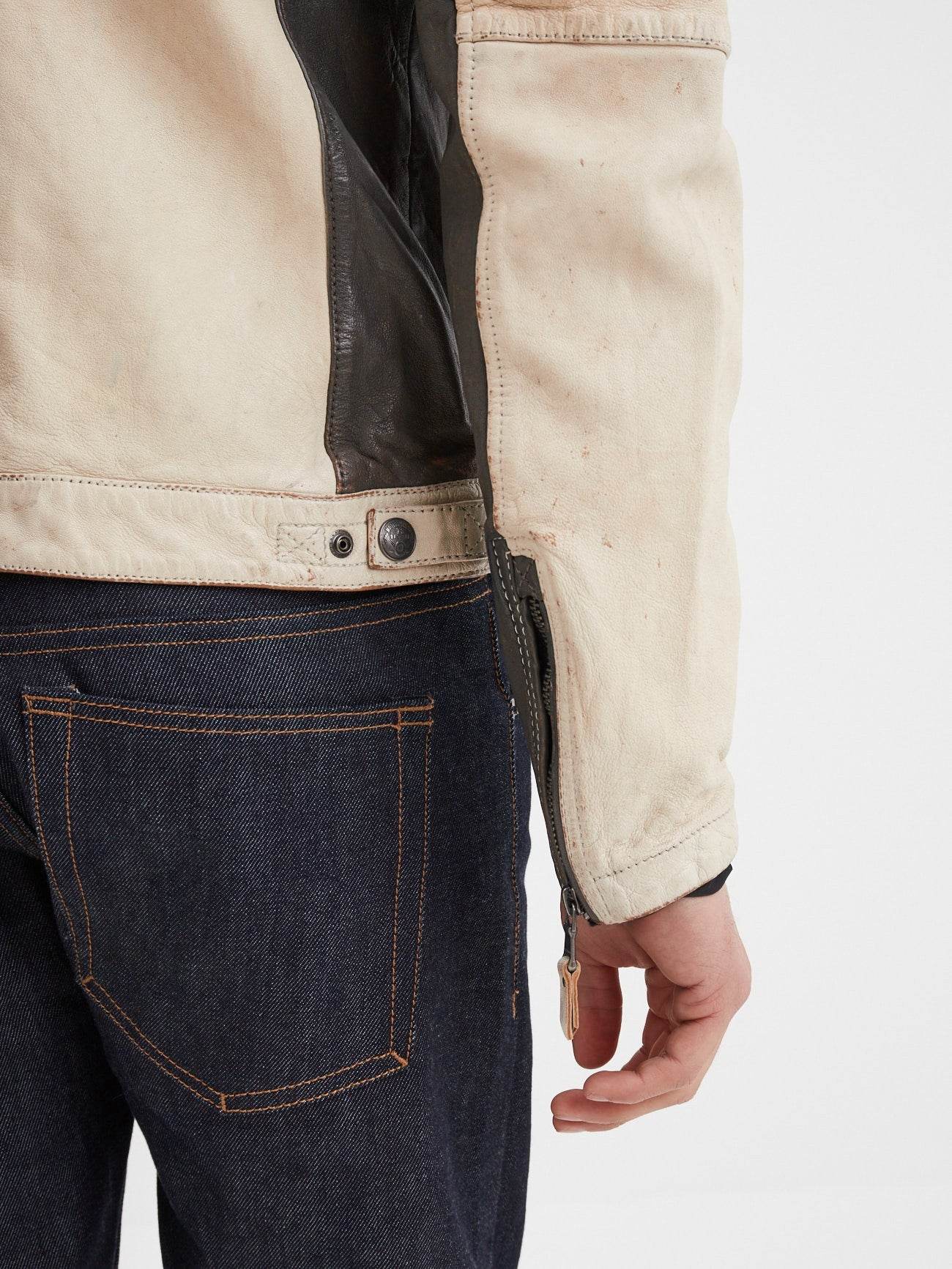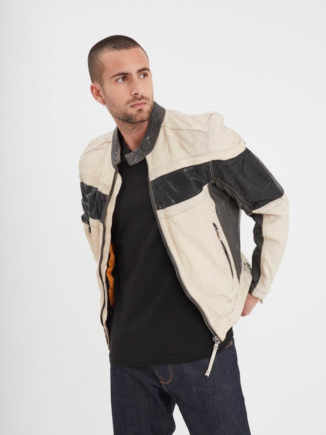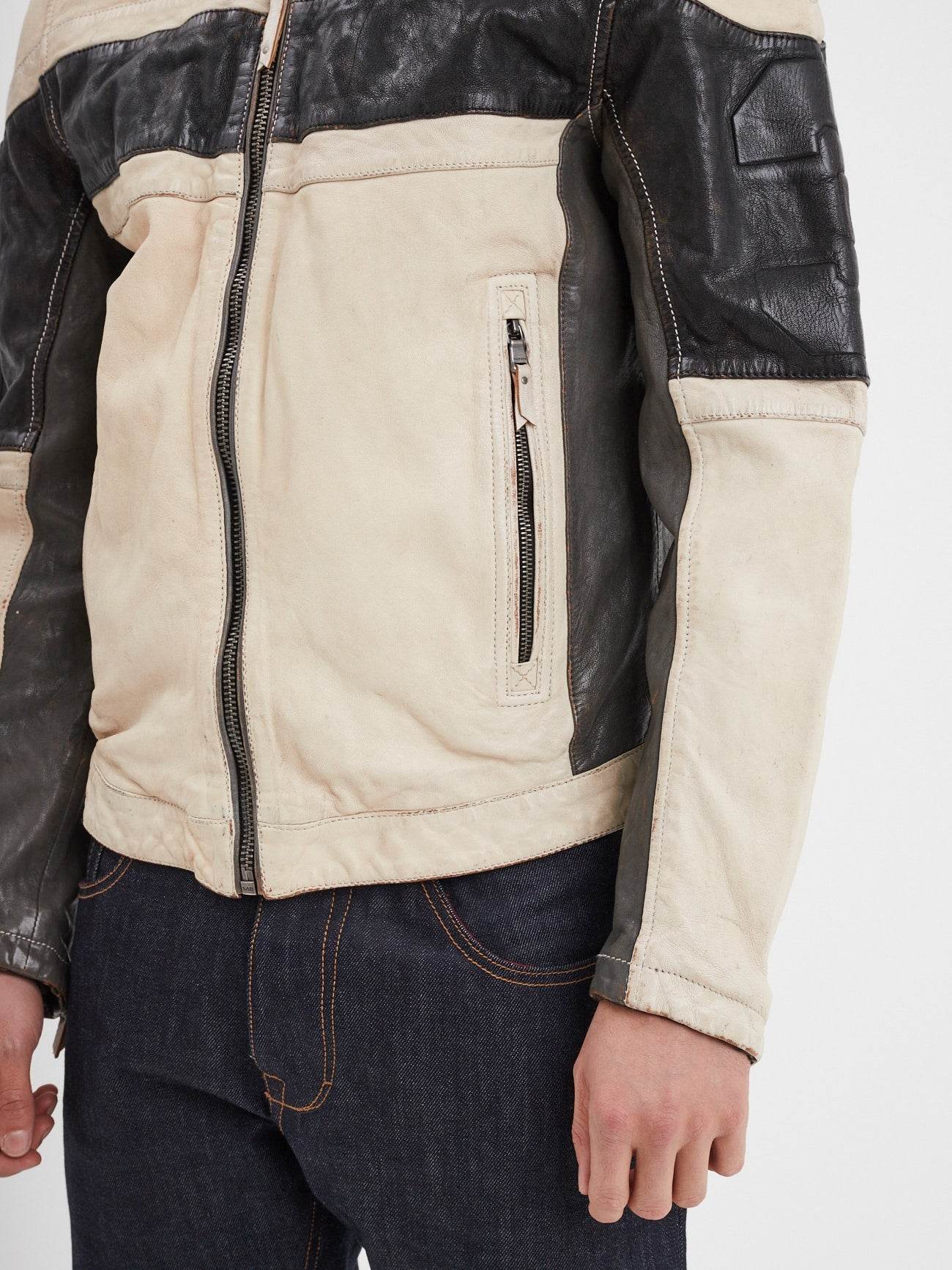Ce blouson à l’aspect vieilli semble avoir quelques années de vécues derrière lui. Il est fabriqué dans un cuir de mouton épais qui a subit un lavage intensif aux pierres pour lui donner cette patine froissée et marquée.