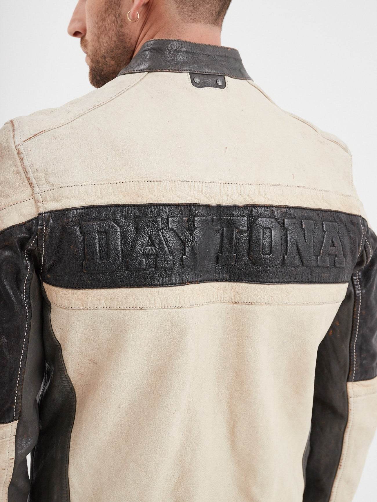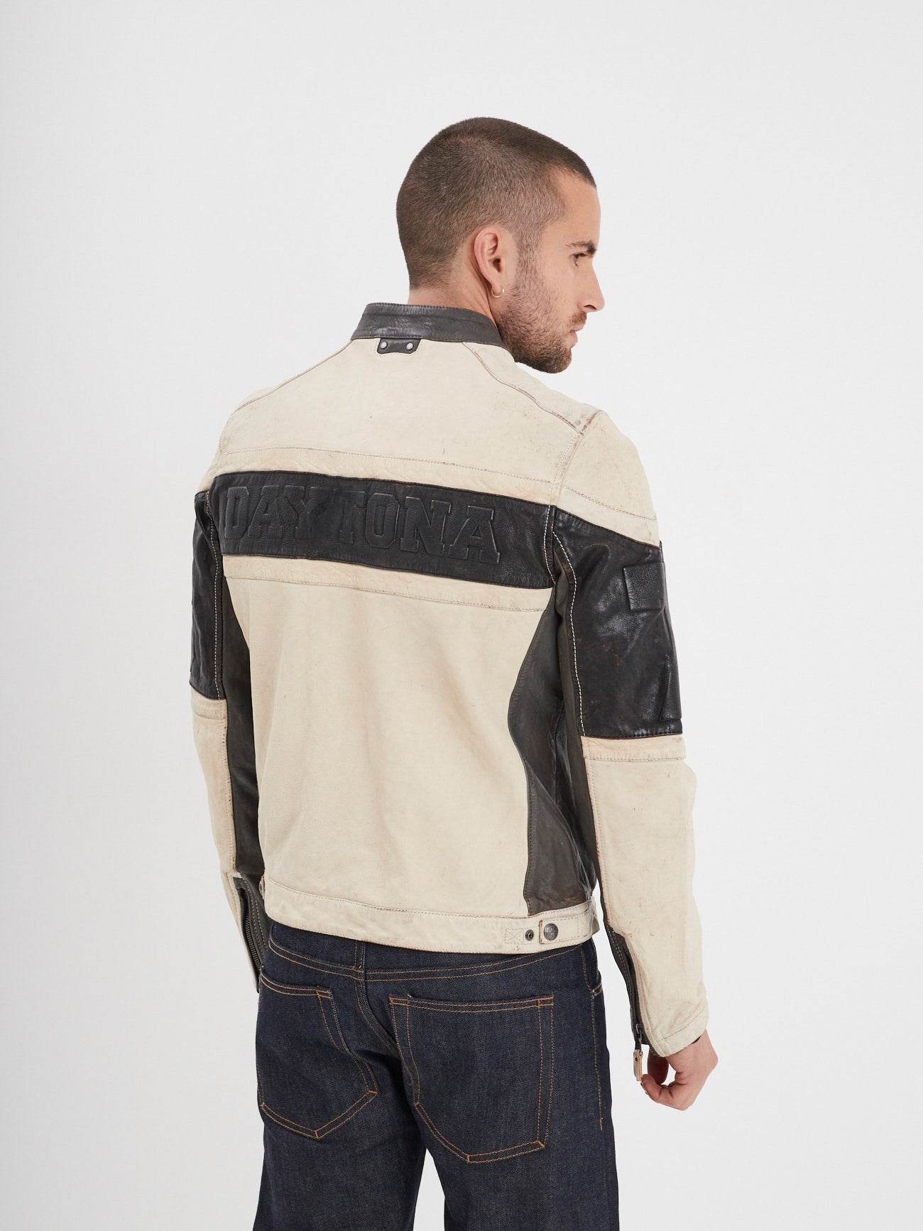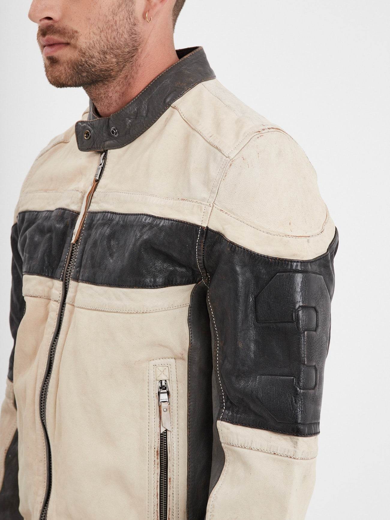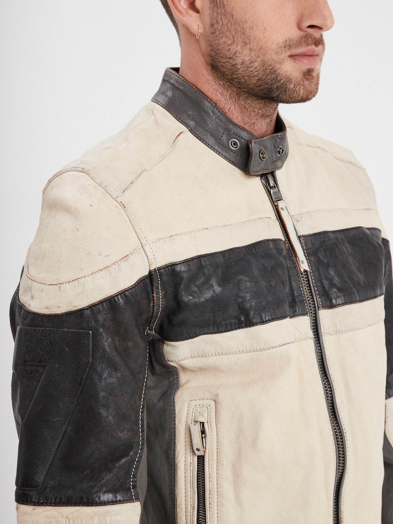 Ce blouson à l’aspect vieilli semble avoir quelques années de vécues derrière lui. Il est fabriqué dans un cuir de mouton épais qui a subit un lavage intensif aux pierres pour lui donner cette patine froissée et marquée.