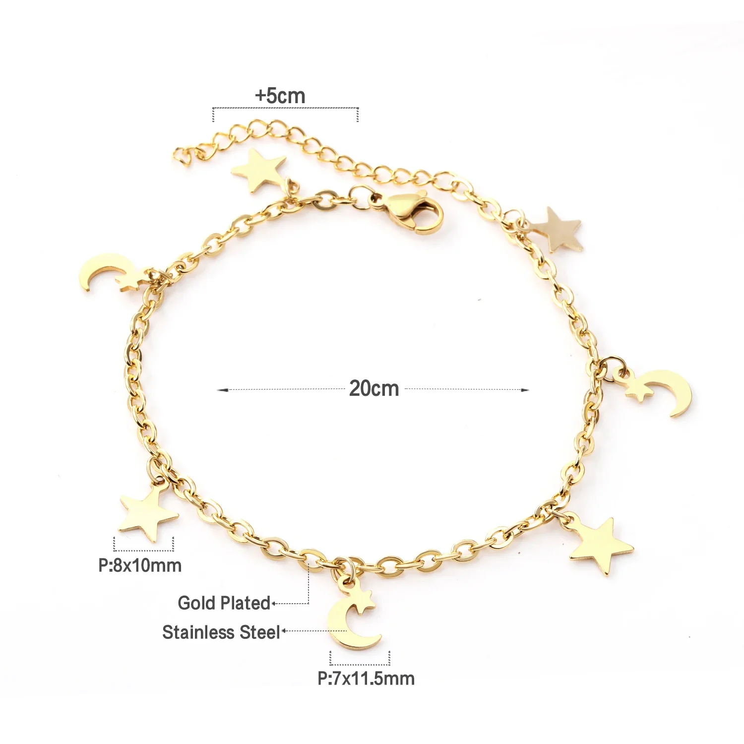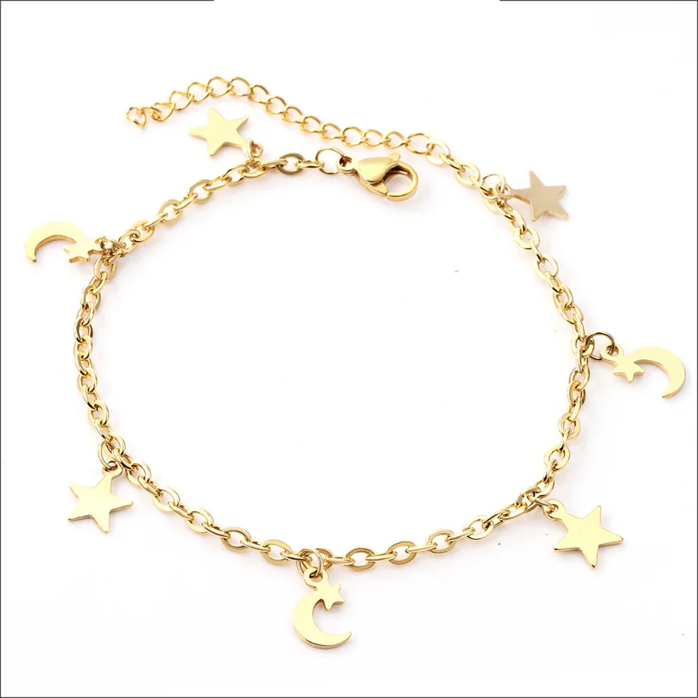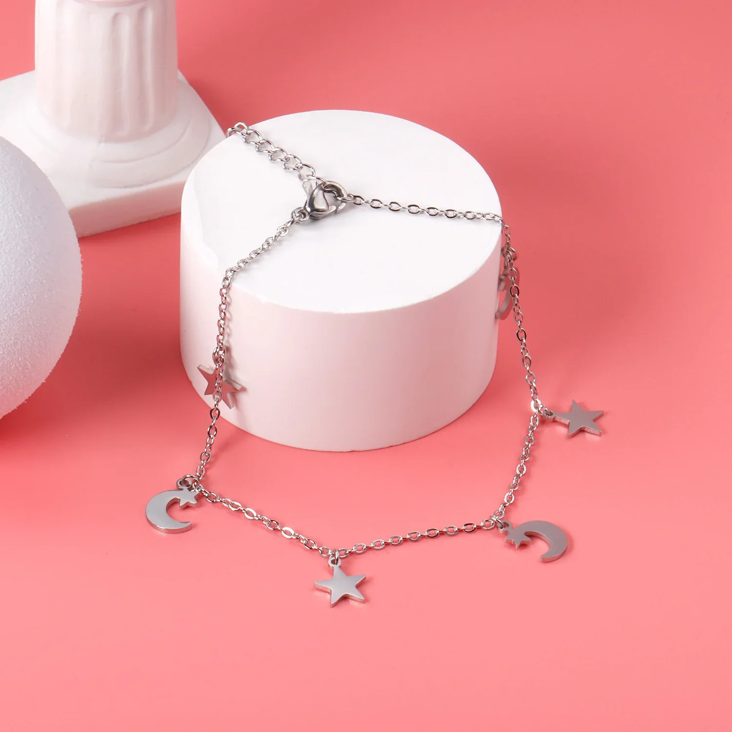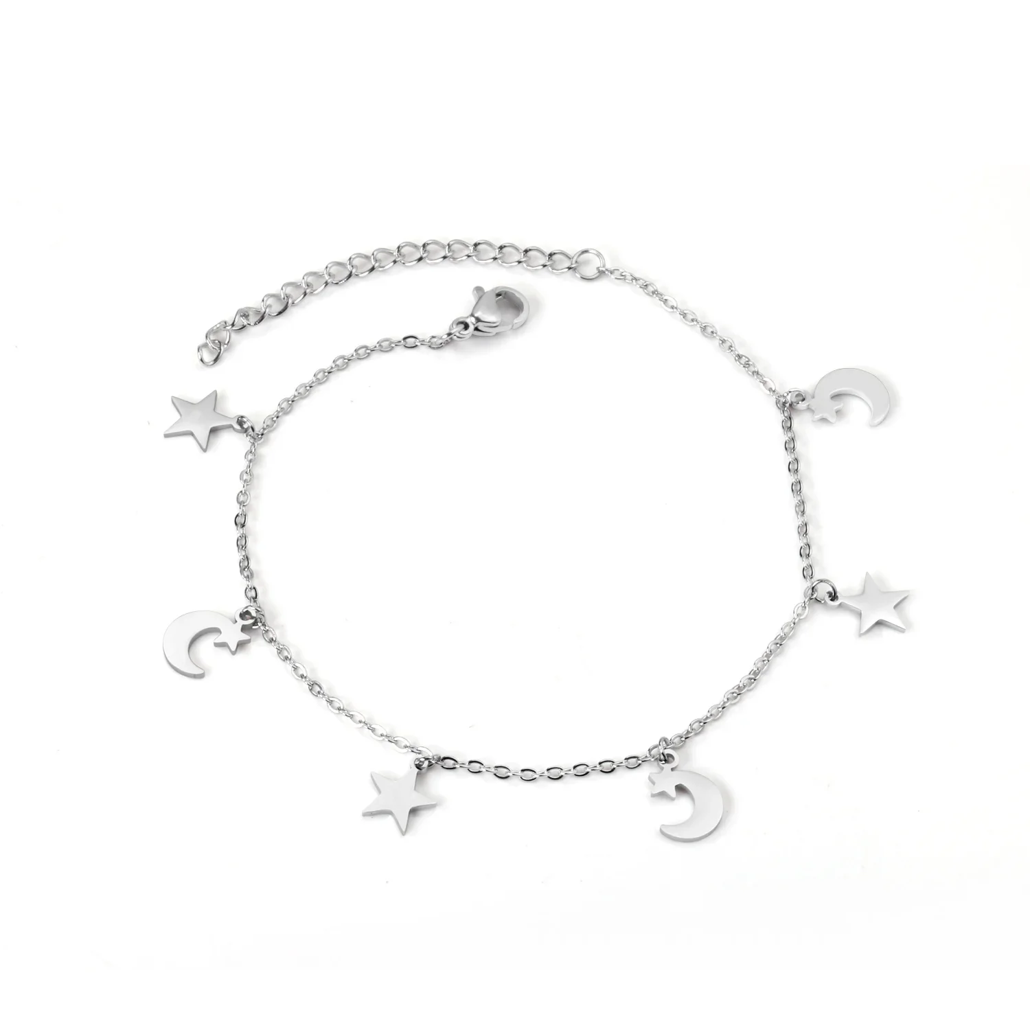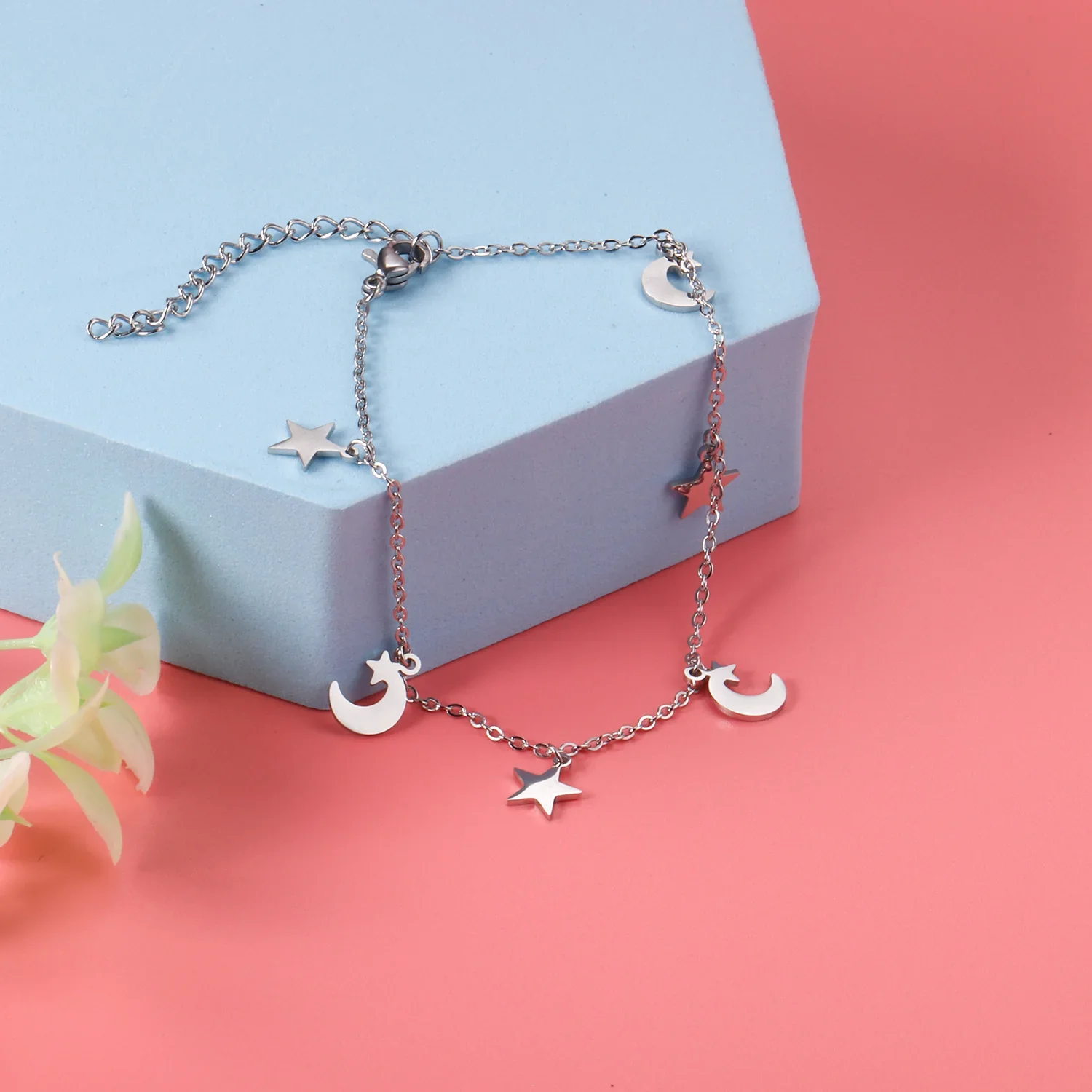 Faites scintiller vos pas avec ce bracelet lune et étoiles en acier inoxydable argenté. Des pendentifs étoiles et croissants de lune rythment la chaîne fine pour un bijou poétique, parfait au quotidien comme pour une tenue de fête. Léger, durable et hypoallergénique, il résiste à l’oxydation et garde son éclat longtemps.