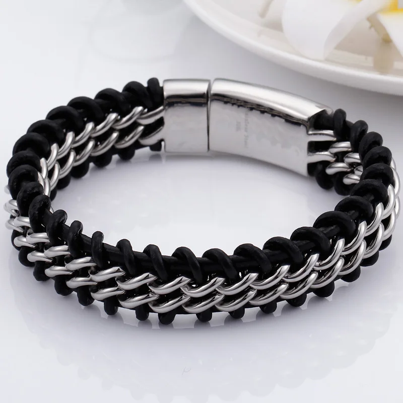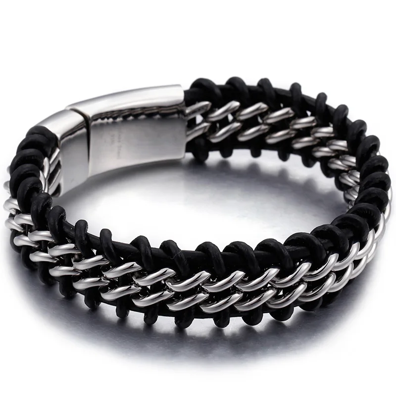 Le tour de poignet en cowhide est souple et durable ; la chaîne stainless steel (finition or ou argent selon variante) résiste à l’usure du quotidien. Le fermoir boîte à languette se verrouille d’un clic pour une tenue sûre du matin au soir.
