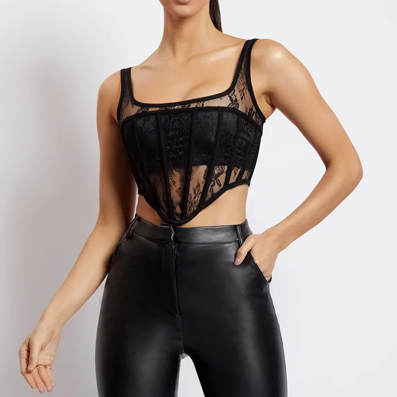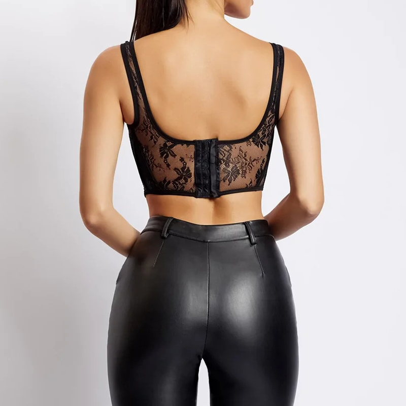 Tombez sous le charme de ce bustier noir en dentelle transparente