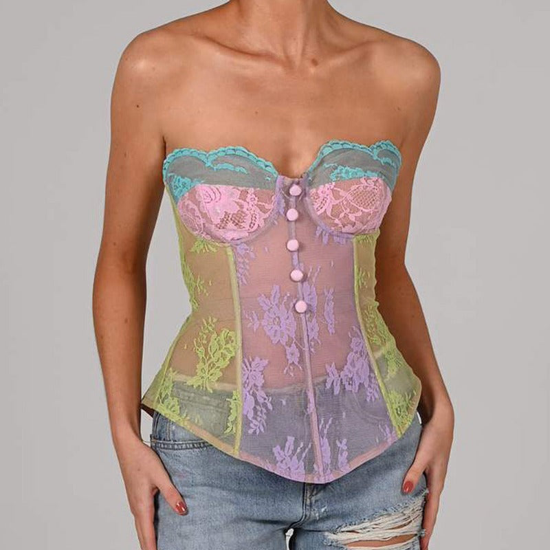 Top bustier Effet transparent Design floral Zip arrière Découvrez ce top bustier multicolore Apportez une touche de couleur à votre look avec ce top bustier multicolore. Vous apprécierez particulièrement sa rangée de boutons frontale, son effet transparent et son design floral qui améliore son apparence. Un zip exposé à l’arrière facilite son enfilage.