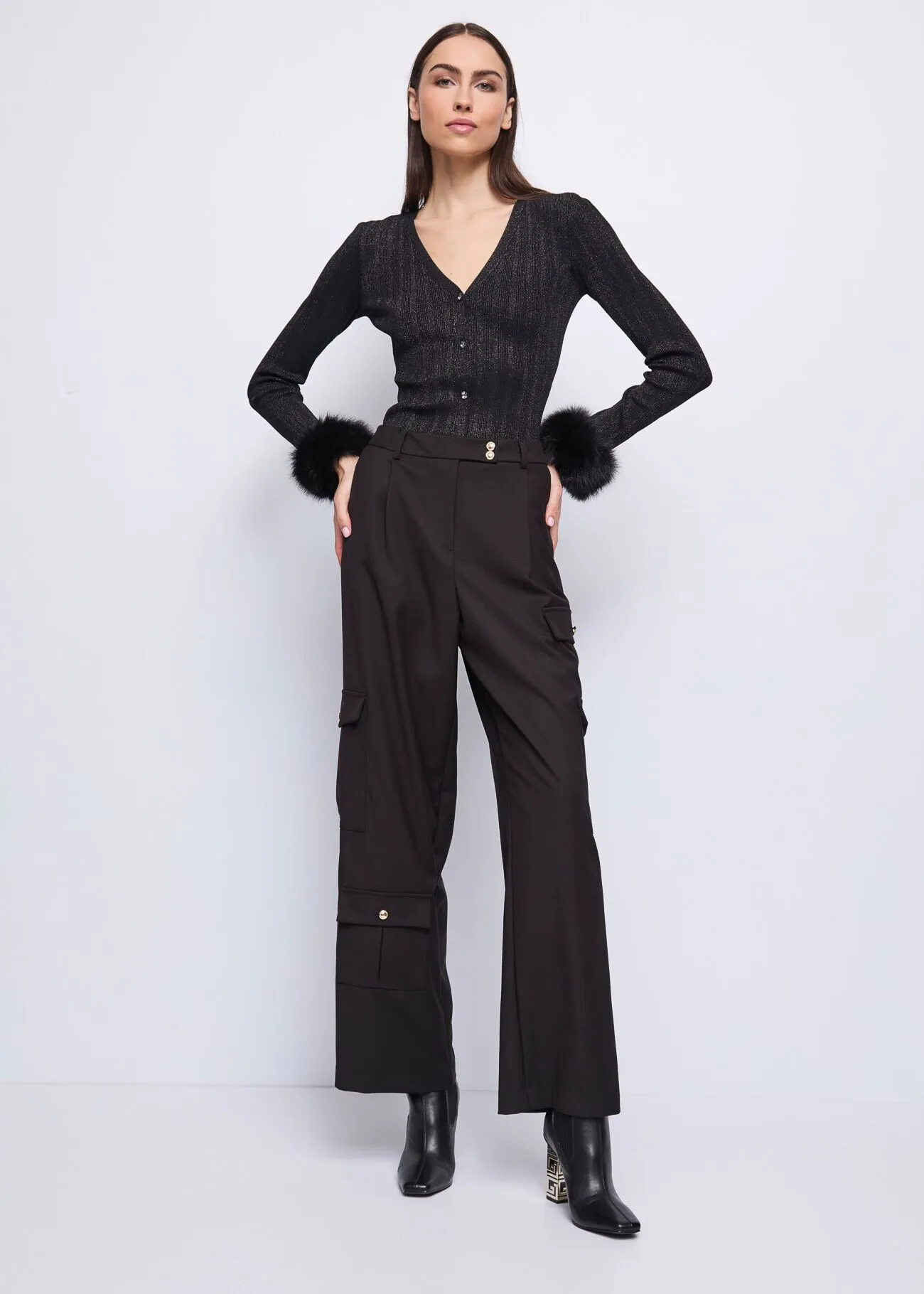 Associé à un pantalon cargo et à des bottes à talons de marque, le cardigan en lurex crée un look sophistiqué et est parfait pour un brunch glamour ou une soirée
