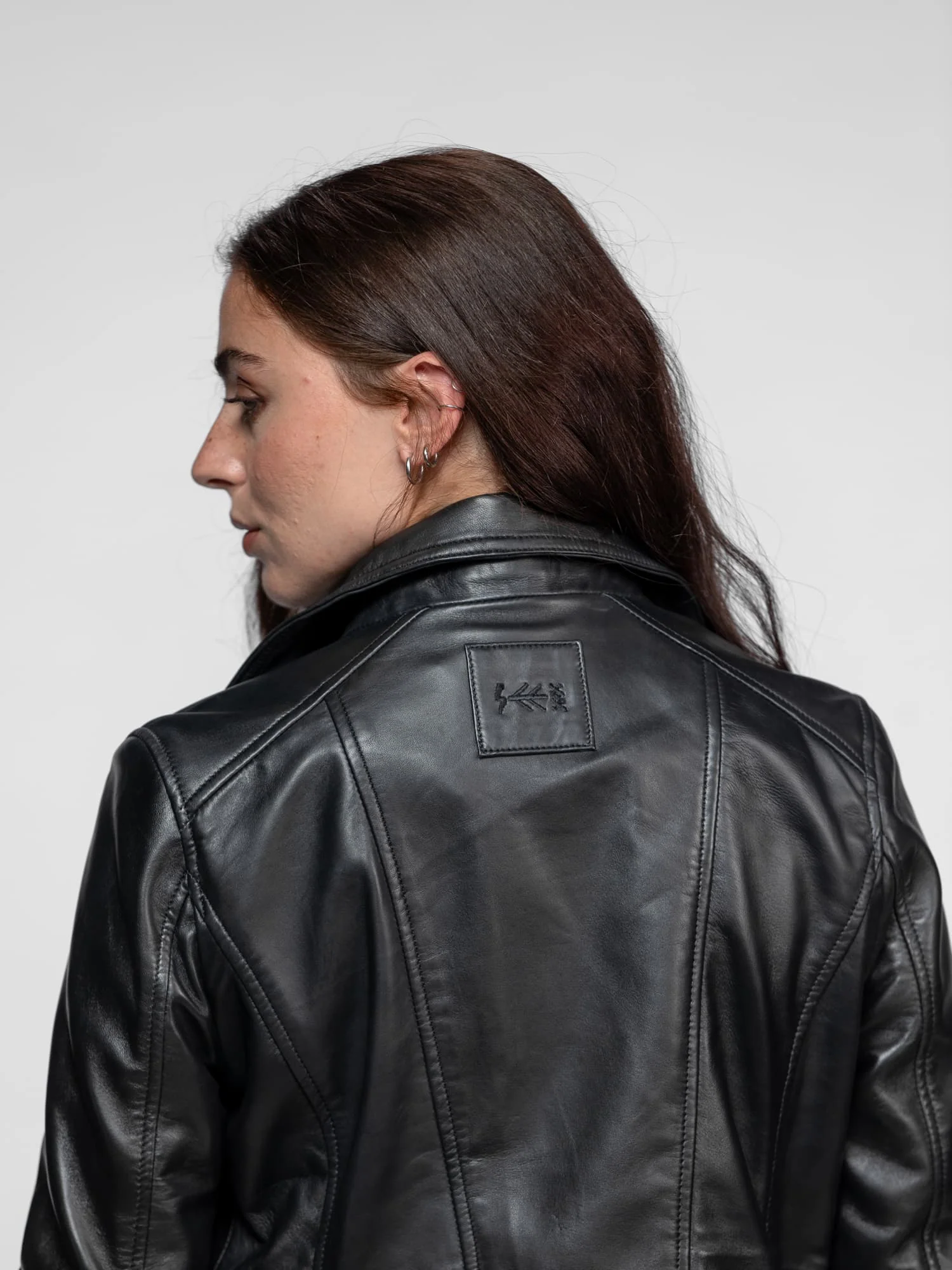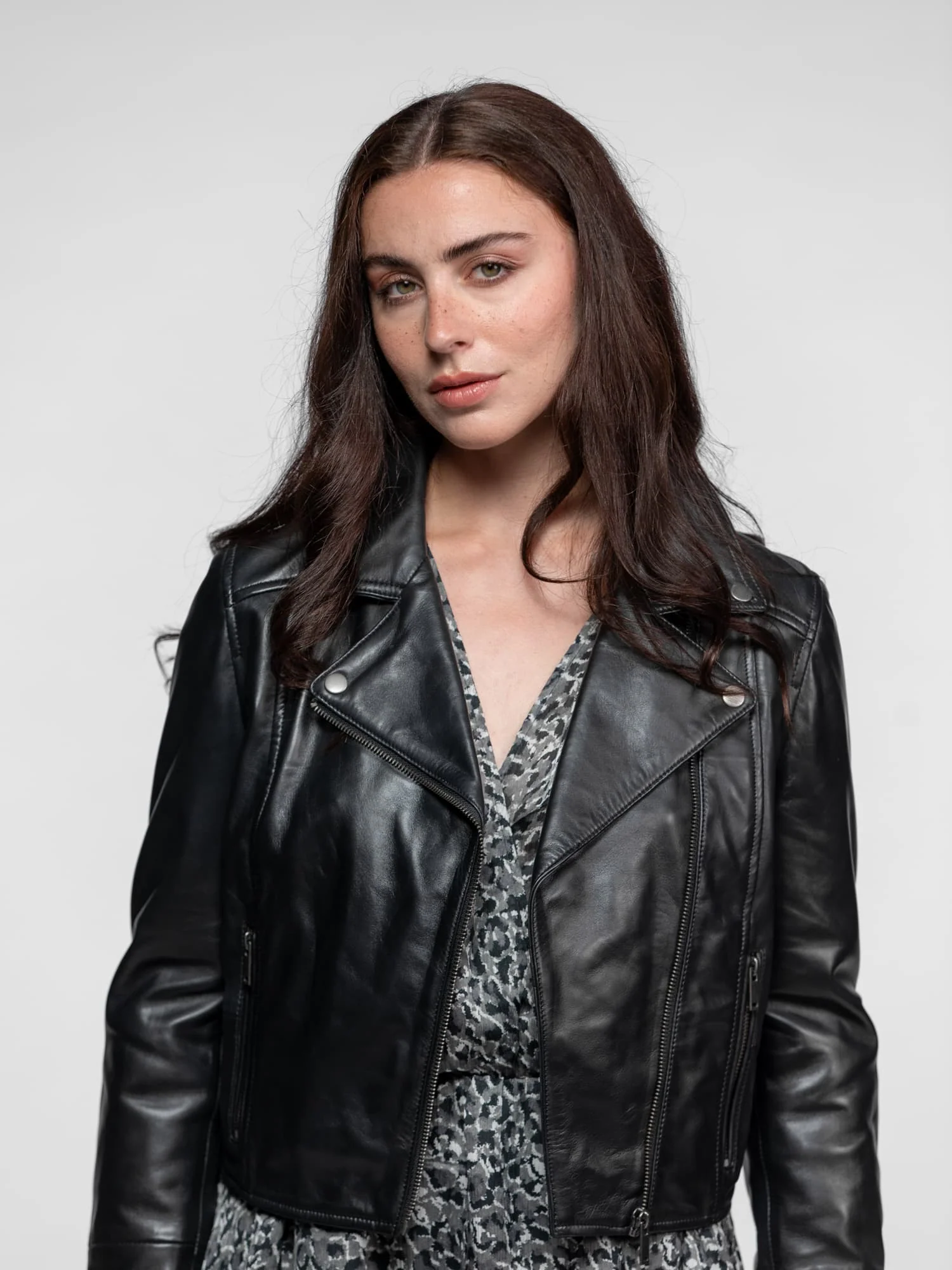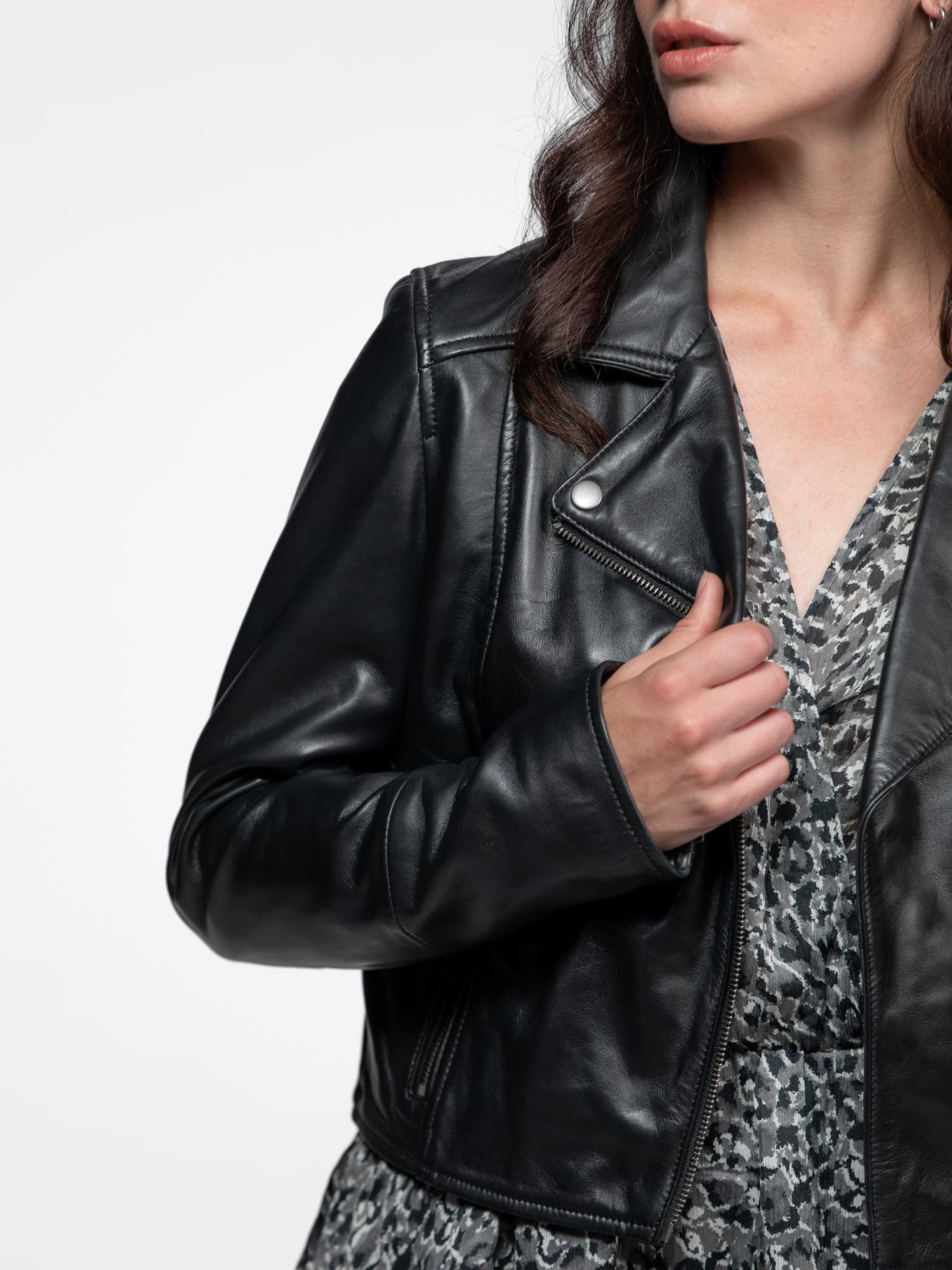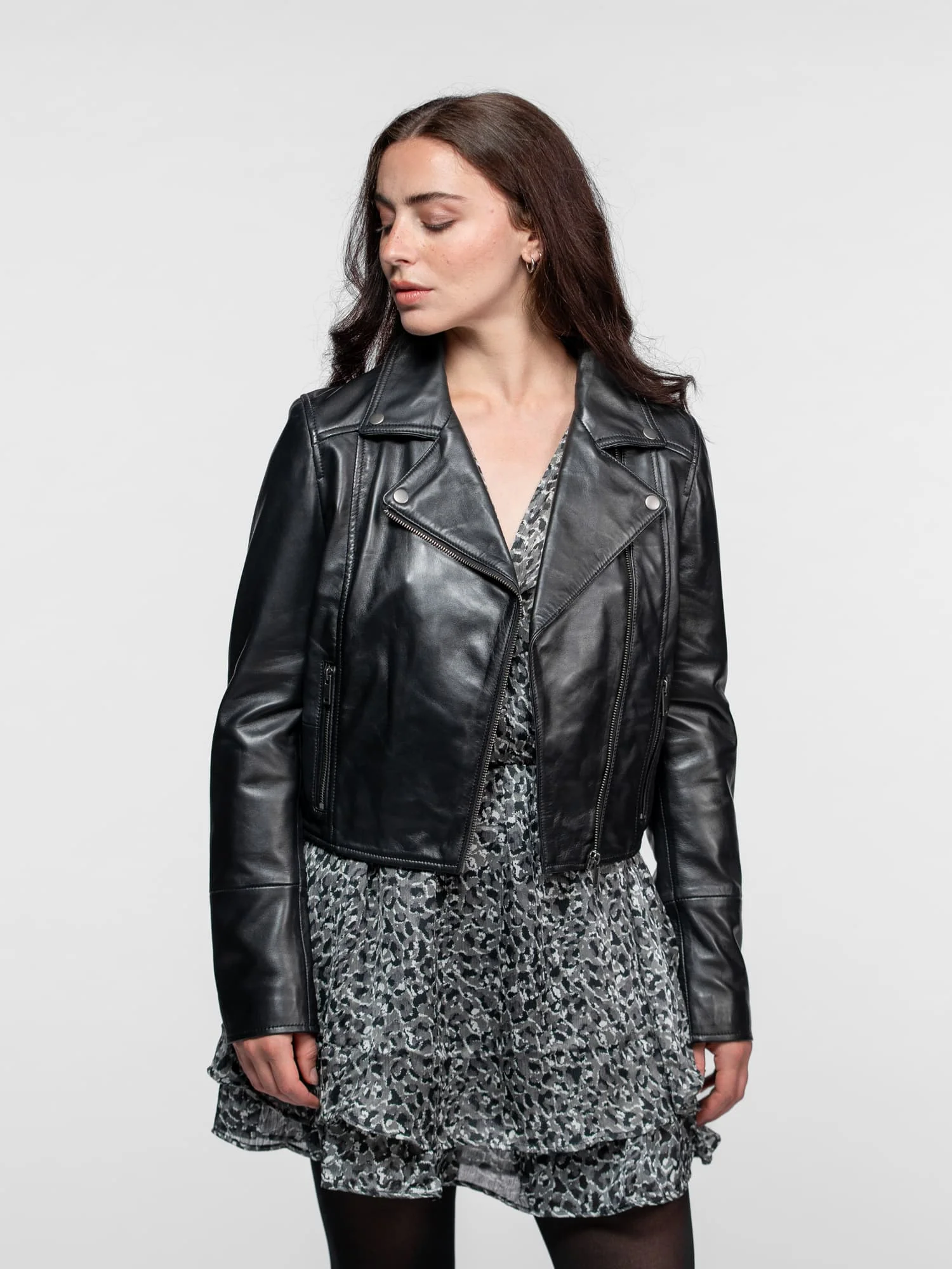 Réalisé en cuir de mouton véritable, ce modèle affiche une allure rock subtile grâce à sa texture mate et son design épuré. Sa coupe courte met en valeur la taille et s’adapte parfaitement aux tenues du quotidien comme aux looks plus habillés.