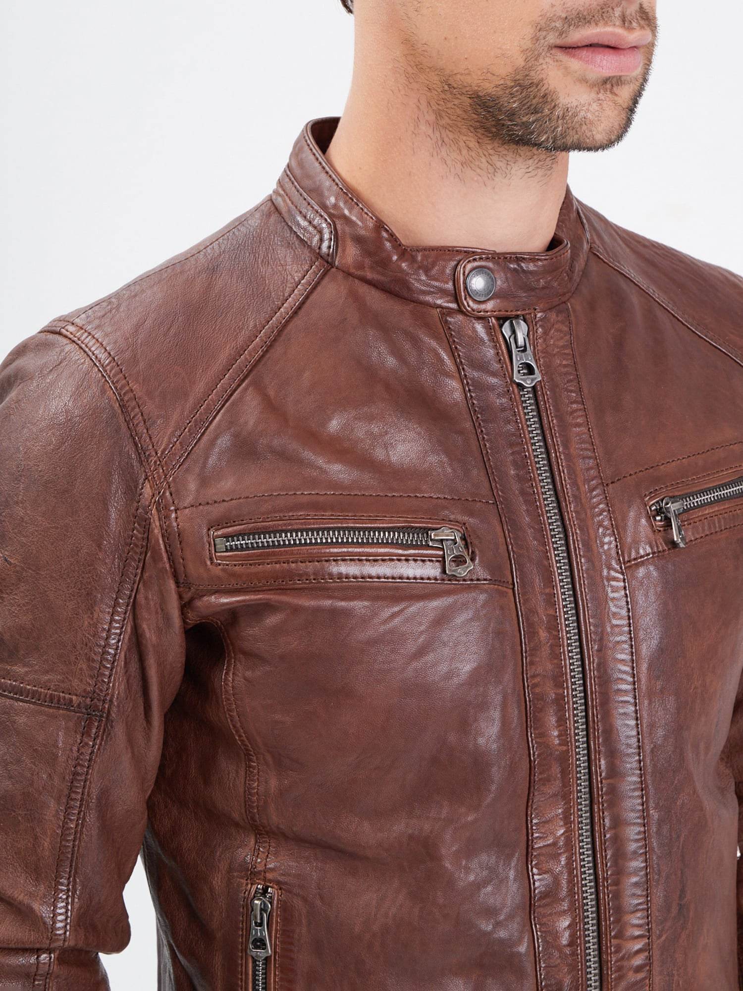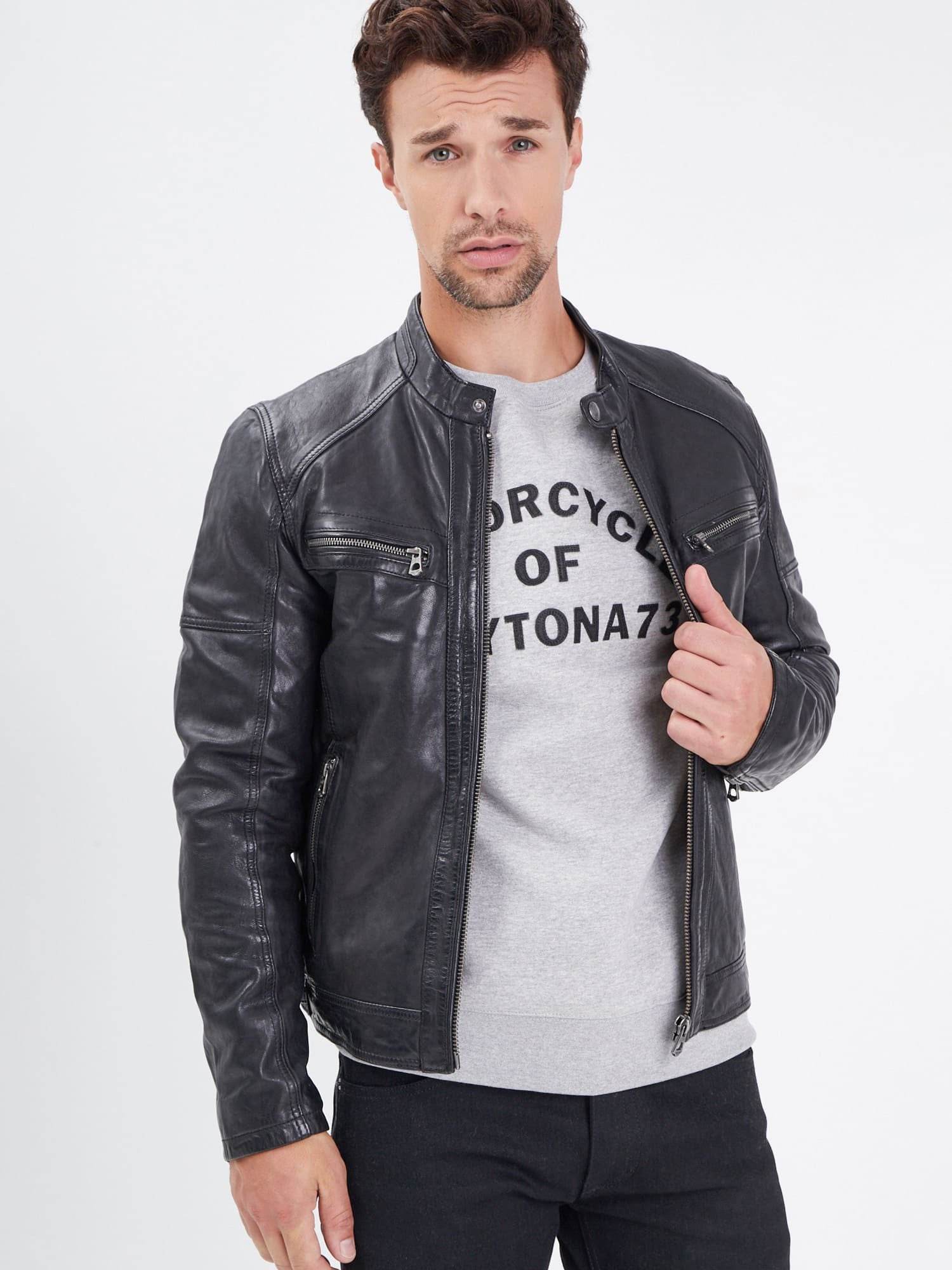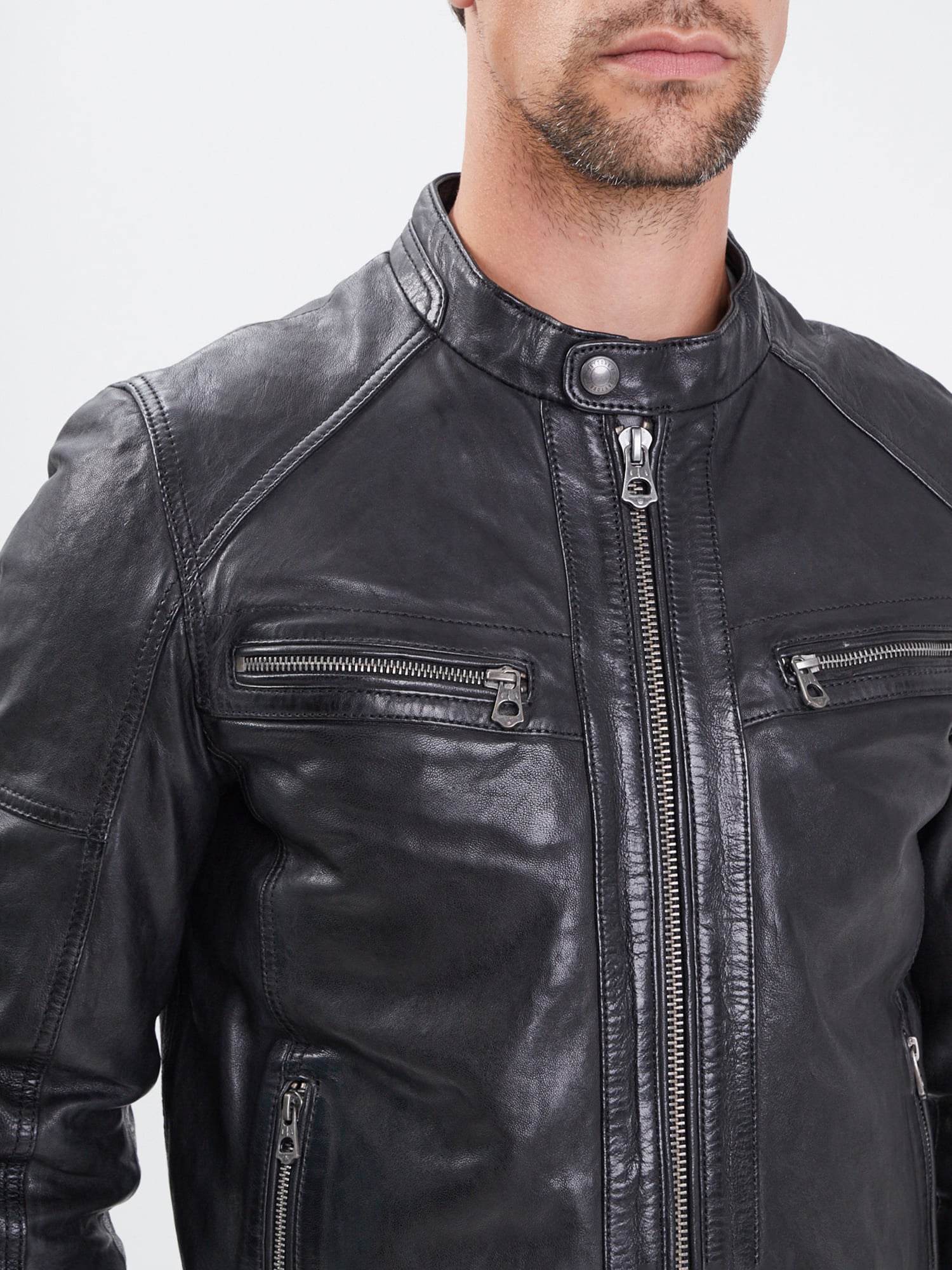 Ce blouson à col motard est fabriqué dans un cuir d’agneau lavé avec des nuances de couleurs. Une nouvelle matière pour un blouson très tendance au fit proche du corps.