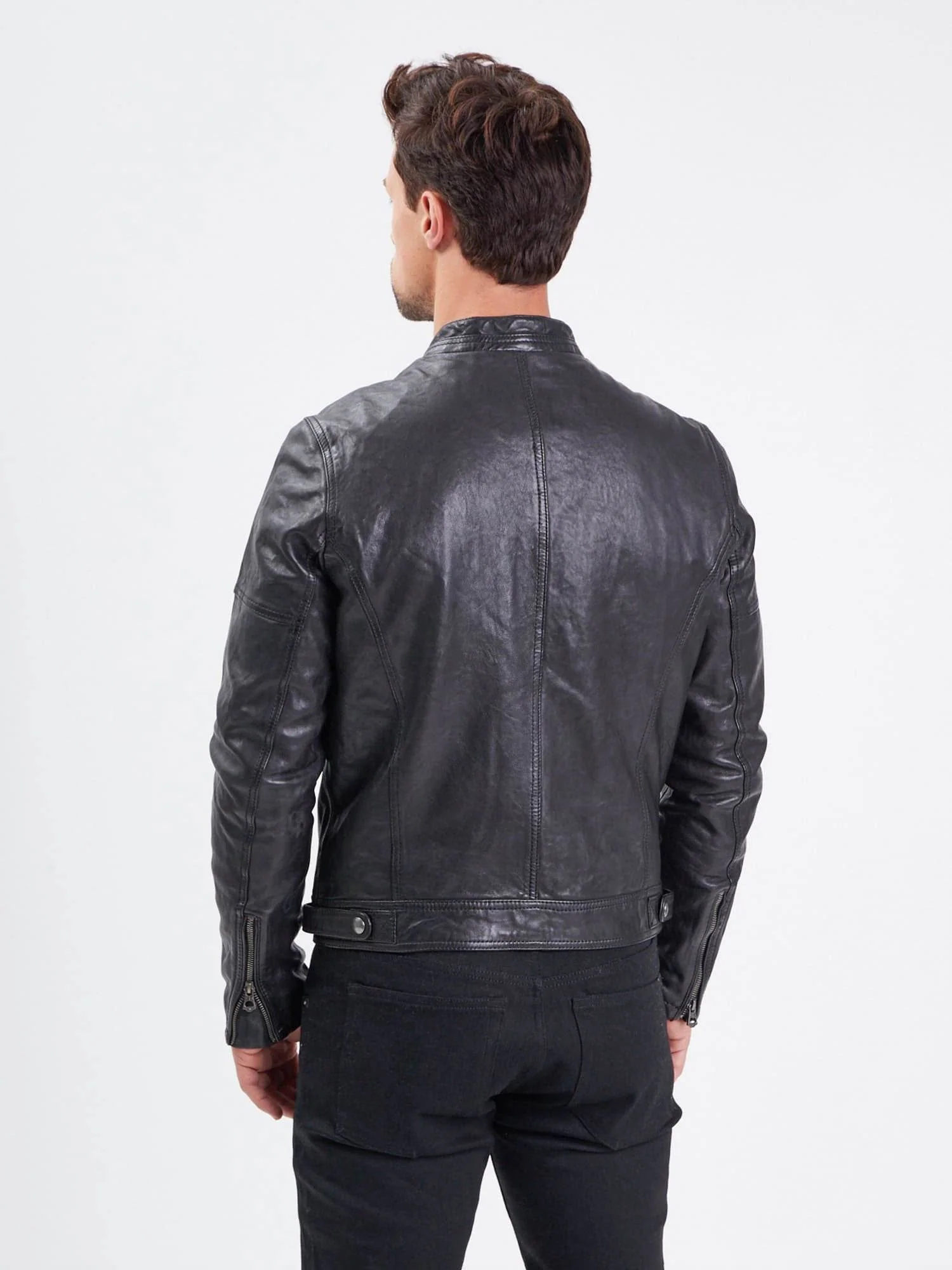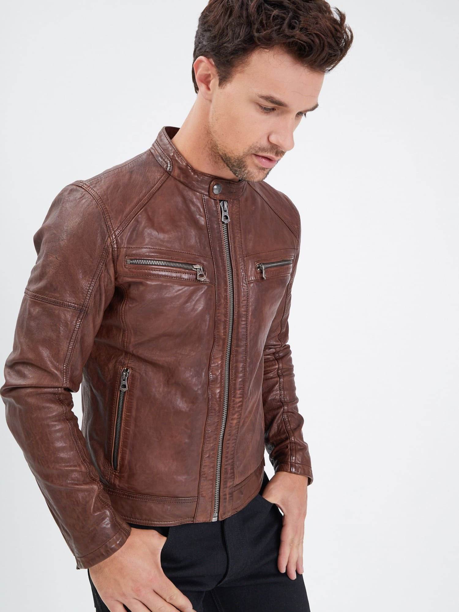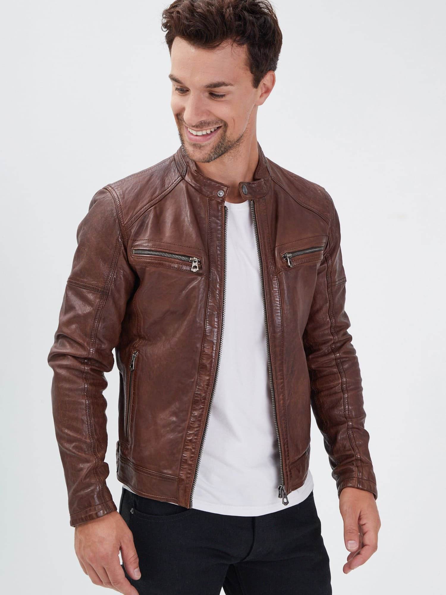 Ce blouson à col motard est fabriqué dans un cuir d’agneau lavé avec des nuances de couleurs. Une nouvelle matière pour un blouson très tendance au fit proche du corps.