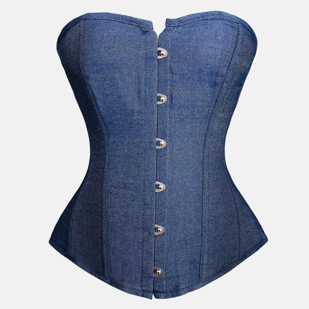Bustier corset Laçage croisé Fermeture busque métallique Optez pour ce bustier corset en jean Portez ce bustier et affichez une silhouette affinée avec un look contemporain. Ce corset en jean avec une fermeture busque métallique et un laçage croisé au dos se mariera facilement et sublimera agréablement vos courbes.