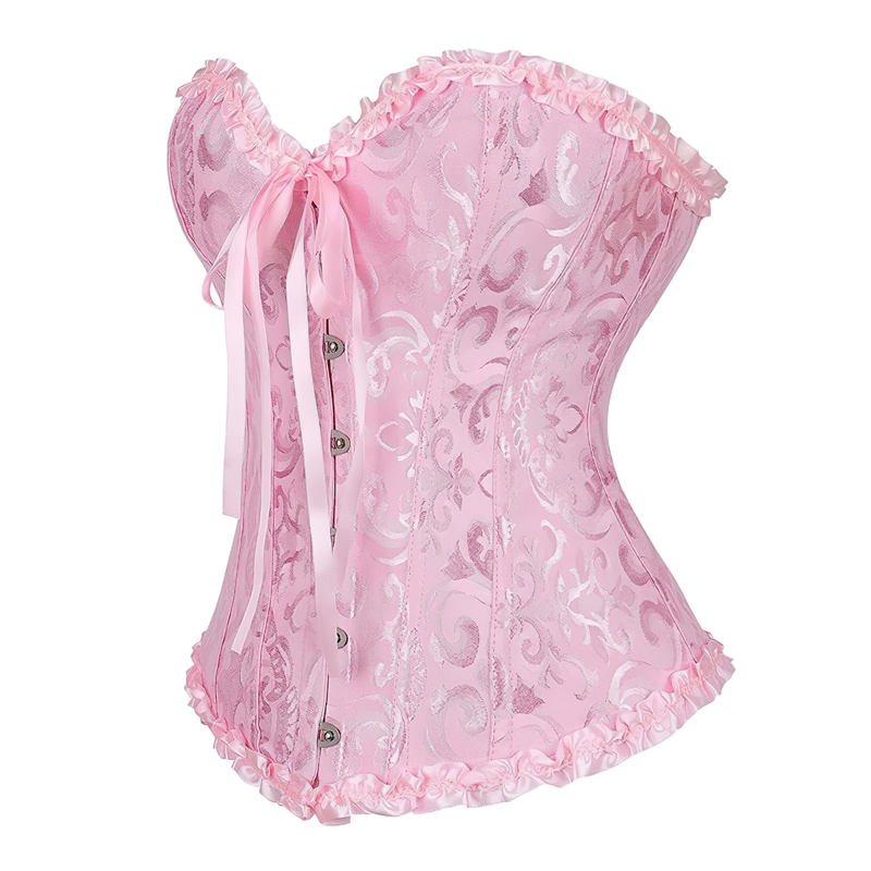 Ce corset rose à lacets mettra en valeur votre silhouette en créant une taille de guêpe parfaite. Orné finement d’un motif floral et embelli d’un nœud sur le devant, il dispose d’un busc métallique et d’un laçage croisé dans le dos pour ajuster le serrage à votre convenance.