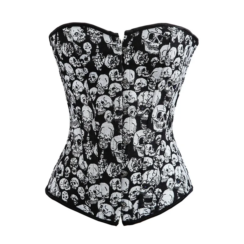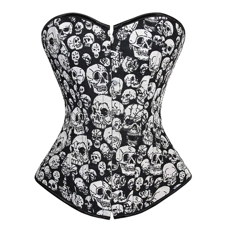 Affirmez votre style avec ce corset tête de mort noir et blanc, orné d’un imprimé crânes au grain vintage. Sa coupe overbust redessine la ligne du buste et de la taille, tandis que le busk en acier frontal et le laçage croisé au dos offrent un maintien précis. Parfait pour look gothique, burlesque, steampunk ou soirée d’Halloween, il se porte seul, sur une chemise ou par-dessus une robe pour un contraste théâtral.