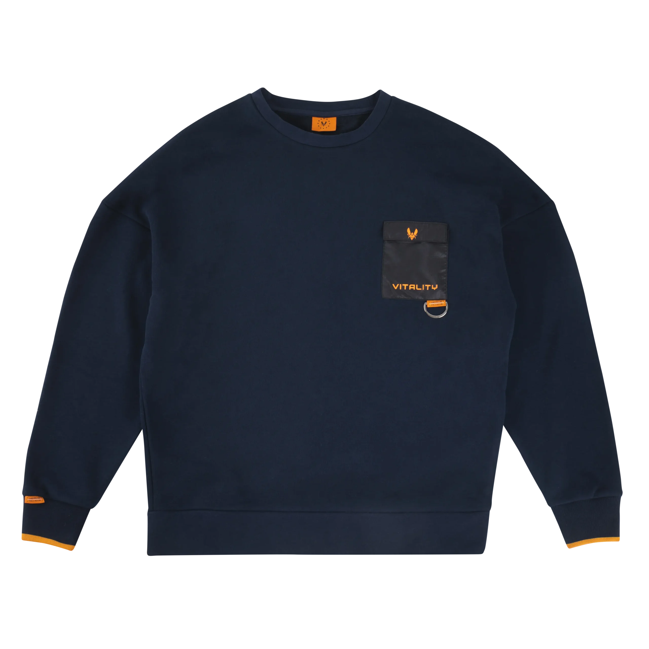 Crewneck Watch Us bleu foncé : crewneck esports oversize 100 % coton, poche noire contrastée, bande orange & patch Watch Us Follow Us, style streetwear Team Vitality.