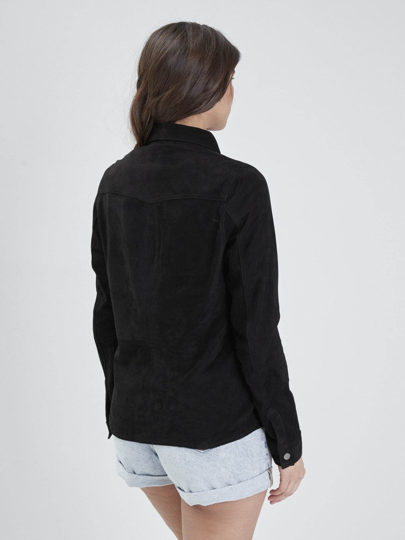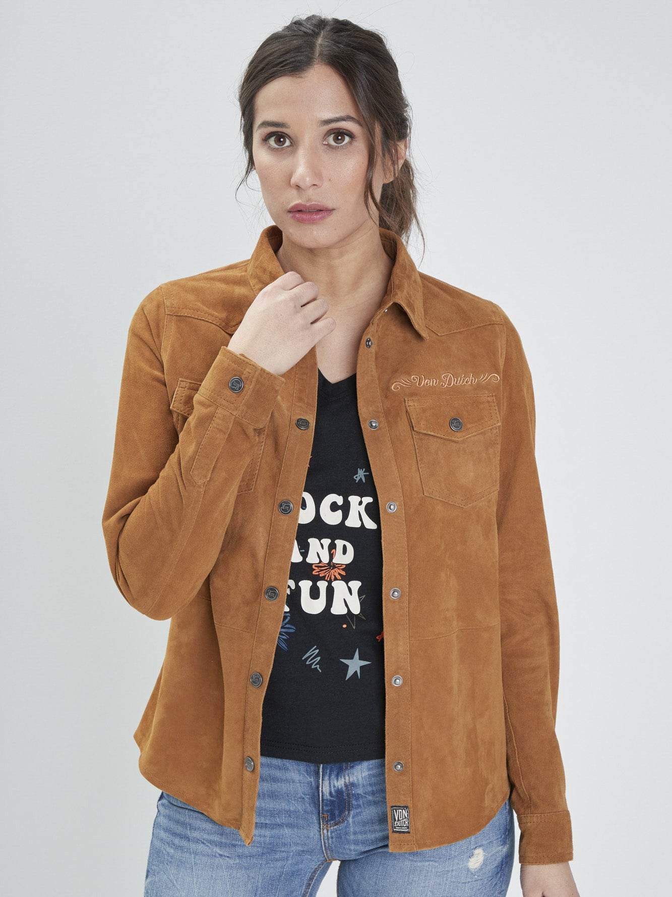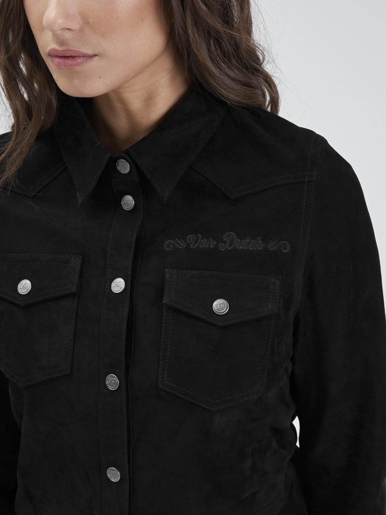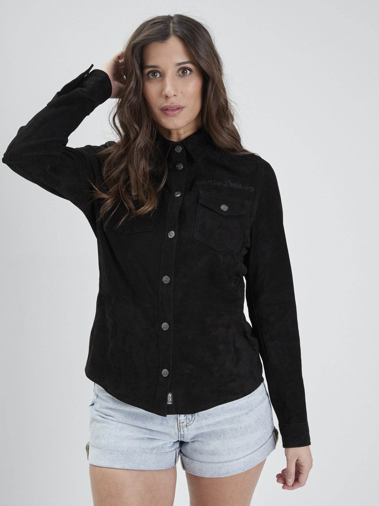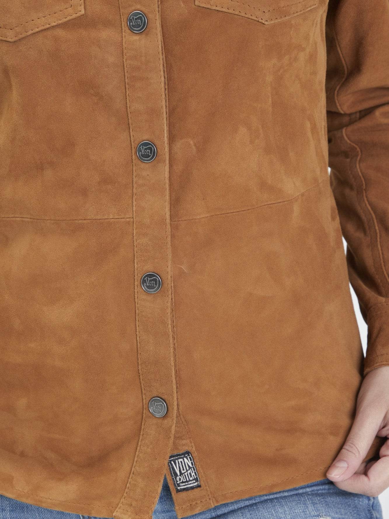 Cette chemises à boutonnière personnalisée est fabriquée dans un cuir de chèvre velours. Ce modèle à la coupe ajustée dispose d’une broderie à la poitrine reprenant le logo « Von Dutch ».