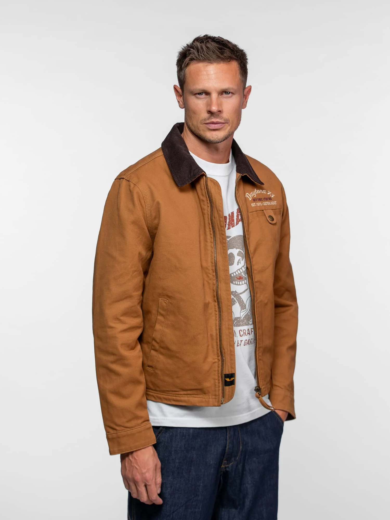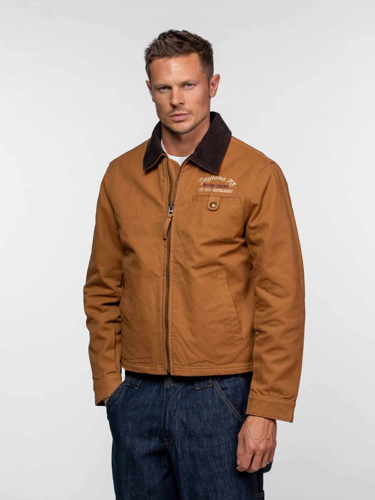 Cette veste esprit worker est fabriquée à partir d’une toile de coton canvas Turpin épaisse et robuste. Elle possède une coupe ajustée et un col chemise en velours côtelé, pour un style unique et intemporel.