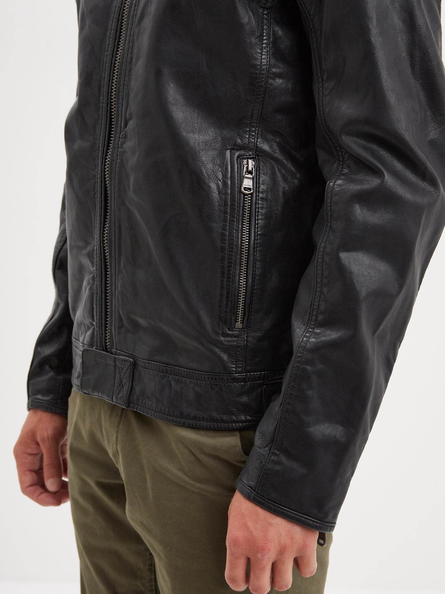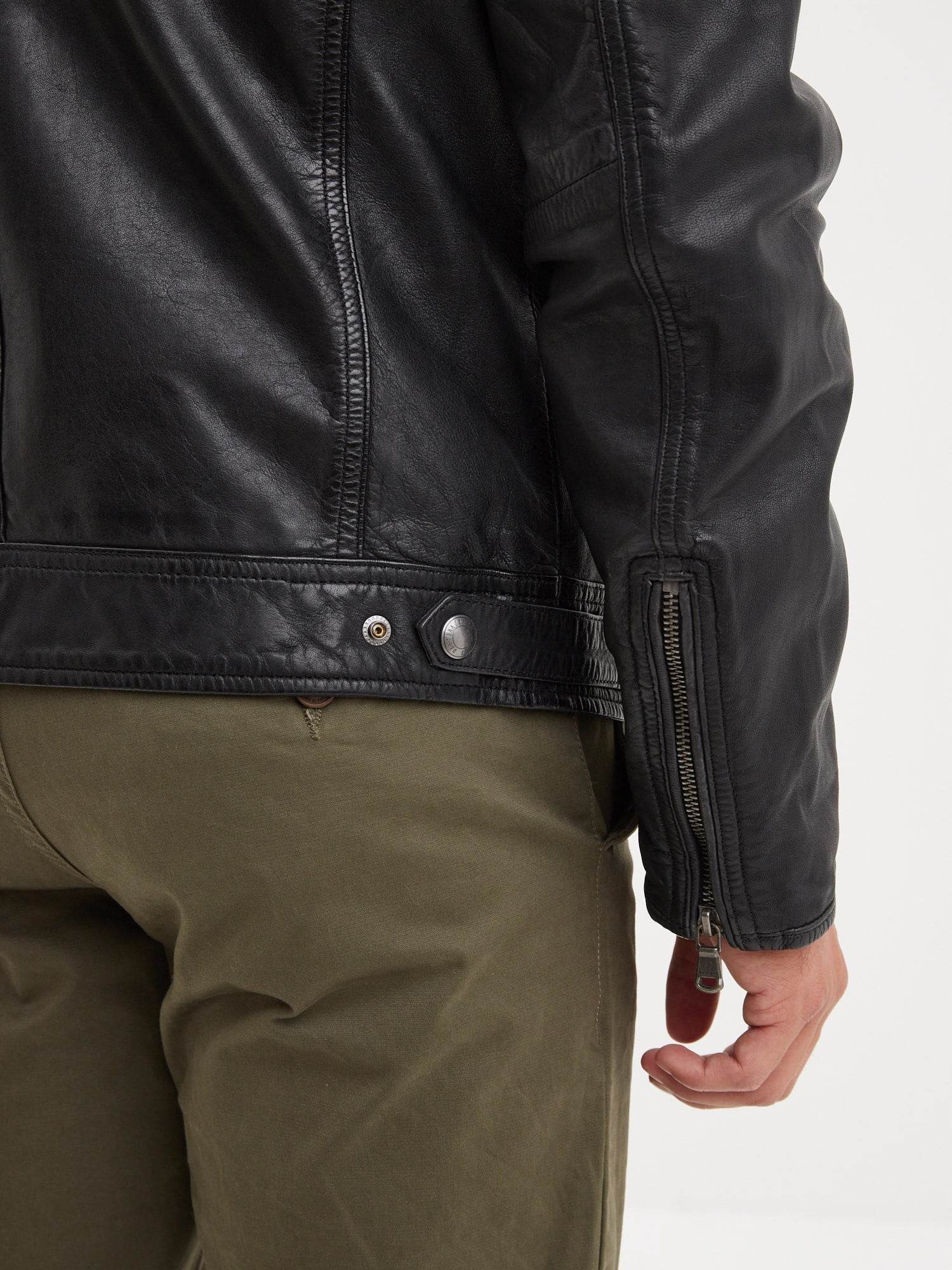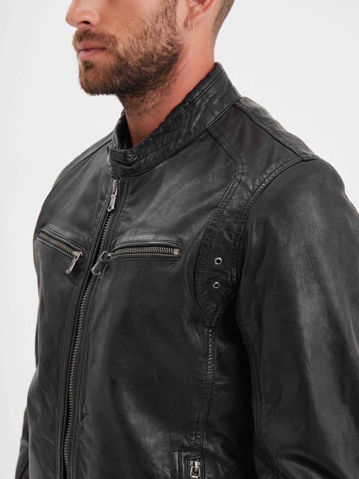 Véritable best-seller de la collection homme, le modèle Dustin se distingue par une coupe classique et un fit proche du corps. Ce blouson à col motard est fabriqué en cuir de mouton fin et souple.