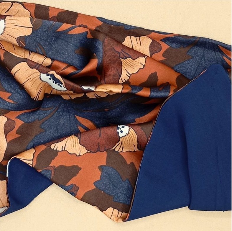 Pensée pour envelopper vos tenues d’une chaleur subtile et d’un raffinement intemporel, cette étole en soie 100 % naturelle incarne l’élégance dans sa forme la plus délicate. Son imprimé Fleurs Chaudes révèle une composition florale généreuse, où se mêlent des nuances de brun, d’orange et de beige sur un fond bleu profond. La doublure bleu marine intensifie l’ensemble, ajoutant une touche de mystère et de sophistication.