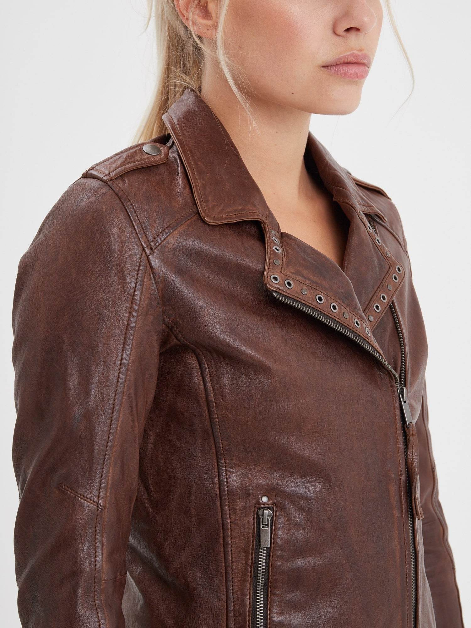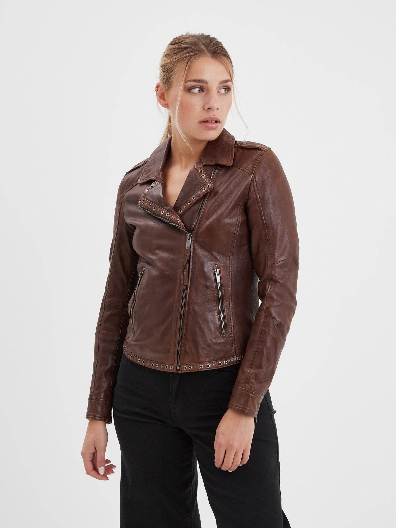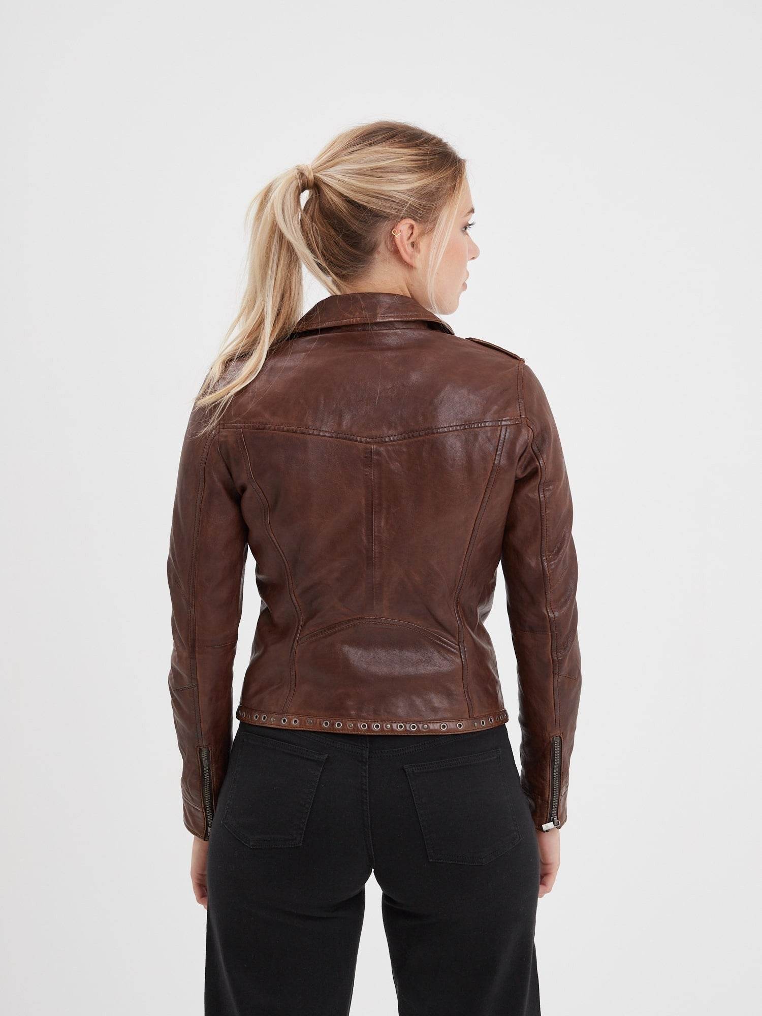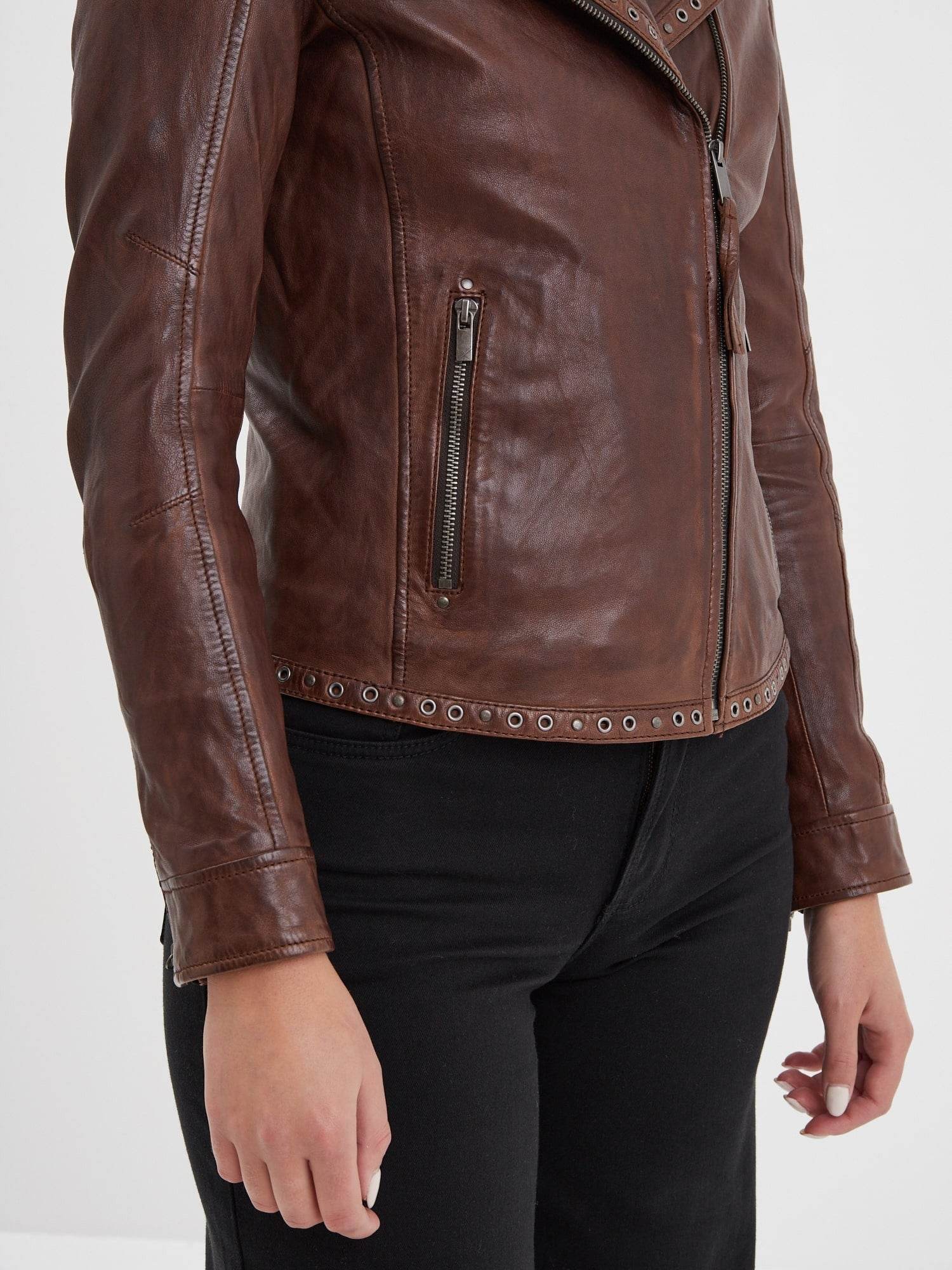 Blouson Biker en cuir d’agneau lavé style vintage avec clous décoratifs pour femme de la marque Rose Garden.