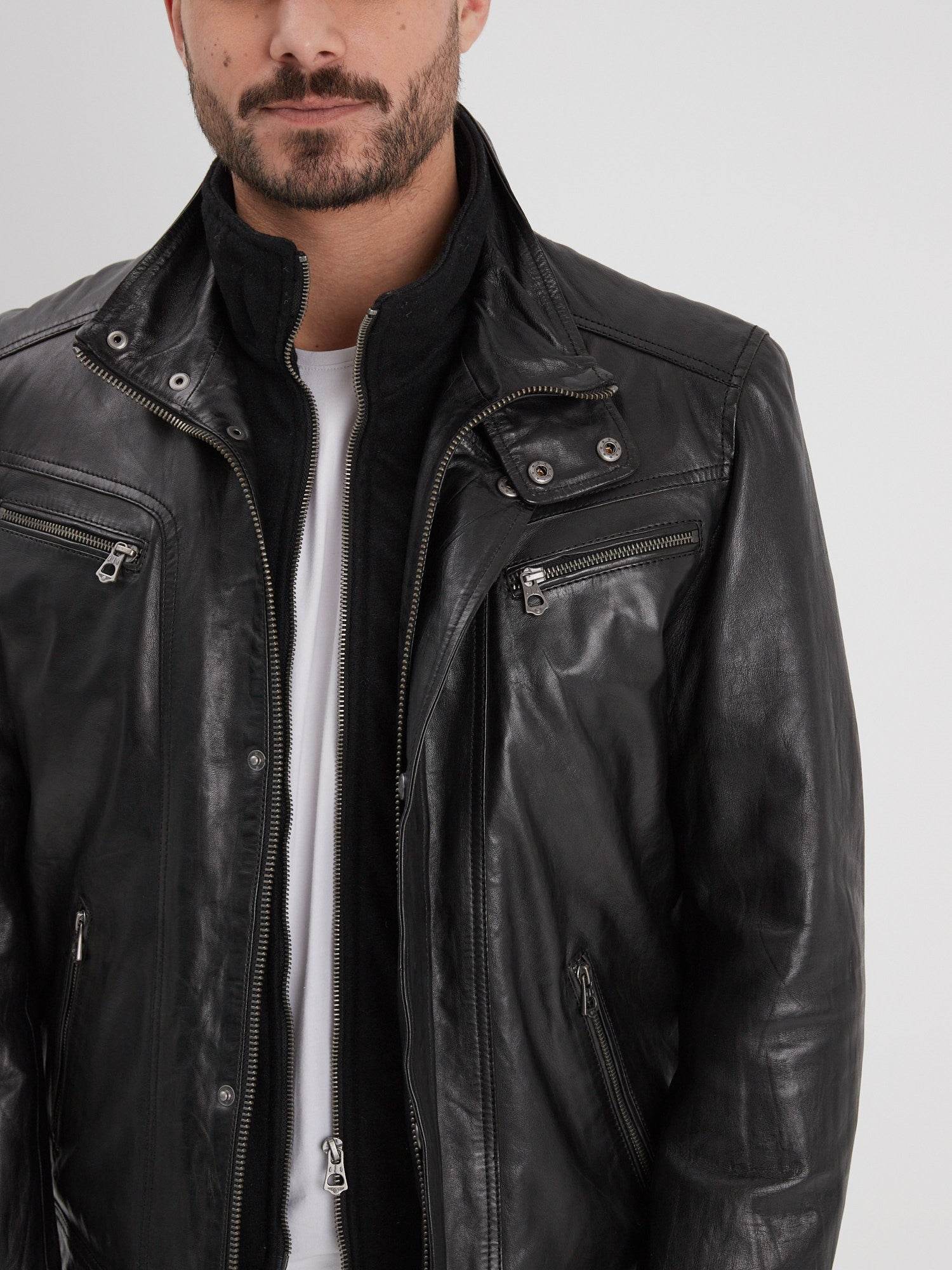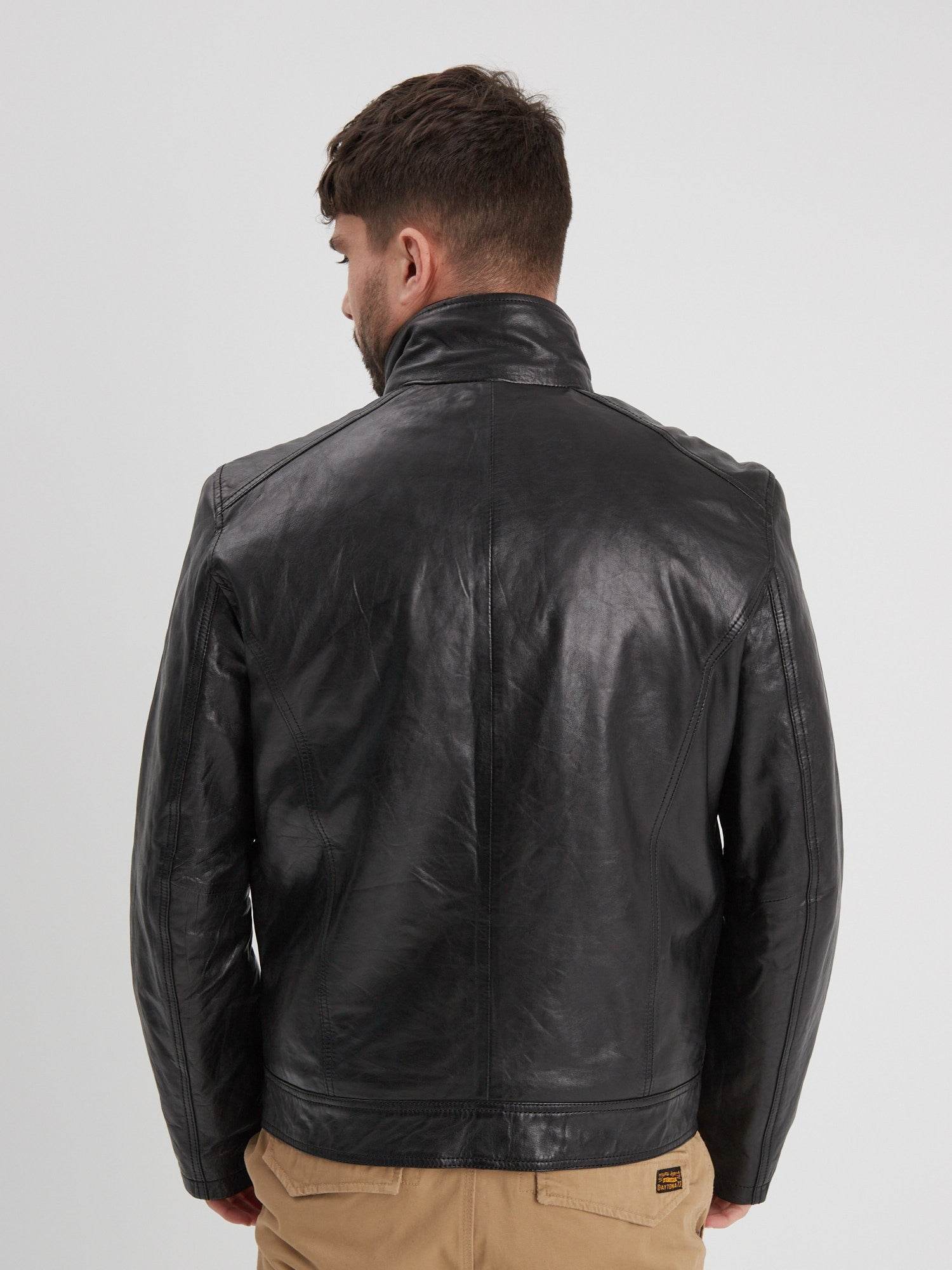 Muni d’un long col montant avec un rabat à boutons pressions, le blouson en cuir Falcon est sobre et élégant. Il vous accompagnera à la perfection lors de vos multiples sorties.