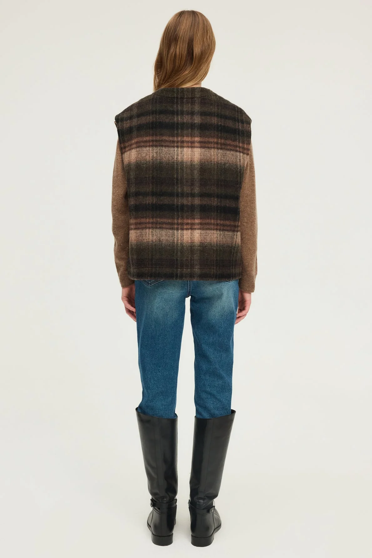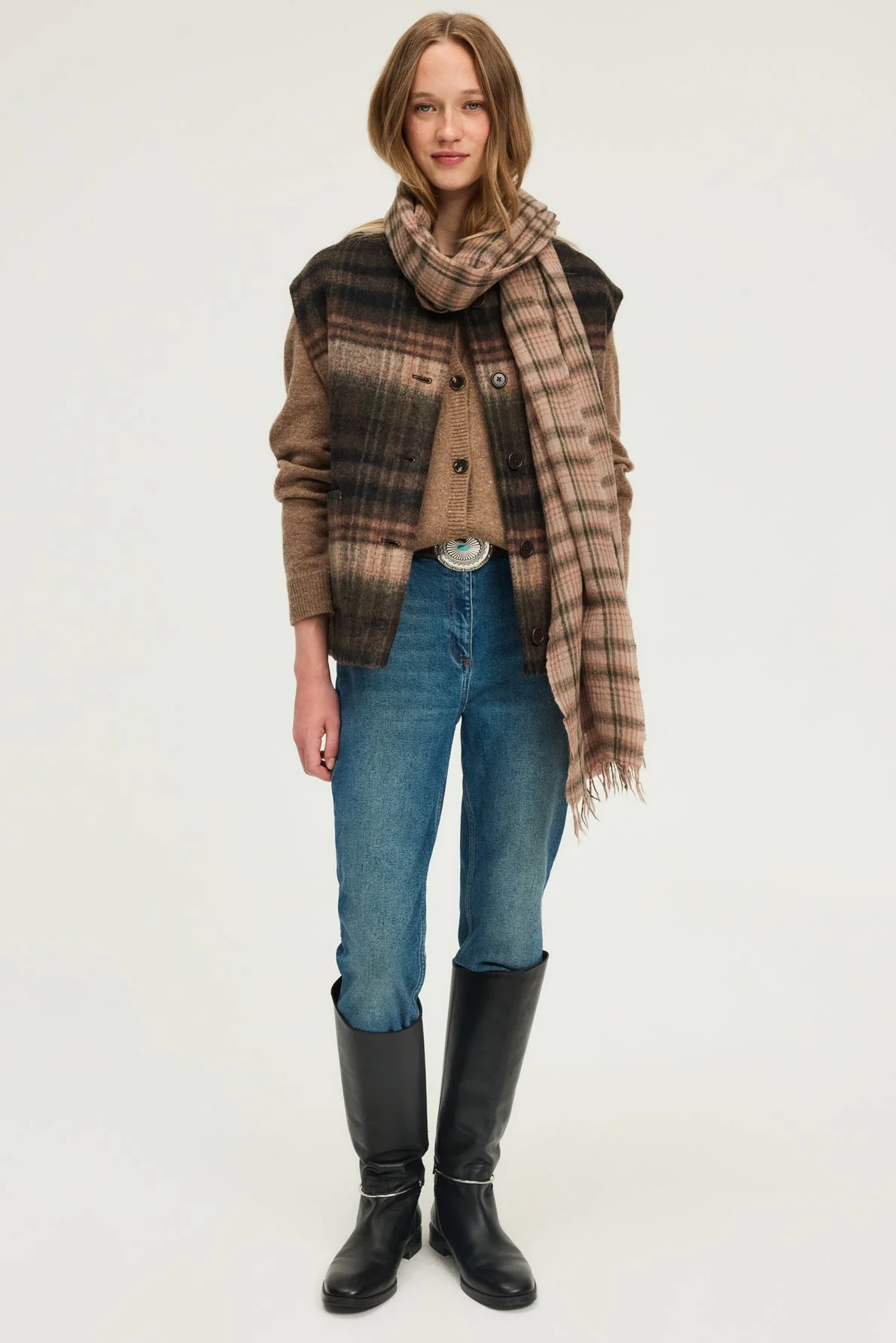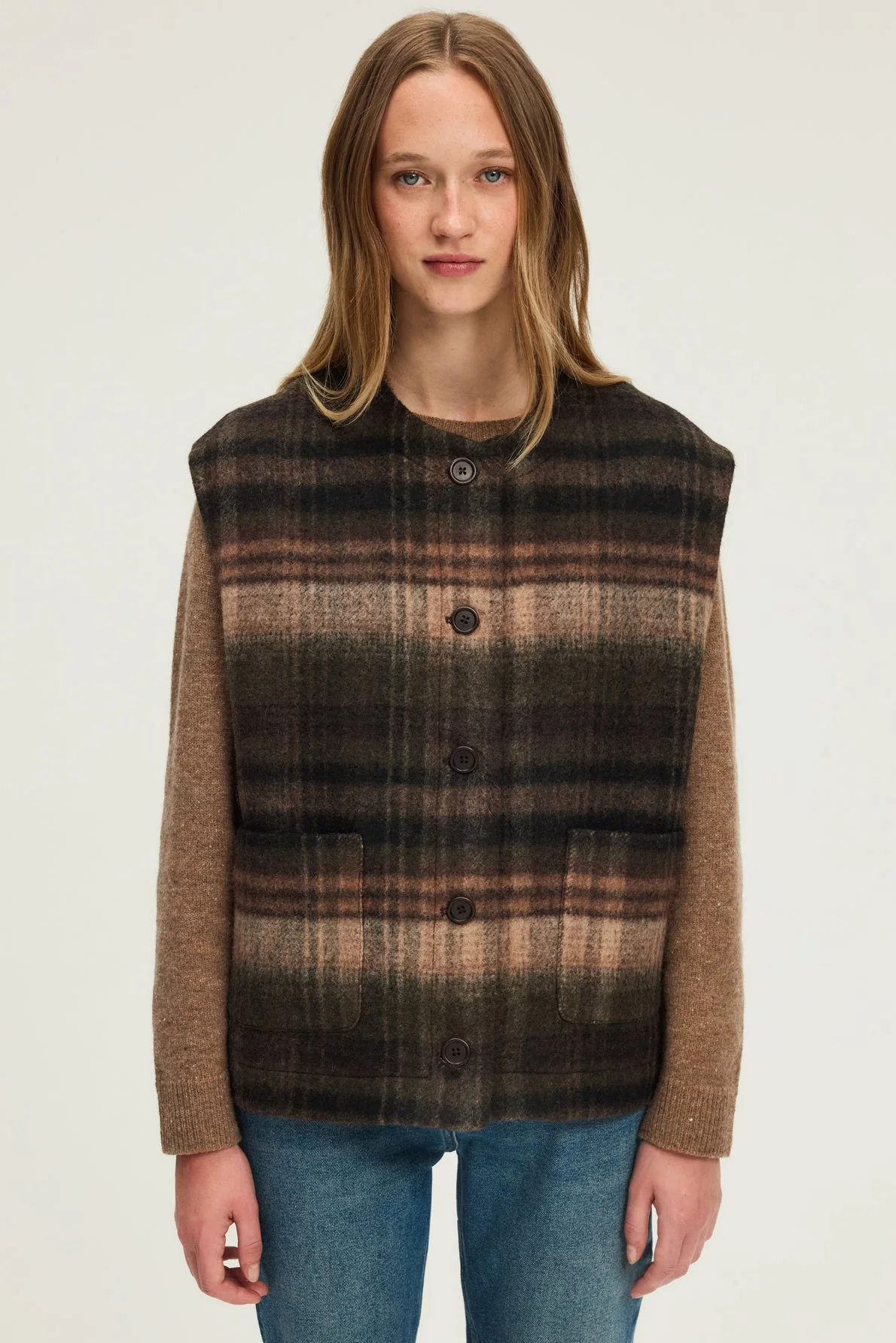 Forme droite et volume ample Motif à carreaux Veste courte Sans col Sans manche Veste fermée par des boutons ronds Grandes poches plaquées
