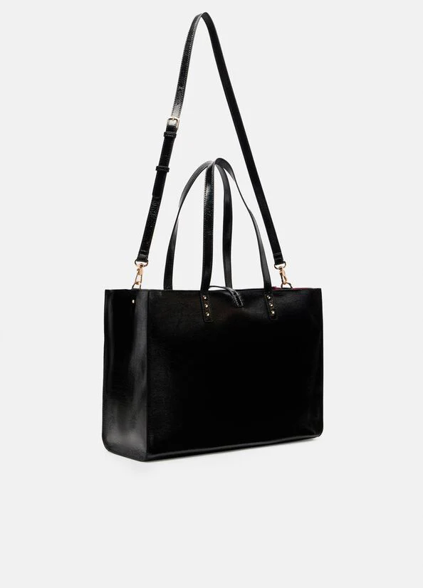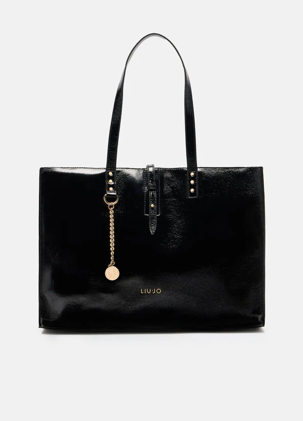 Dimensions : 40 x 15 x 29 cm Sac shopping brillant Mini clous appliqués Logo en métal Poignées confortables Bandoulière réglable et amovible Charm logotypé avec chaîne Fermeture éclair avec sangle Doublure contrastée L’accessoire peut aussi être porté à l’épaule et/ou en bandoulière