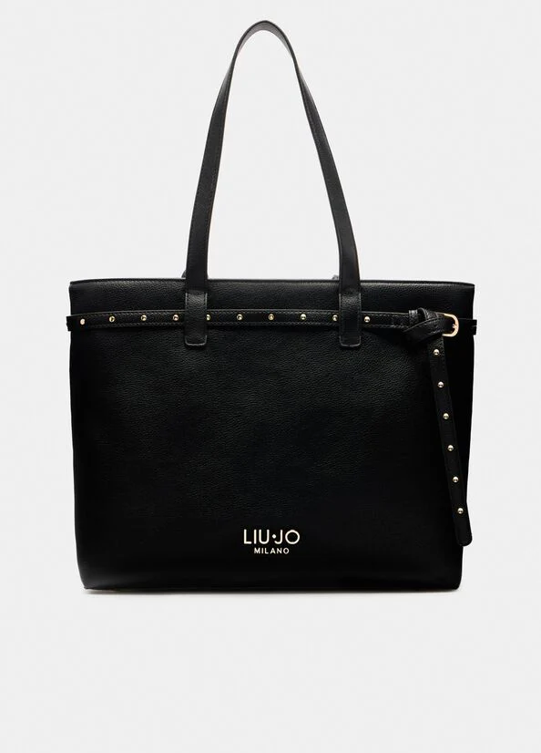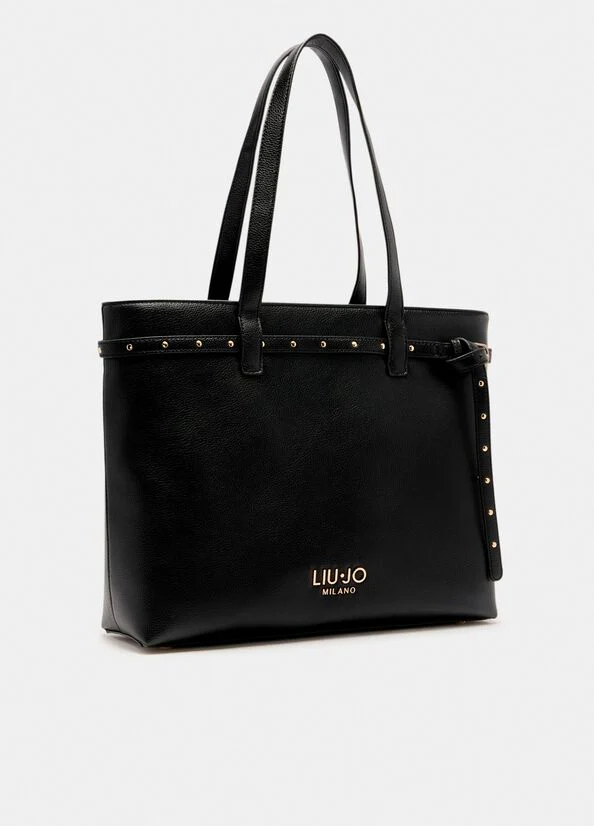 Dimensions : 43 x 8 x 30 cm Sac shopping noir Effet imprimé texturé Logo en métal Sangle cloutée Poignées confortables Poche intérieure Étiquette intérieure de la marque Doublure intérieure de la marque Fermeture éclair