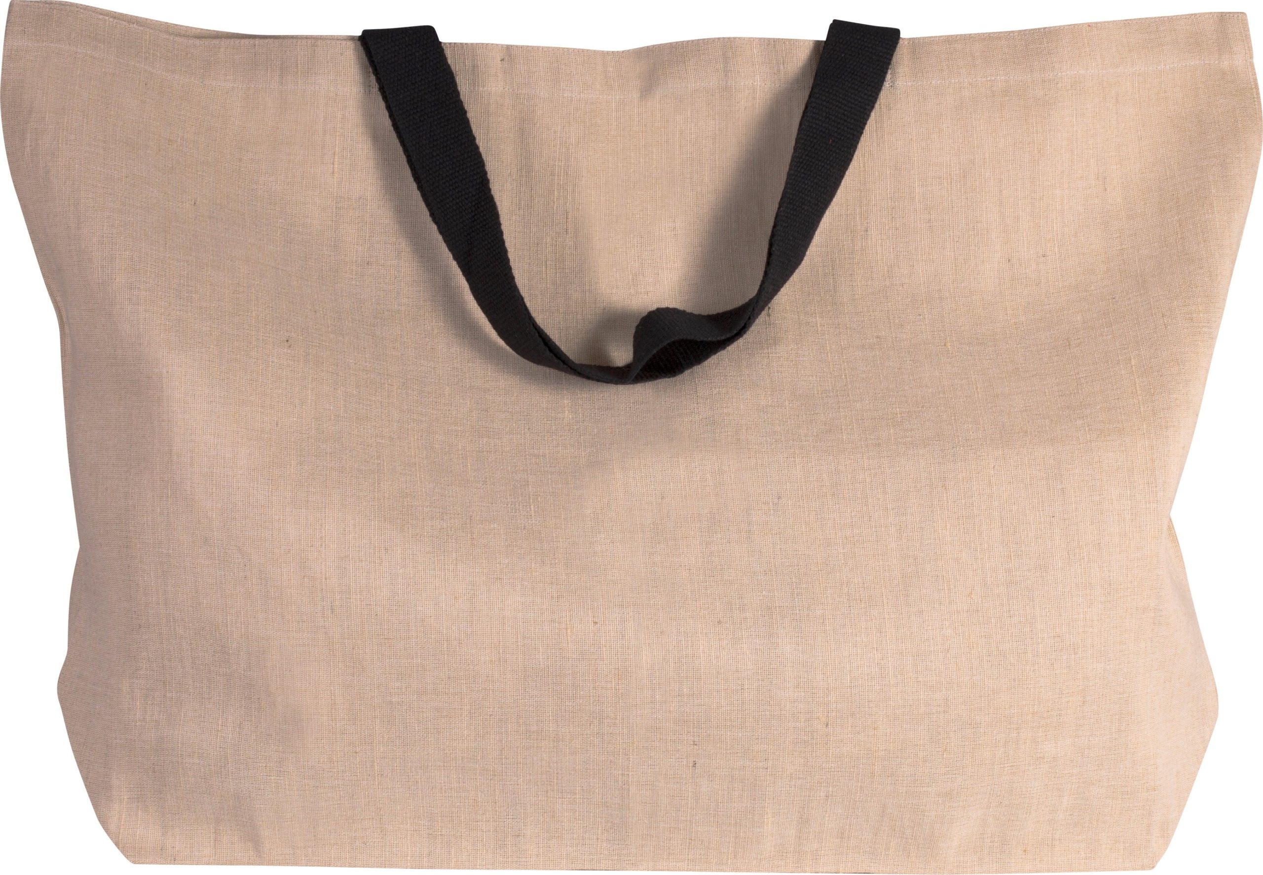 Grand sac fourre-tout en toile de jute et coton (juco), avec soufflet et anses de 55 cm de couleur contrastée.