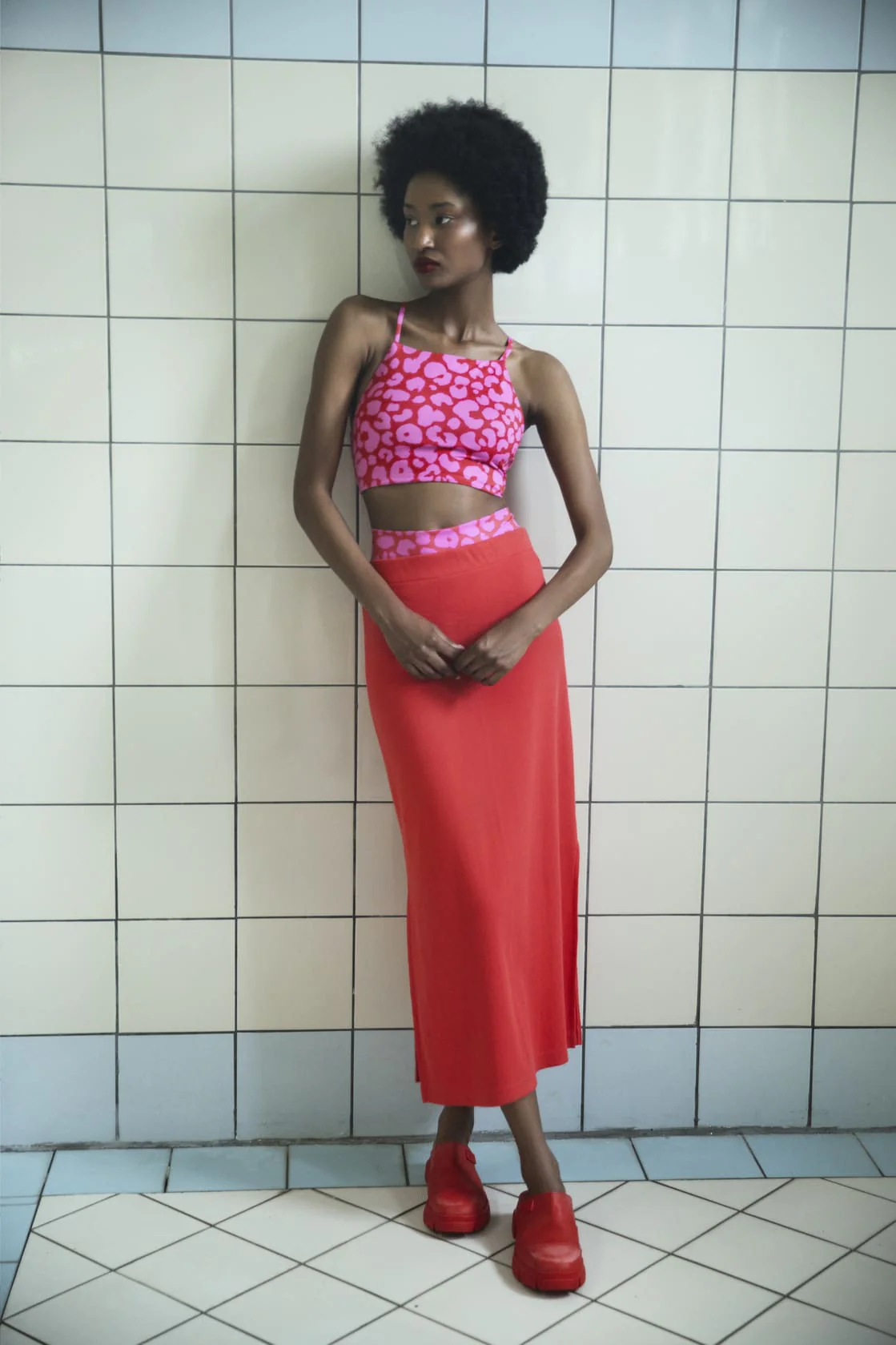 Haut de maillot de bain léopard en polyester recyclé · rouge et rose – bikini top orust painted leopard red