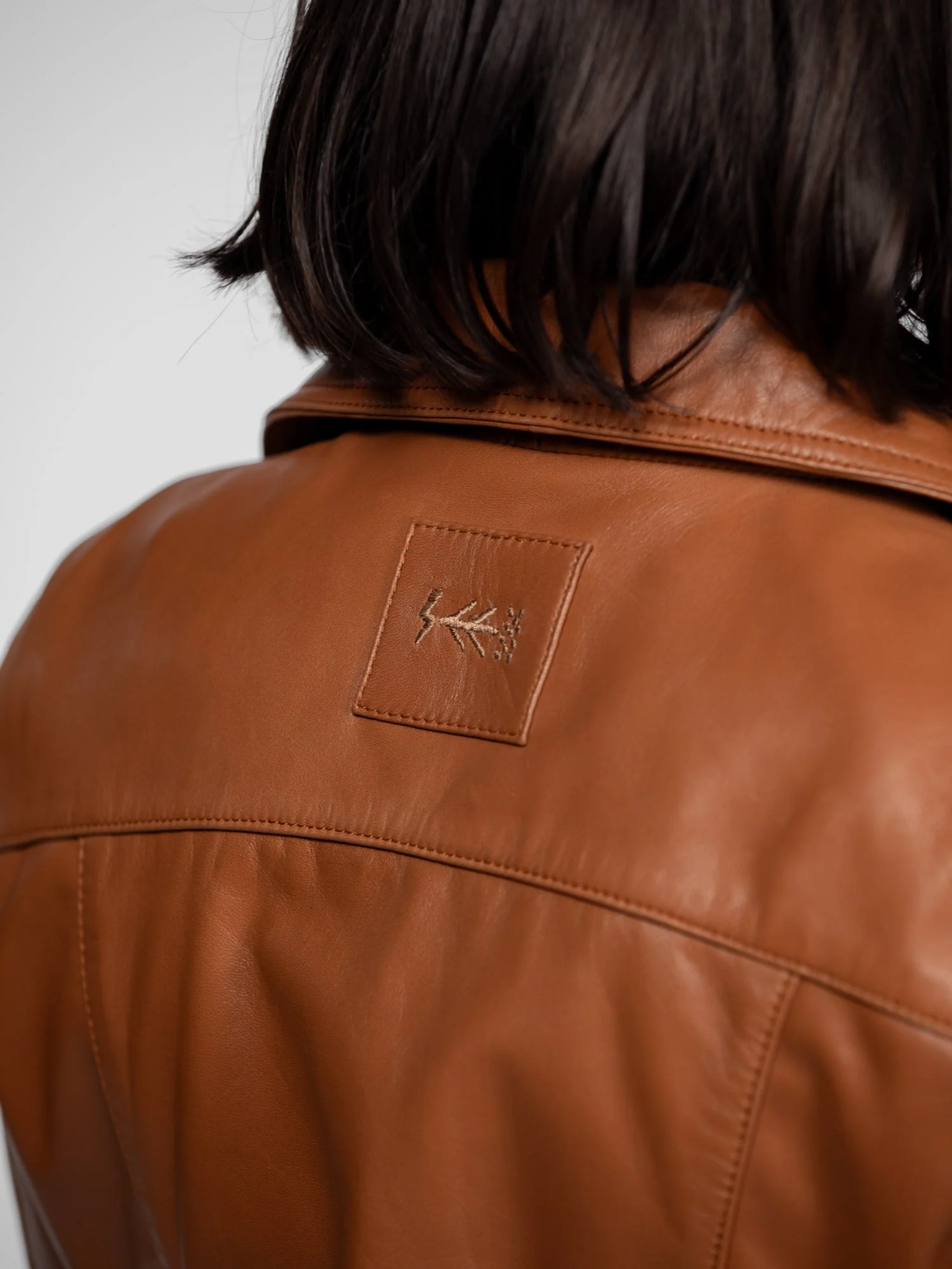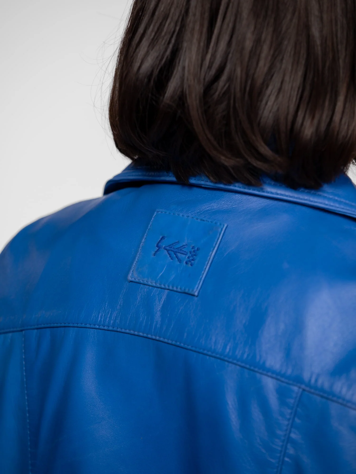 Confectionné en cuir de mouton lisse, ce blouson se distingue par sa finition mate et son tombé souple, qui épouse la silhouette sans la contraindre.