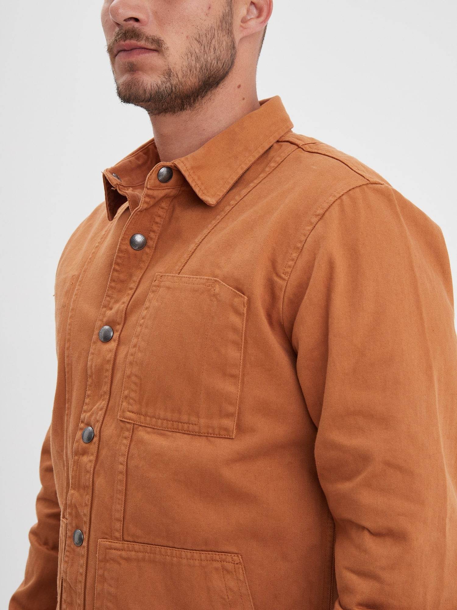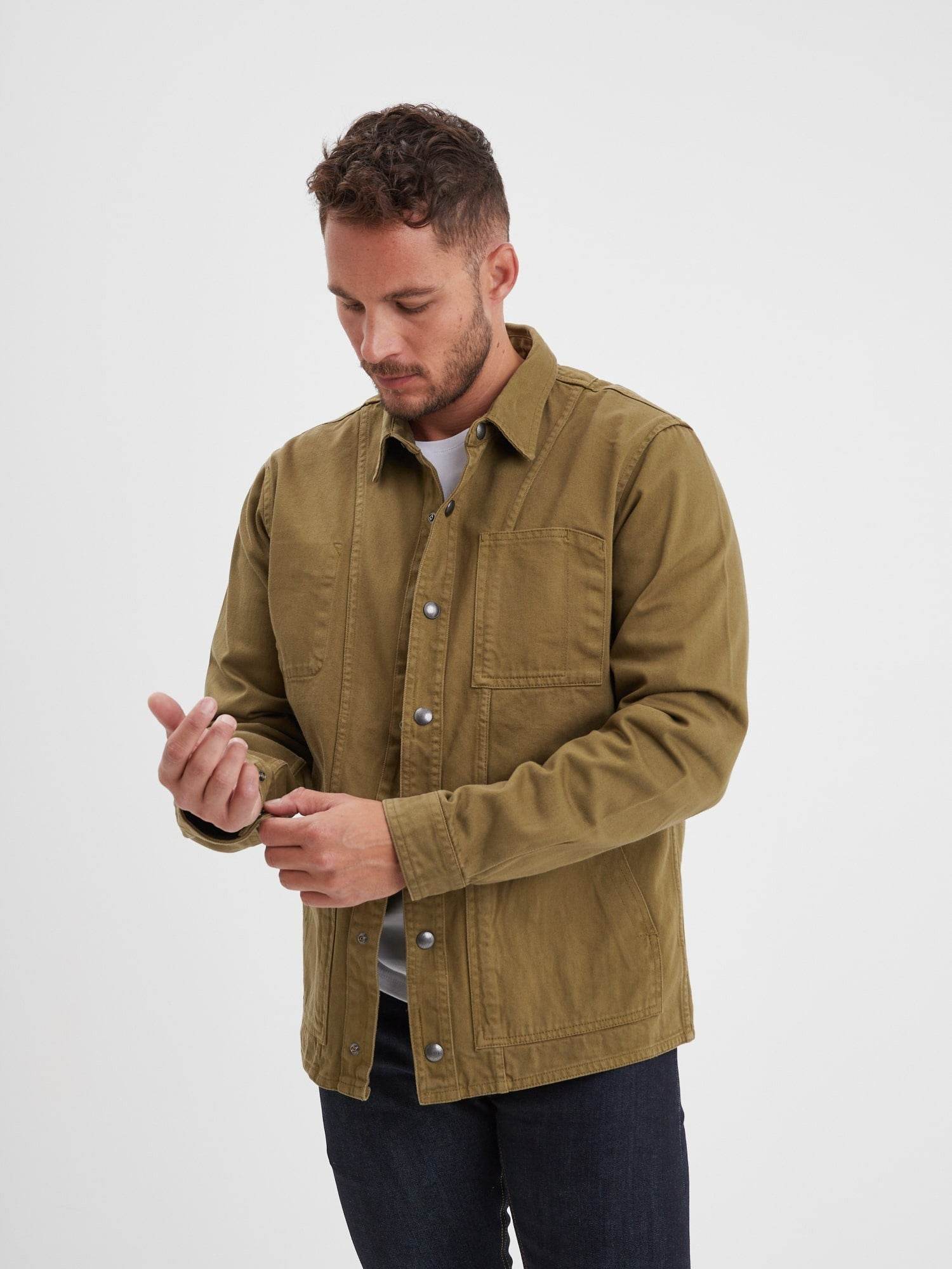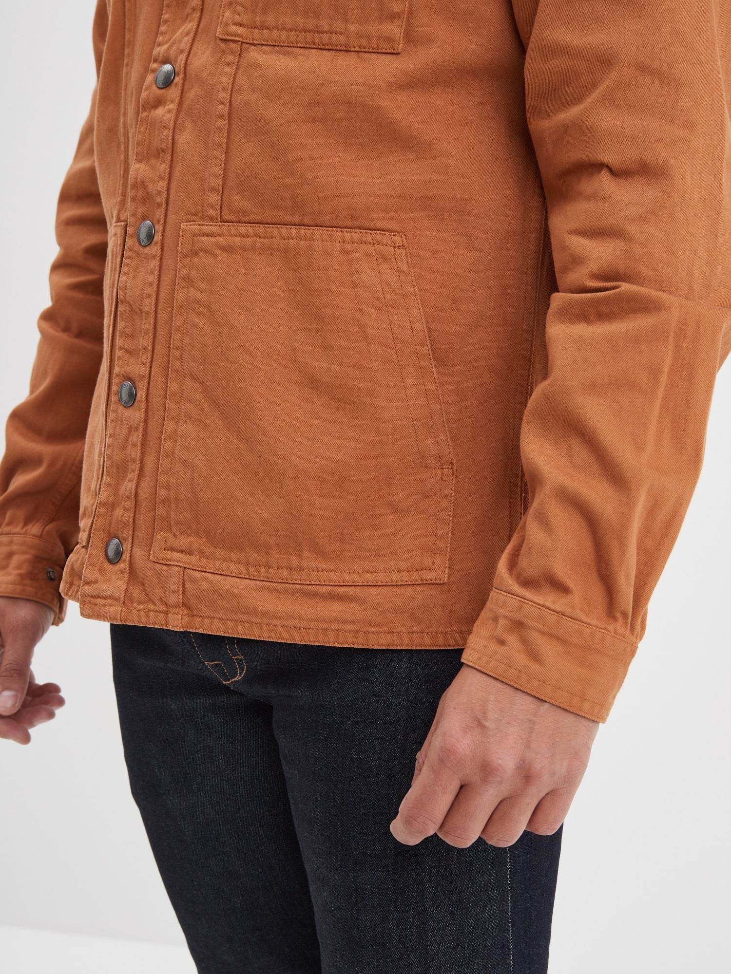 À la frontière entre une surchemise et une veste, ce modèle reprend les codes de la veste de travail également appelée veste workwear. Robuste et fonctionnelle, cette pièce se distingue par l’épaisseur du coton bull denim et une fermeture rapide avec ses pressions.