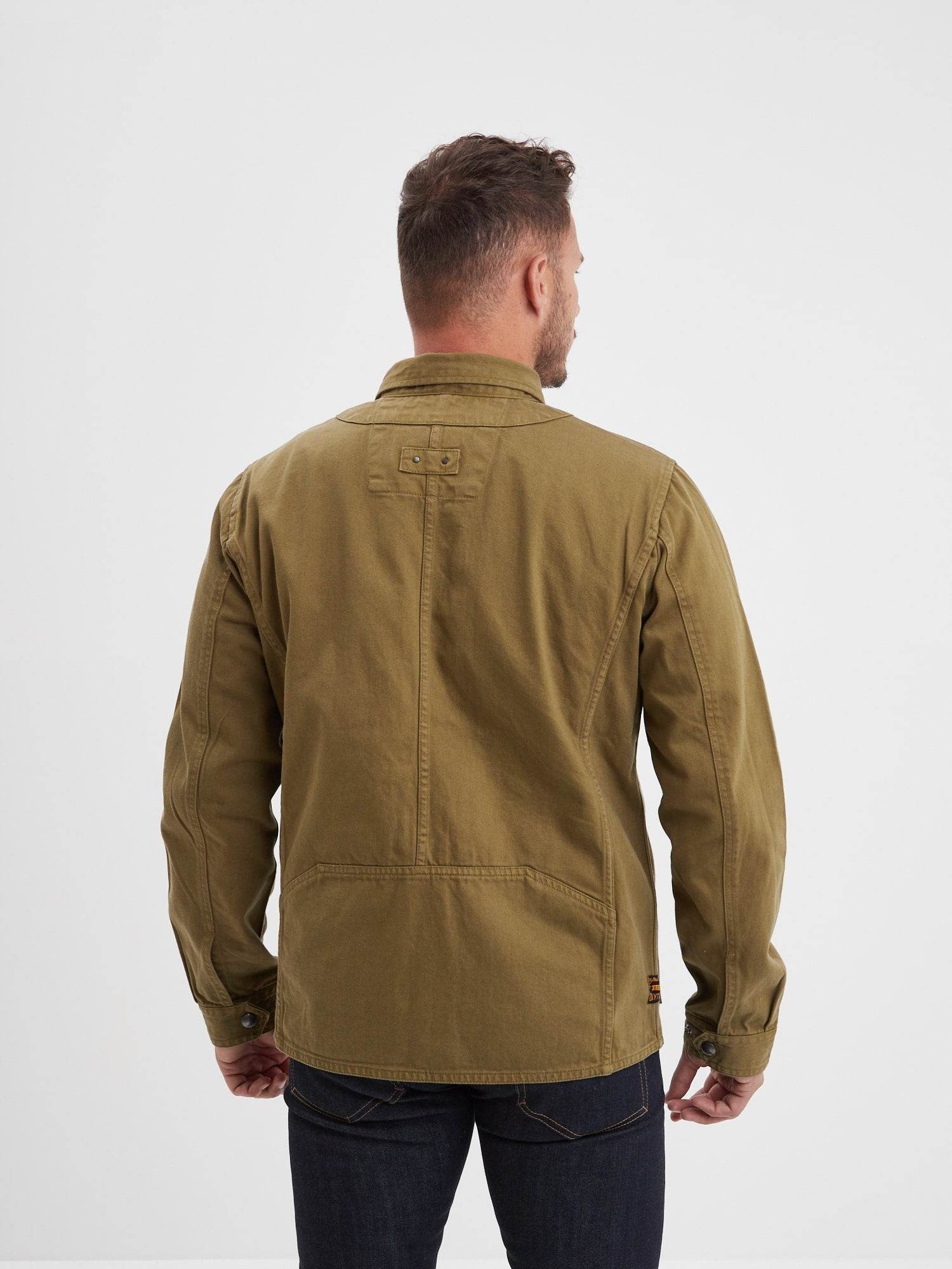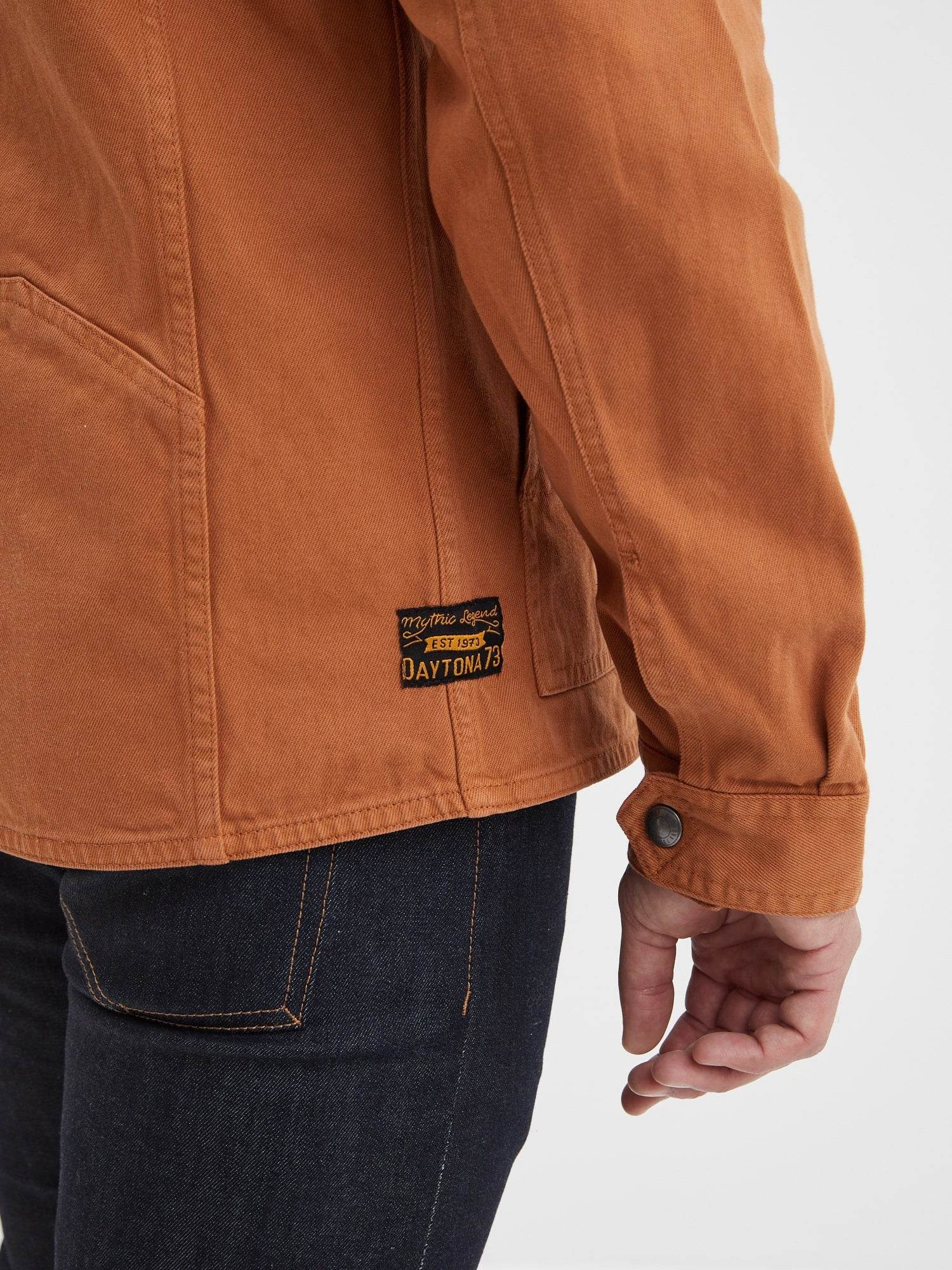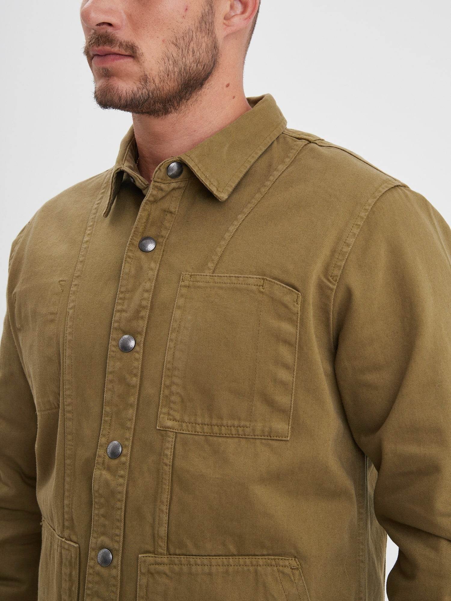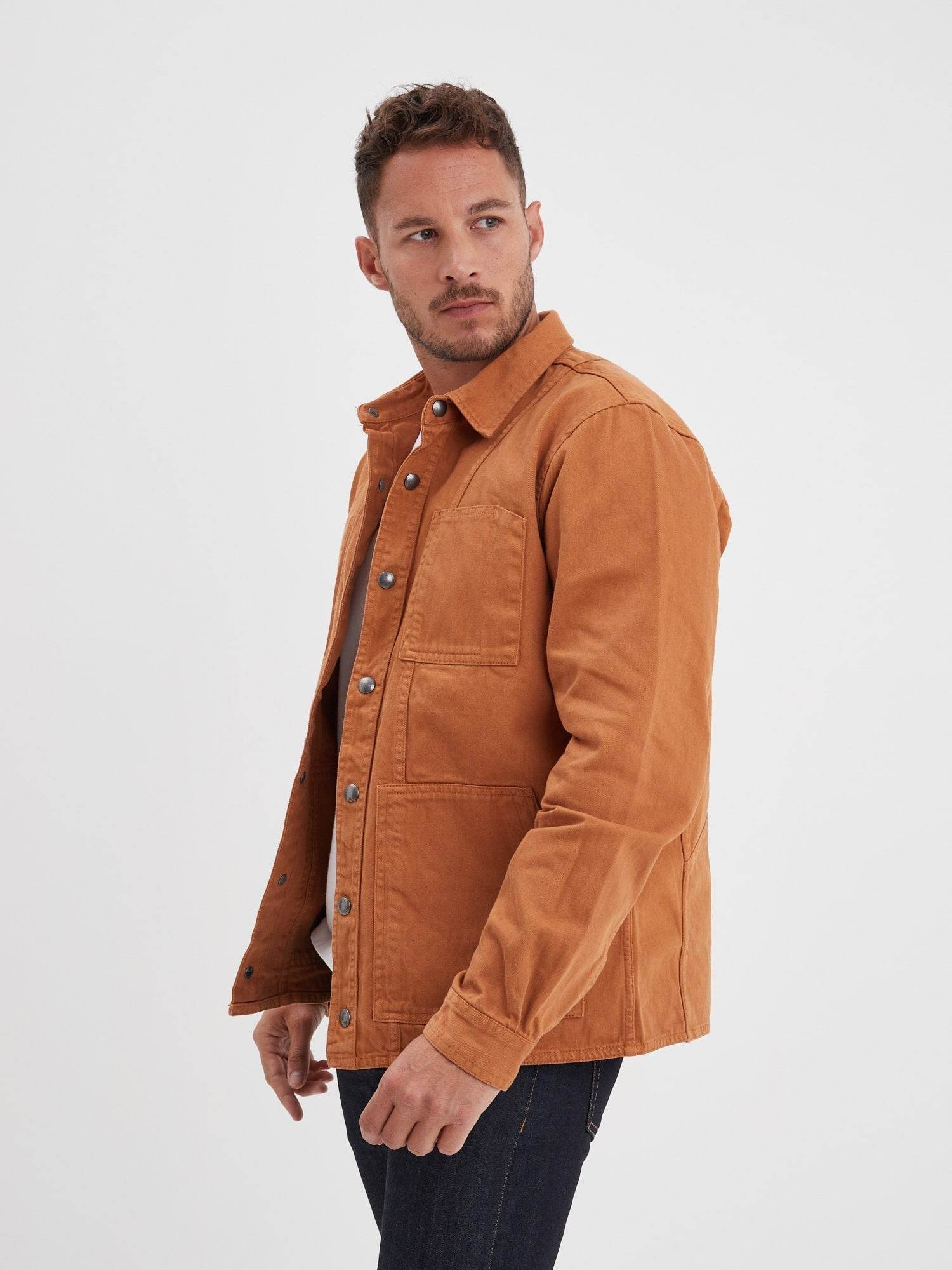 À la frontière entre une surchemise et une veste, ce modèle reprend les codes de la veste de travail également appelée veste workwear. Robuste et fonctionnelle, cette pièce se distingue par l’épaisseur du coton bull denim et une fermeture rapide avec ses pressions.