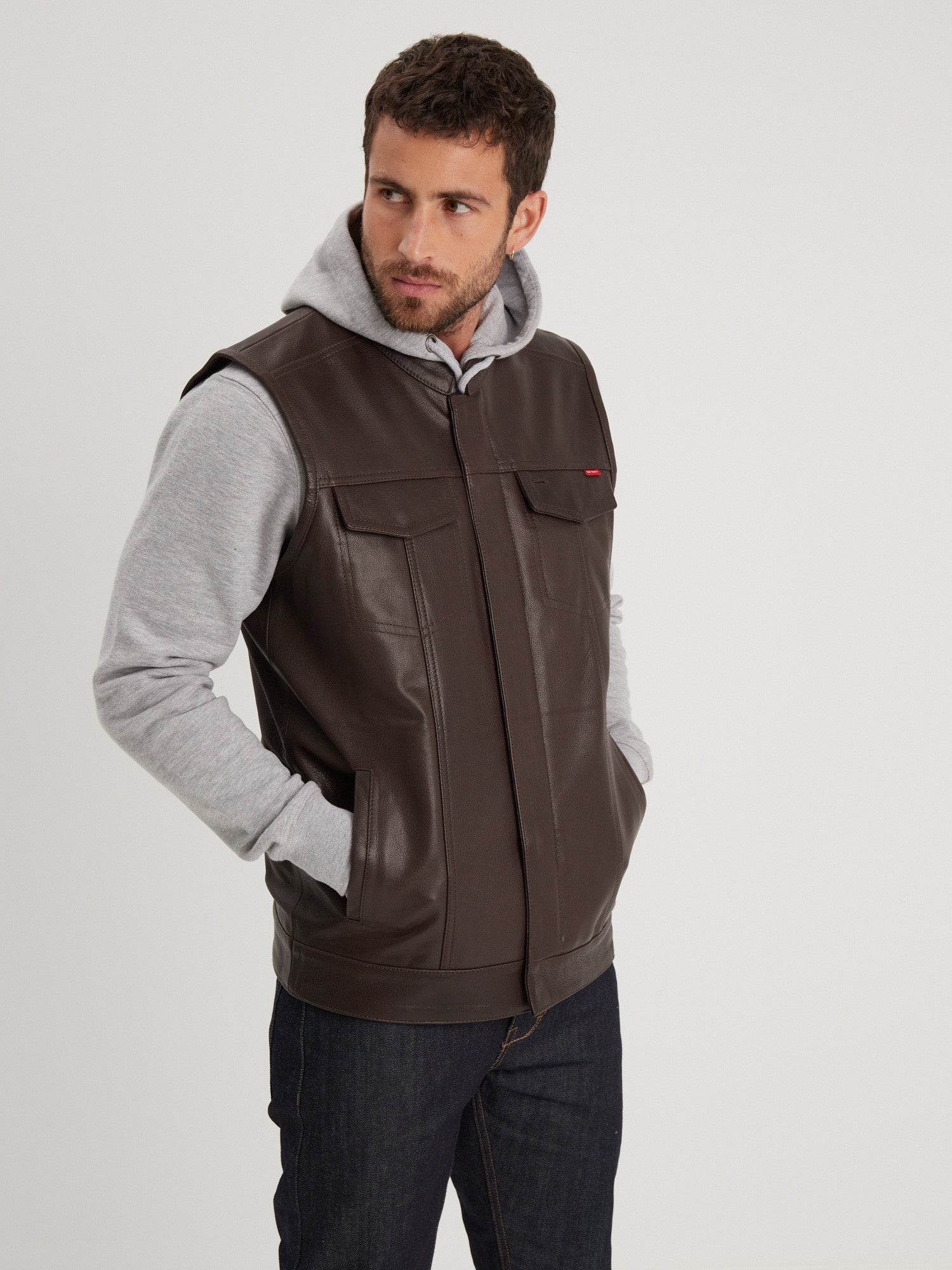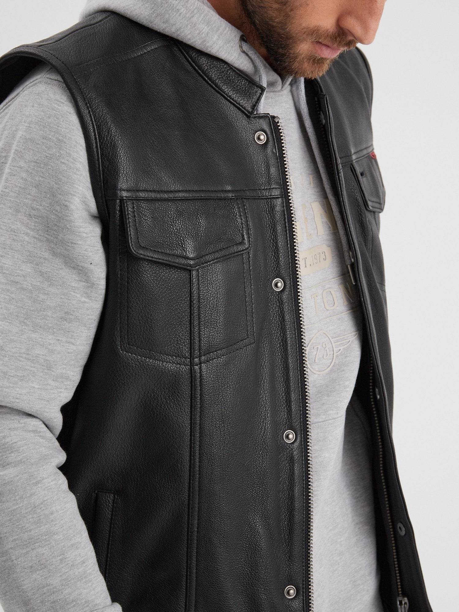 Bikers et fans inconditionnels de la série Sons of Anarchy, ce gilet en cuir chèvre est fait pour vous. Cuir épais, poches plaquées avec rabat, fermeture zippée avec pressions, tous les éléments de ce grand classique sont présents.