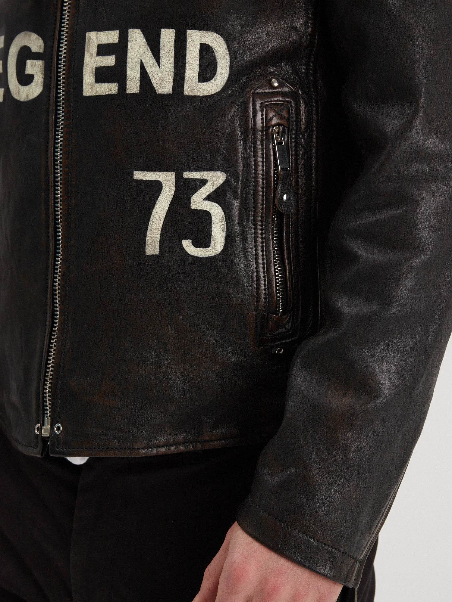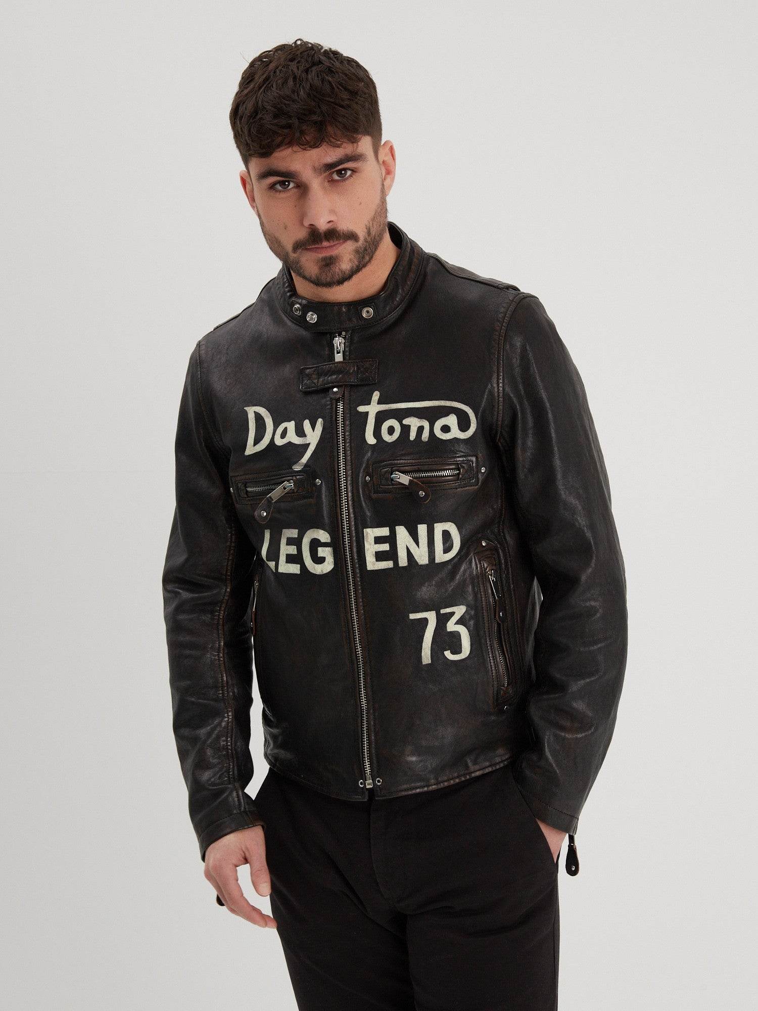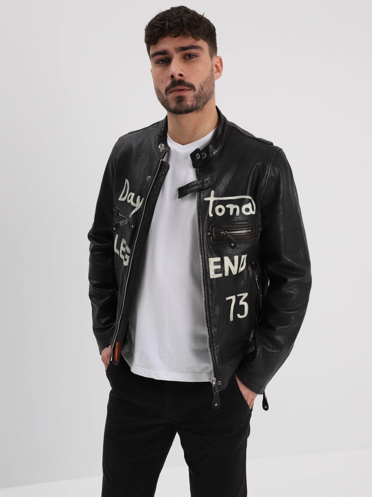 Ce modèle s’inscrit dans la pure tradition des blousons motard esprit rock n’ roll des années 70. Un retour aux sources visible grâce à ce cuir d’agneau vieilli, au visuel peint à la main, ainsi qu’aux nombreux zips avec tirette en cuir.