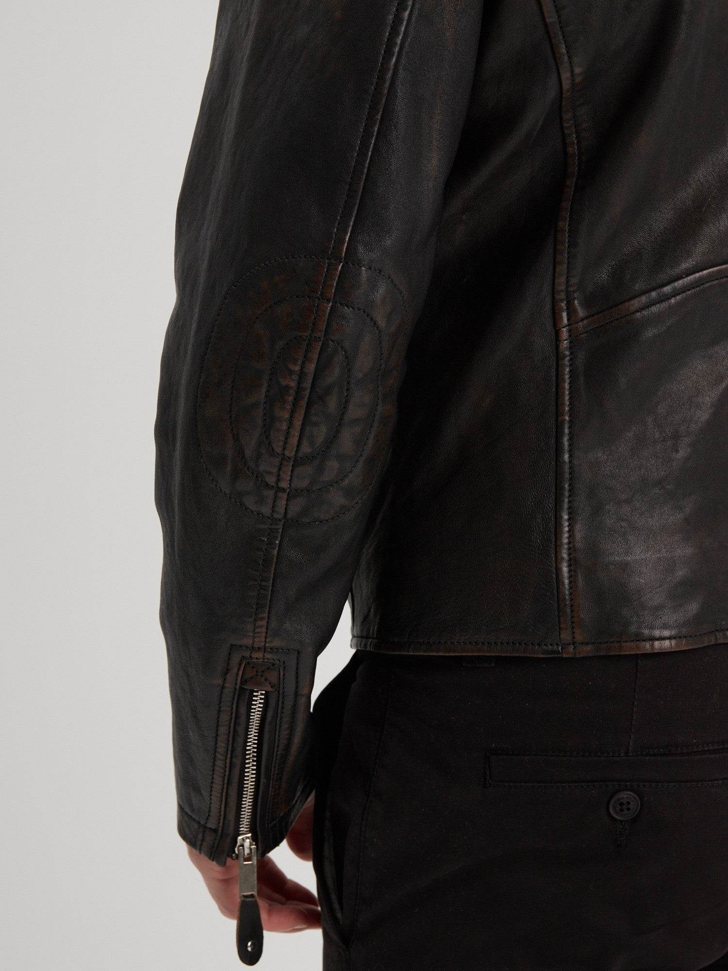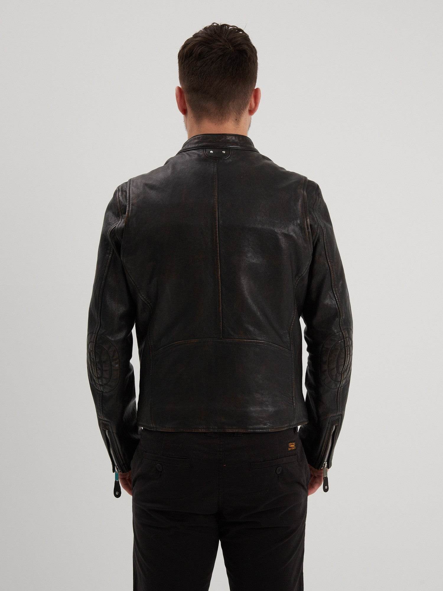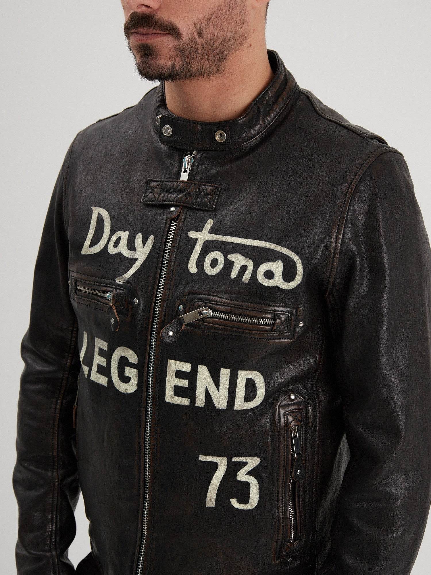 Ce modèle s’inscrit dans la pure tradition des blousons motard esprit rock n’ roll des années 70. Un retour aux sources visible grâce à ce cuir d’agneau vieilli, au visuel peint à la main, ainsi qu’aux nombreux zips avec tirette en cuir.
