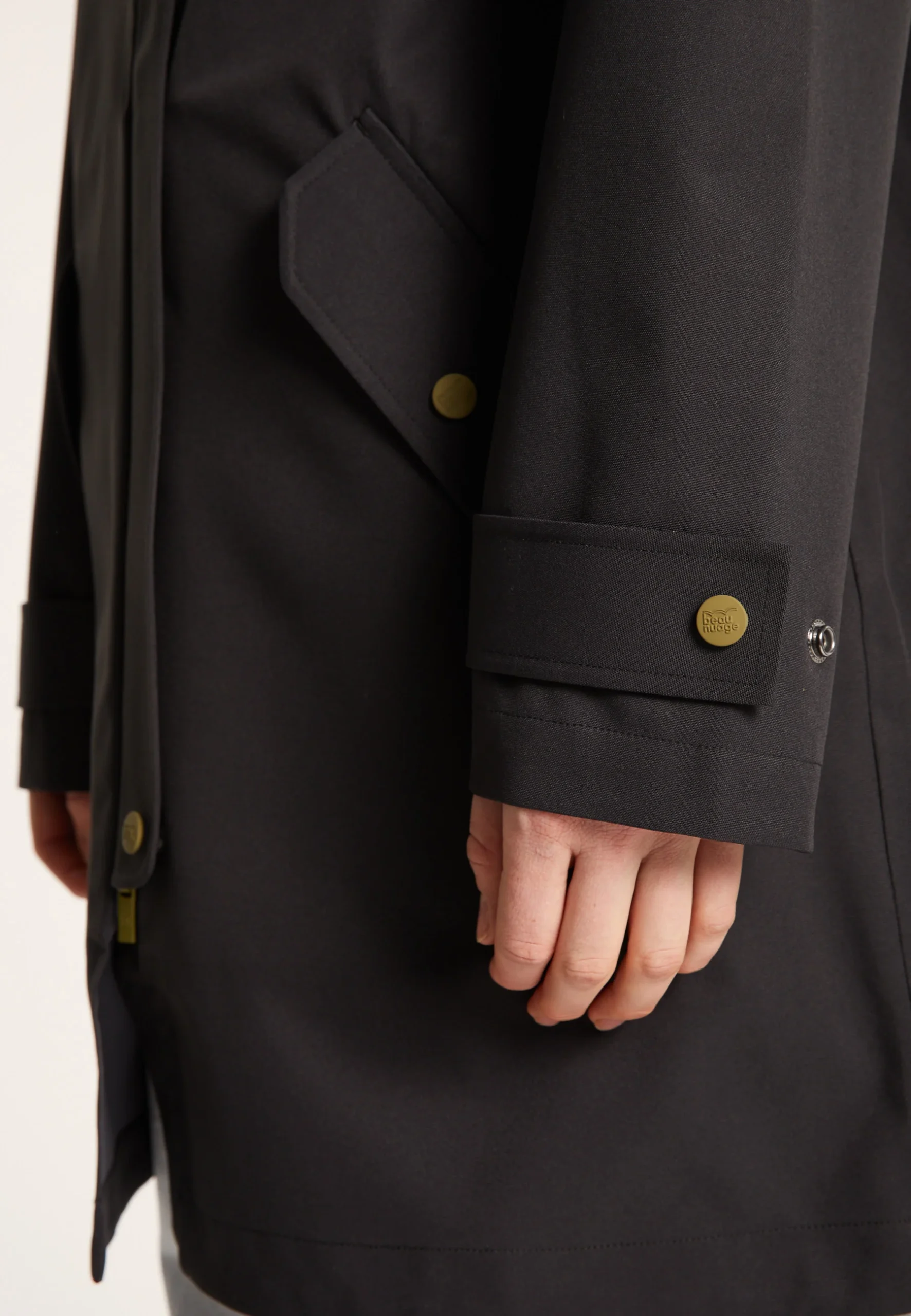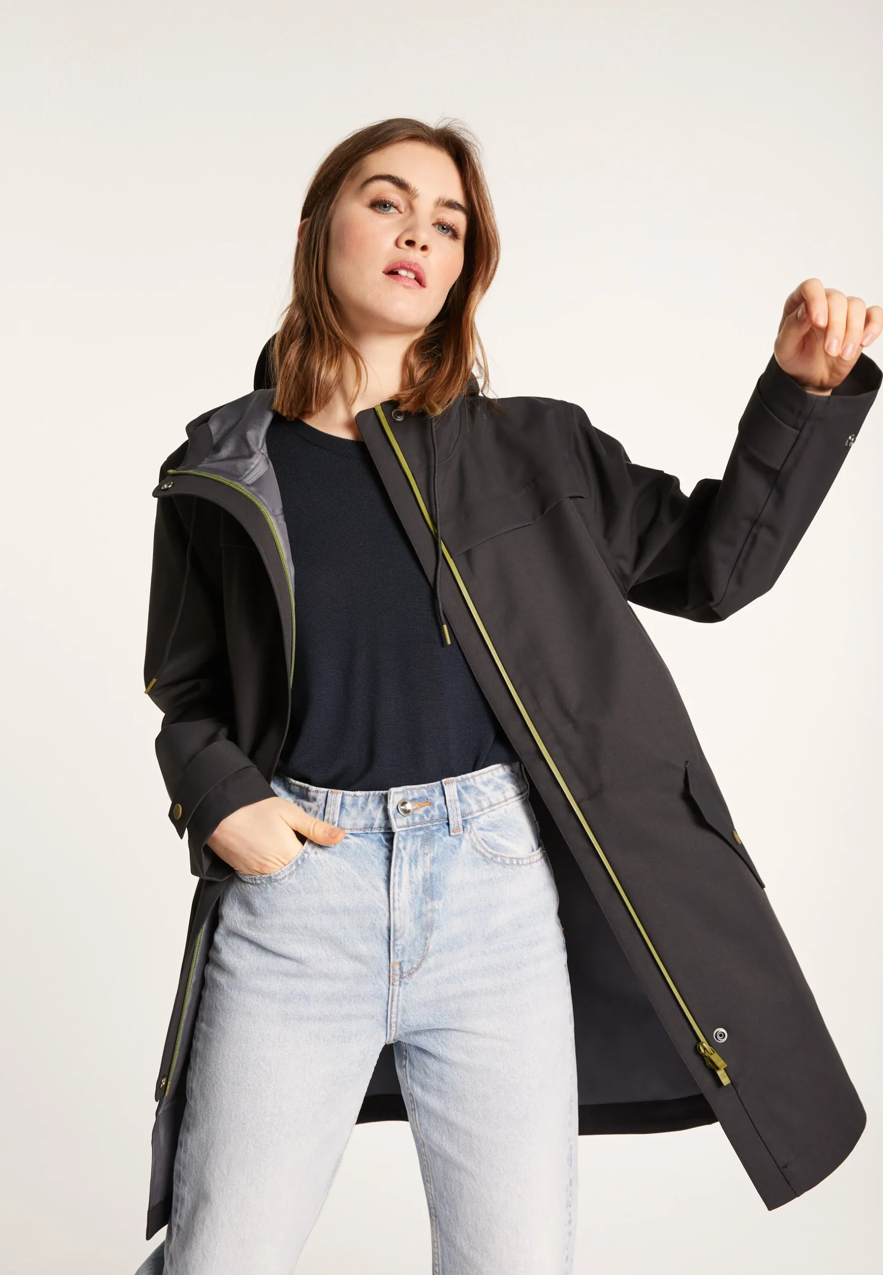 Cet imperméable unisexe noir avec des détails vert olive, à la coupe moderne, est un basique intemporel. C’est le vêtement indispensable en cas de pluie et de vent, grâce à s]a matière performante et entièrement recyclée.