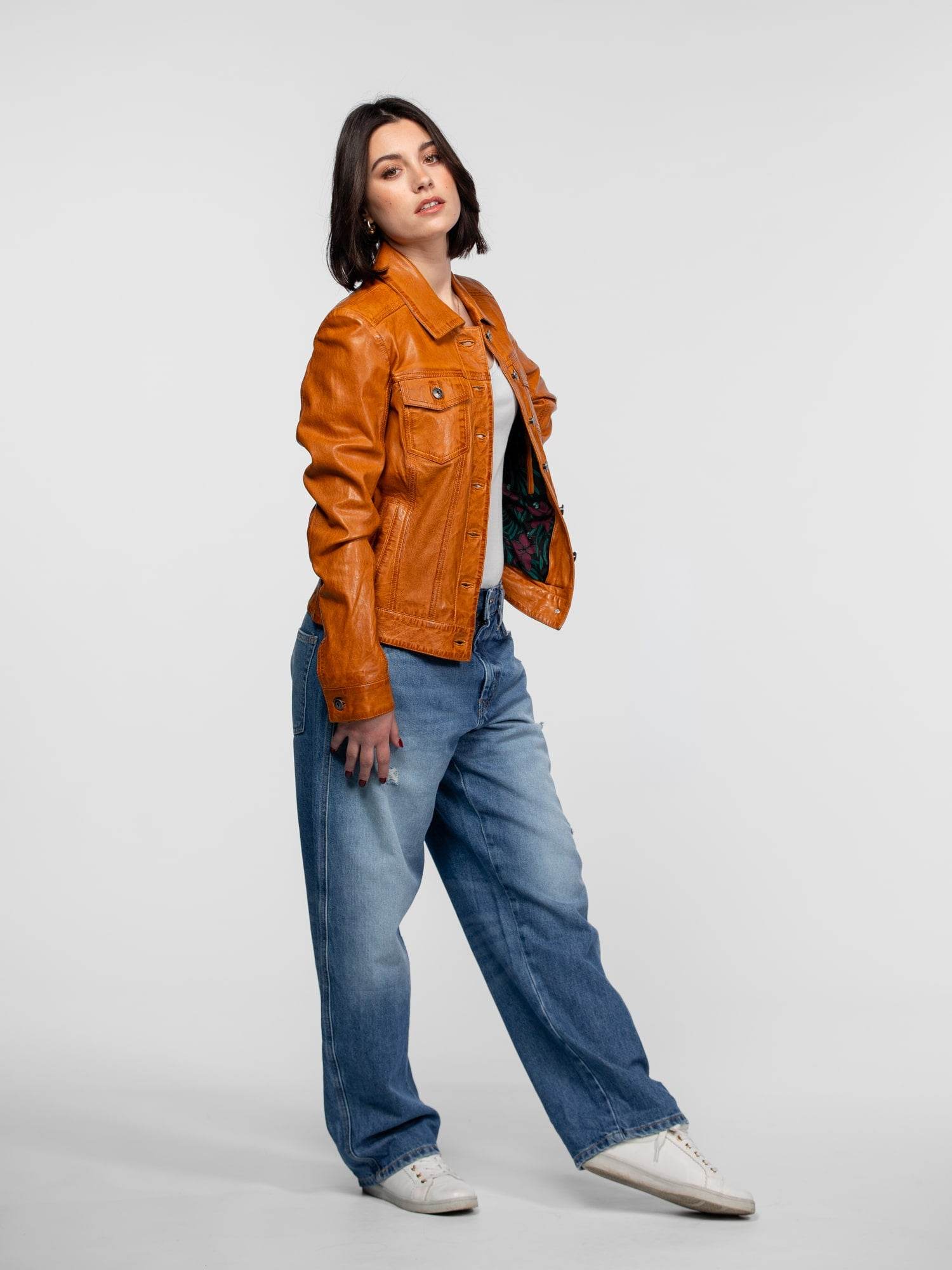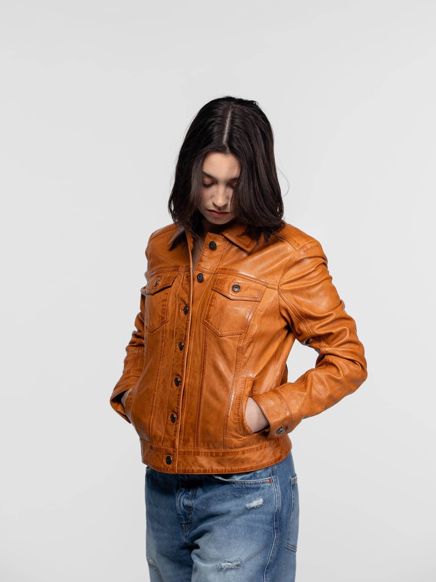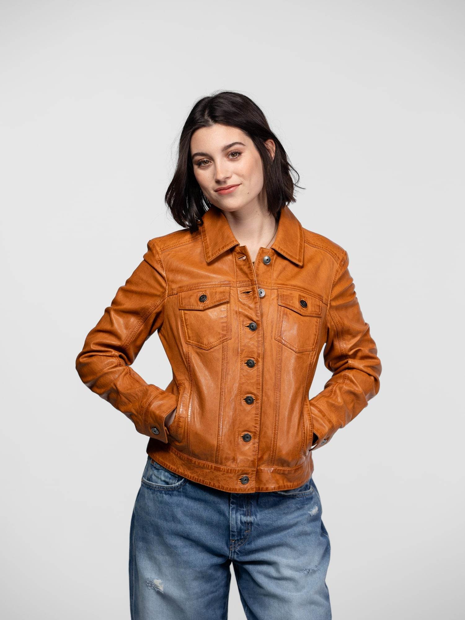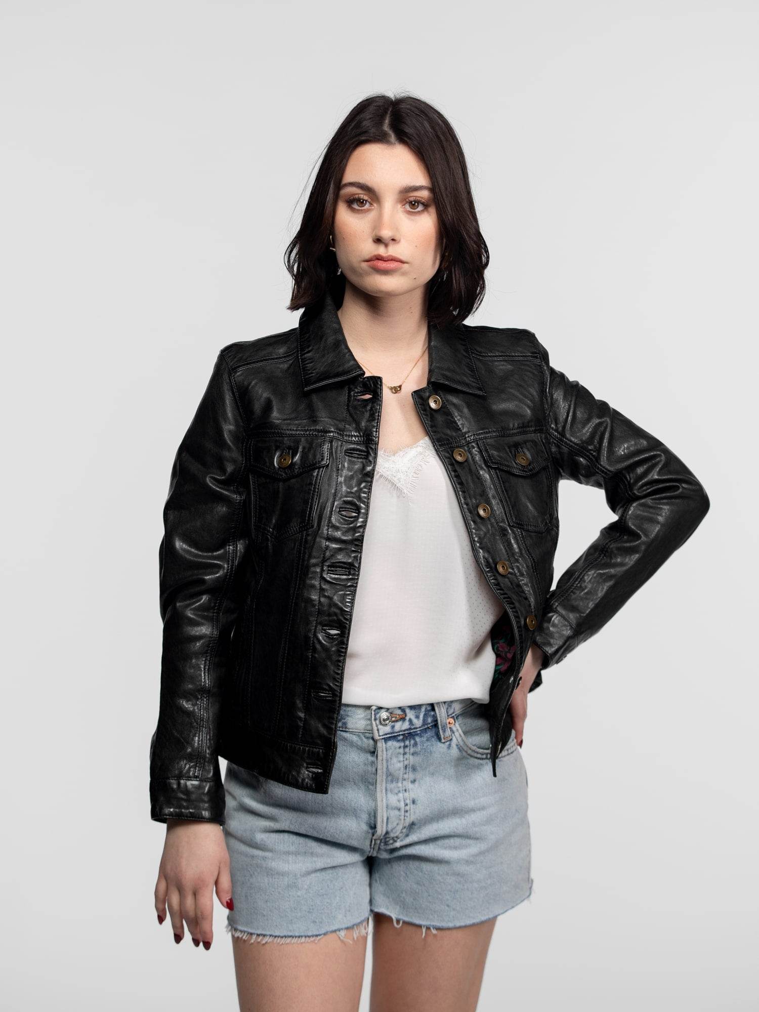 Une veste en cuir pour femme reprenant tous les codes de la veste en jean. Poches à rabat sur la poitrine, col chemise, fermeture en boutonnière…. Ajoutez à cela un cuir d’agneau au tannage végétal avec une finition lavée, vous obtenez une veste au look vintage.