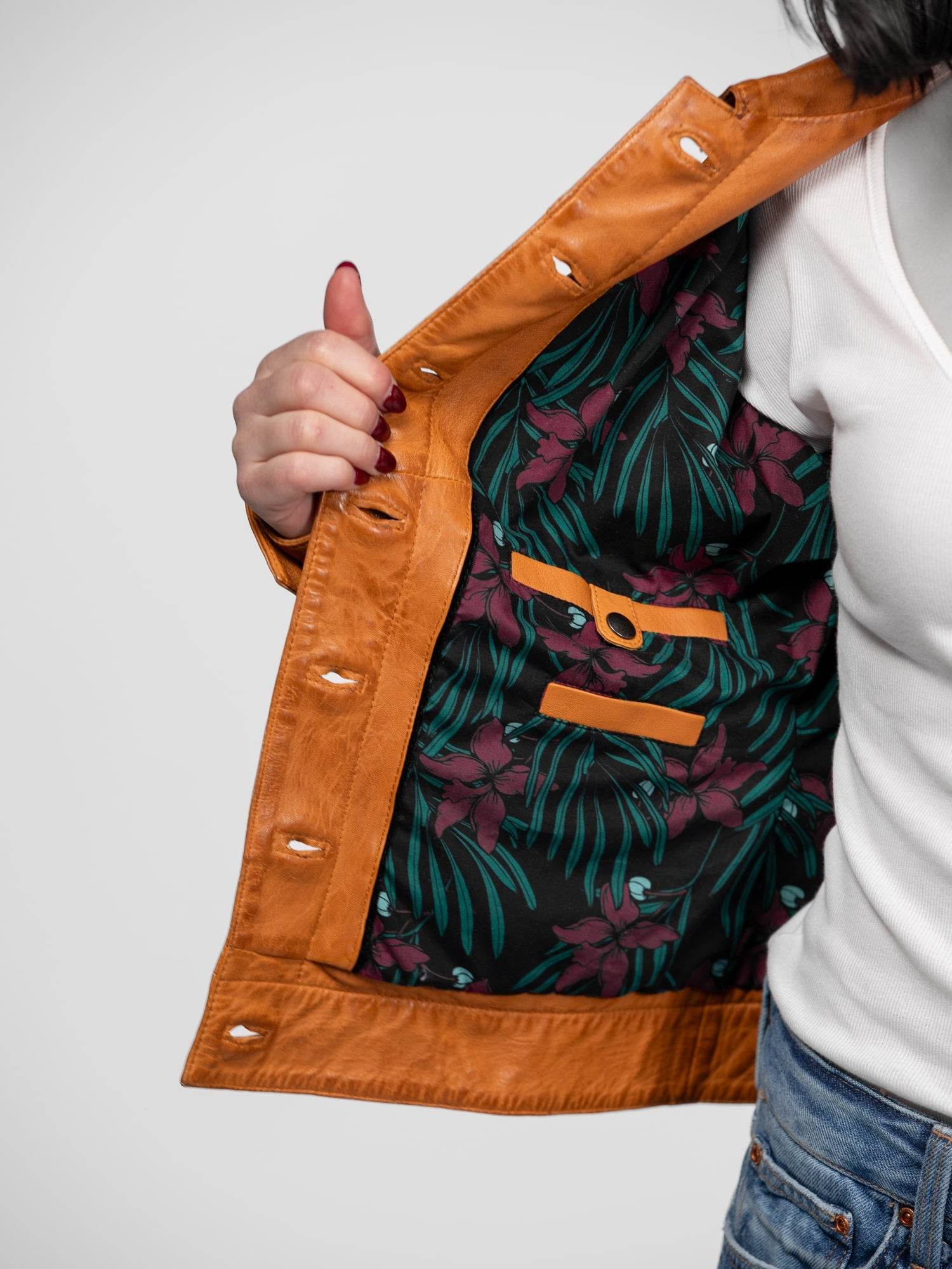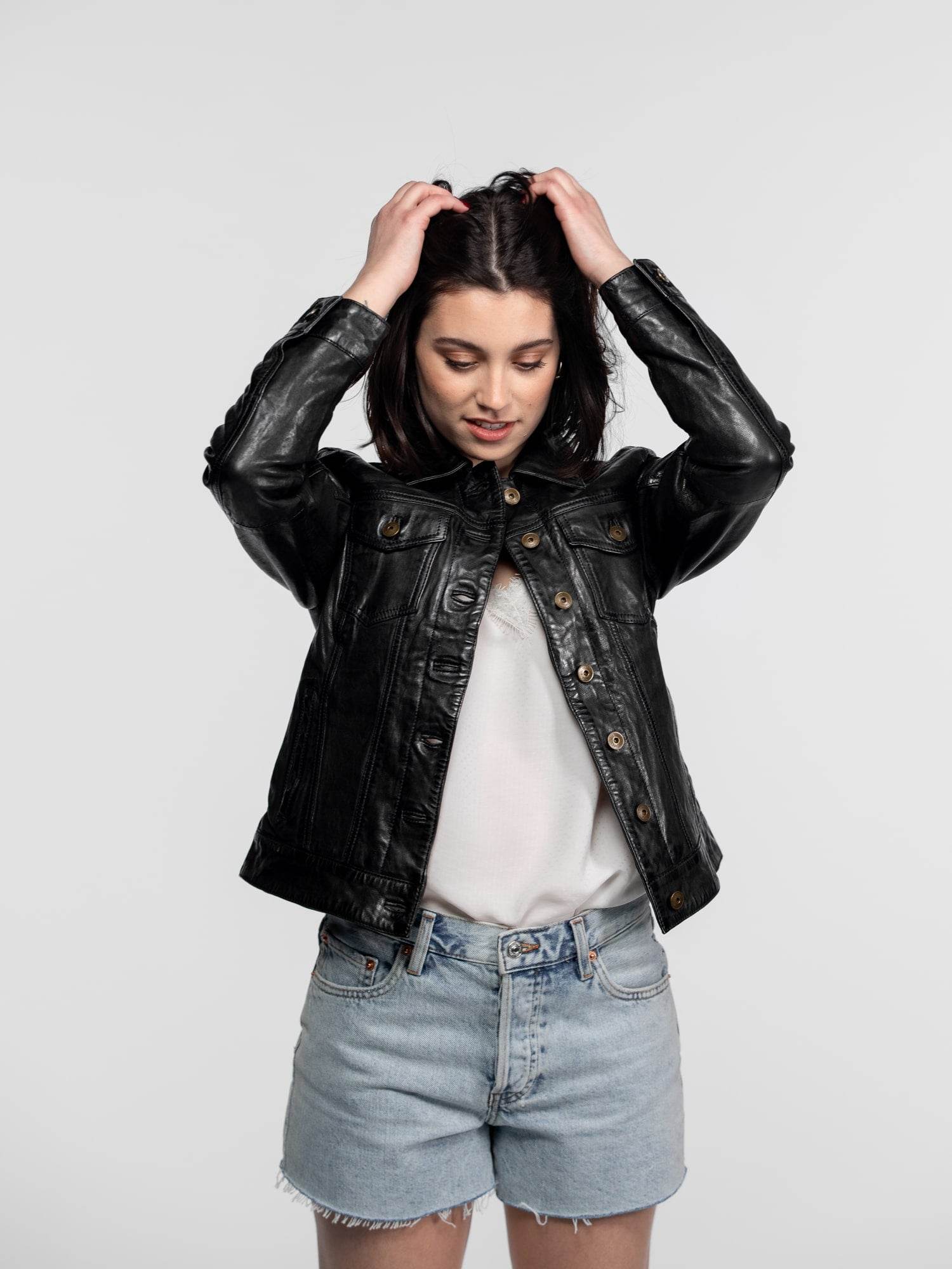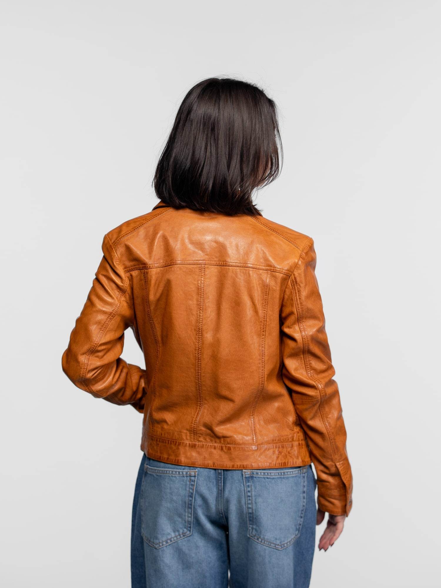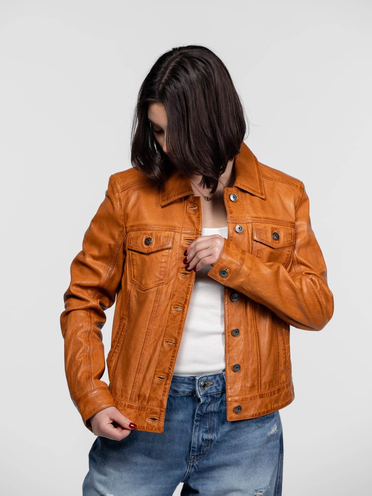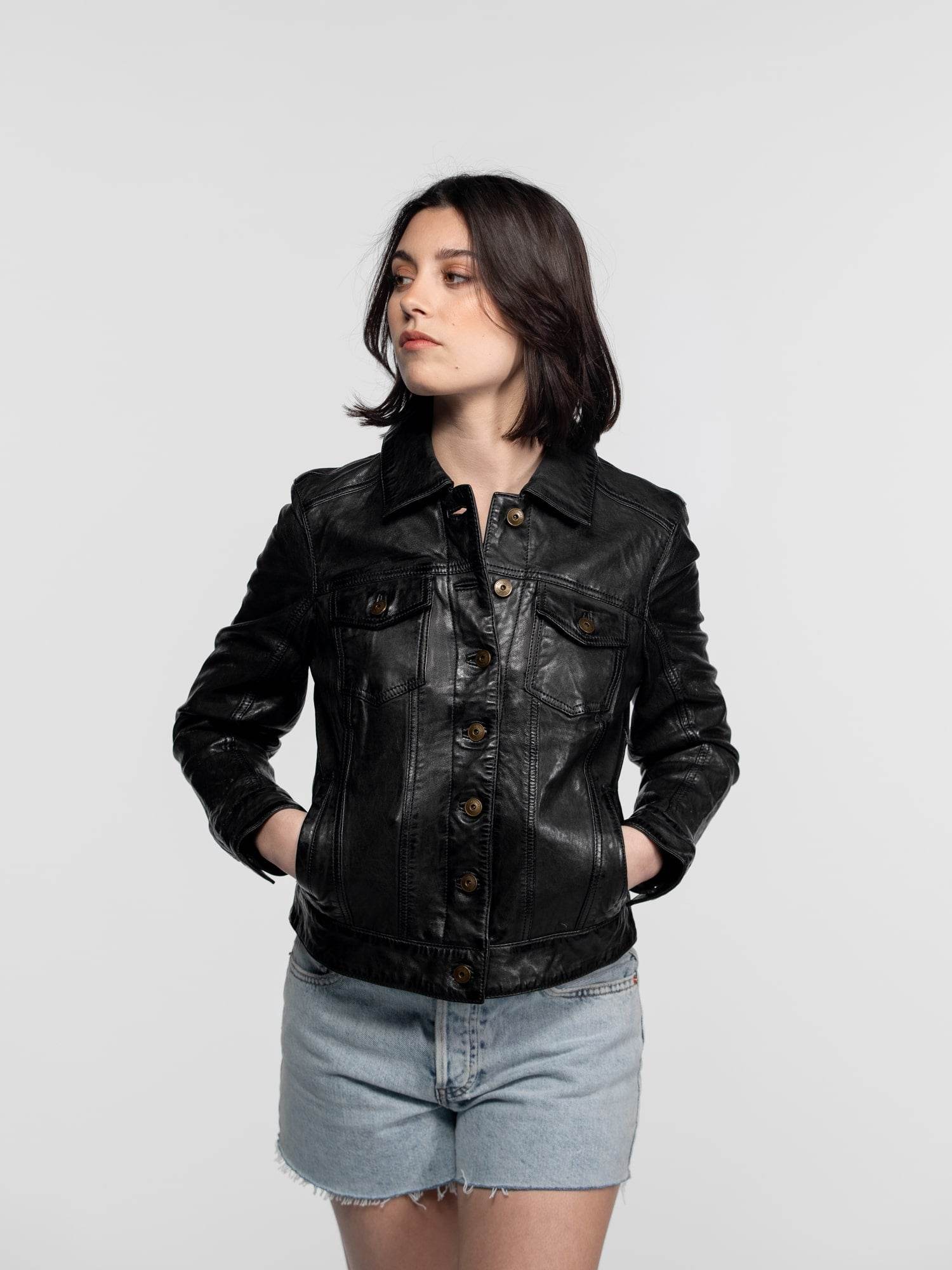 Une veste en cuir pour femme reprenant tous les codes de la veste en jean. Poches à rabat sur la poitrine, col chemise, fermeture en boutonnière…. Ajoutez à cela un cuir d’agneau au tannage végétal avec une finition lavée, vous obtenez une veste au look vintage.