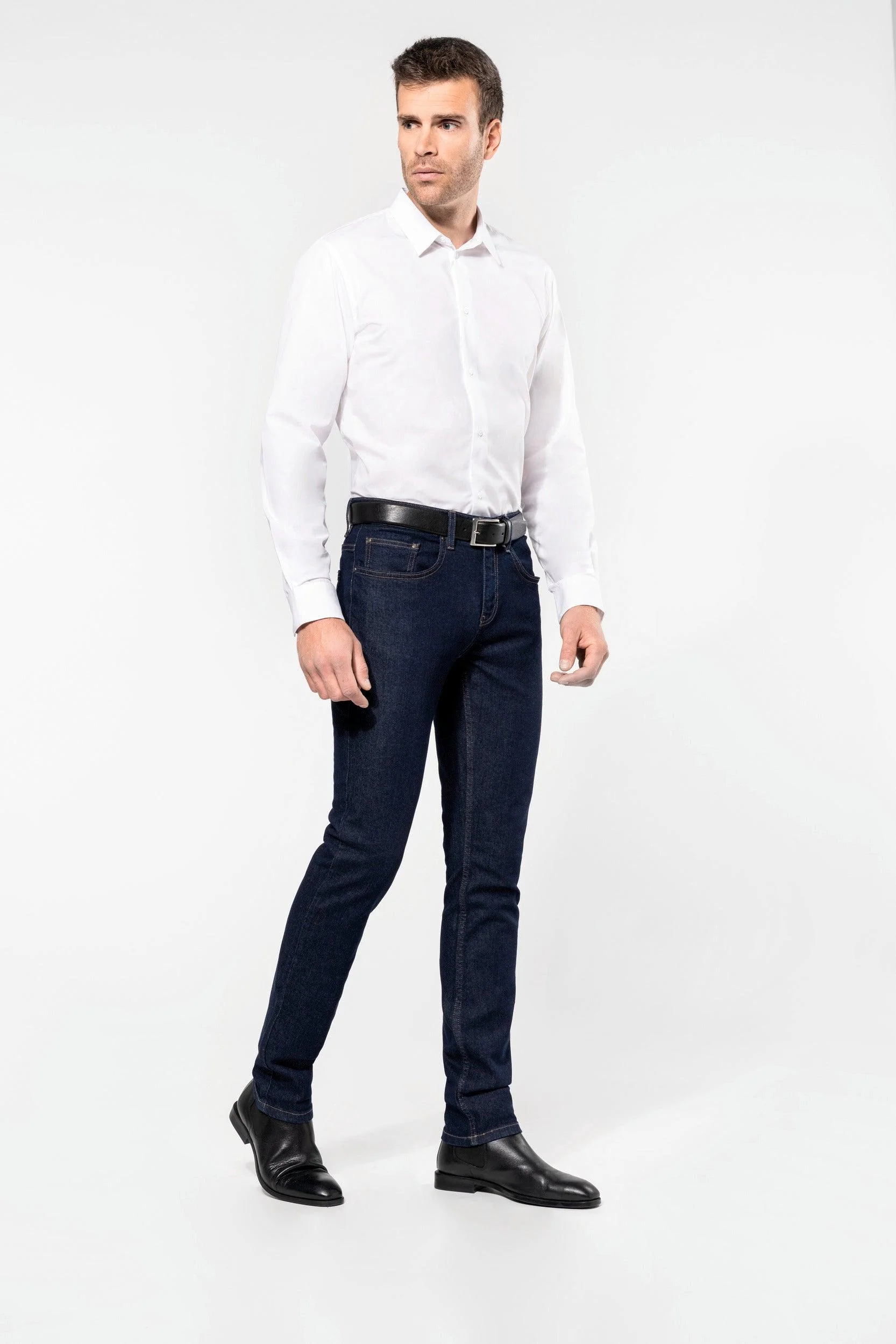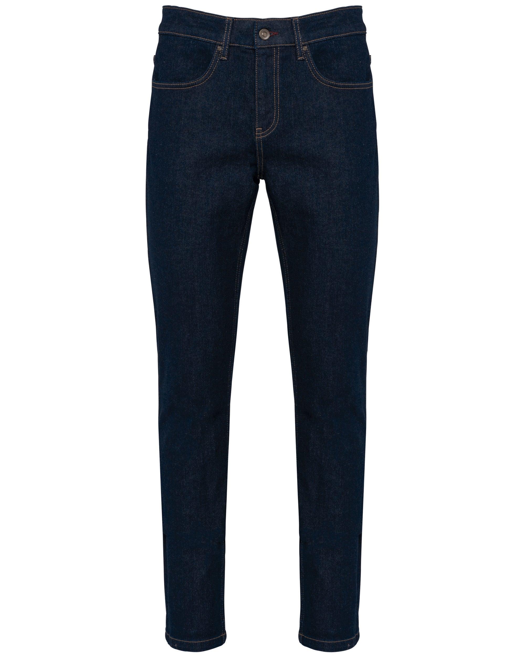 99% coton denim / 1% élasthanne. 10,5 oz. Fermeture zippée avec un bouton métal, rivets en métal de la même couleur Old Bras. Deux poches devant dont une avec poche ticket. 2 poches plaquées arrière. Coutures contrastées bordeaux. Ceinture avec passants et intérieur bande contrastée à l’arrière. Coupe droite. Ce jean est lavé avec un traitement spécifique impliquant des variations de couleurs d’une pièce à l’autre. Au fil des lavages, il va se patiner. En contact avec des surfaces claires, Il peut déteindre. À laver séparément. Pas d’étiquette de marque, uniquement une puce de taille pour faciliter la personnalisation.