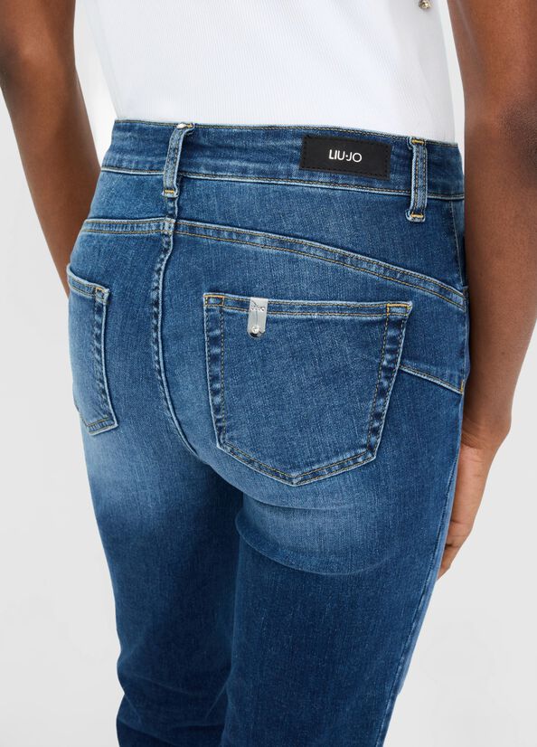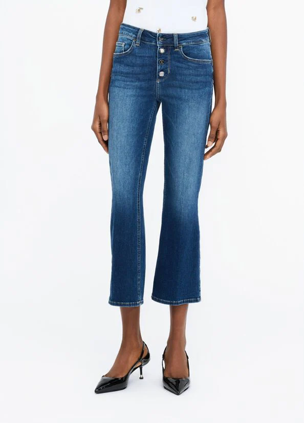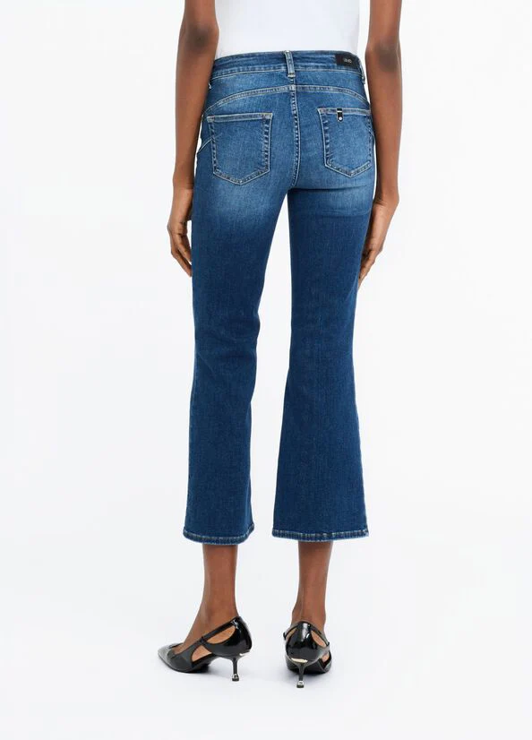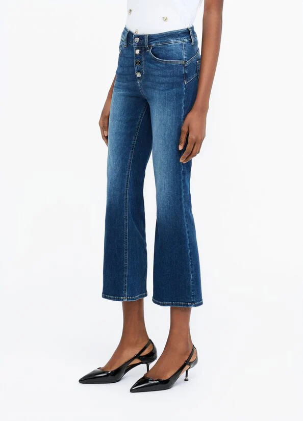Jean évasé en denim de coton Coupes bottom up qui redéfinissent les formes avec élégance, apportant harmonie et maintien sans devoir renoncer au confort Délavage à la pierre Taille haute Découpes bottom up Modèle cinq poches Longueur 7/8 Jambe pattes d’éléphant
