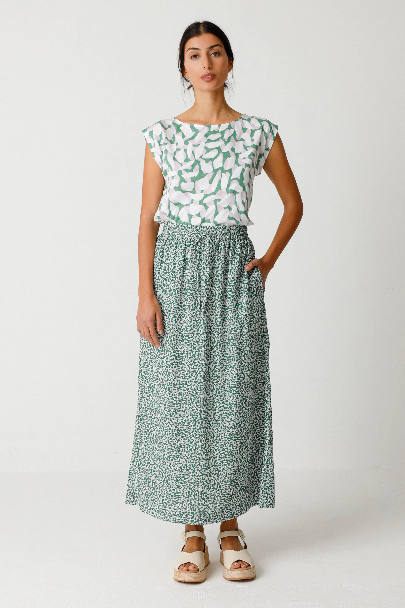 Jupe longue fluide en lenzing ecovero aida small petals · bleu et vert
