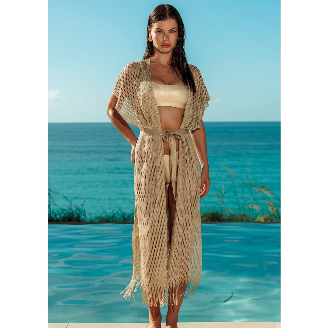Description Tunique longue en crochet ouverte devant Manches courtes Ceinture amovible Finition en franges Composition 94% Viscose 5% Polyester 1% polyamide