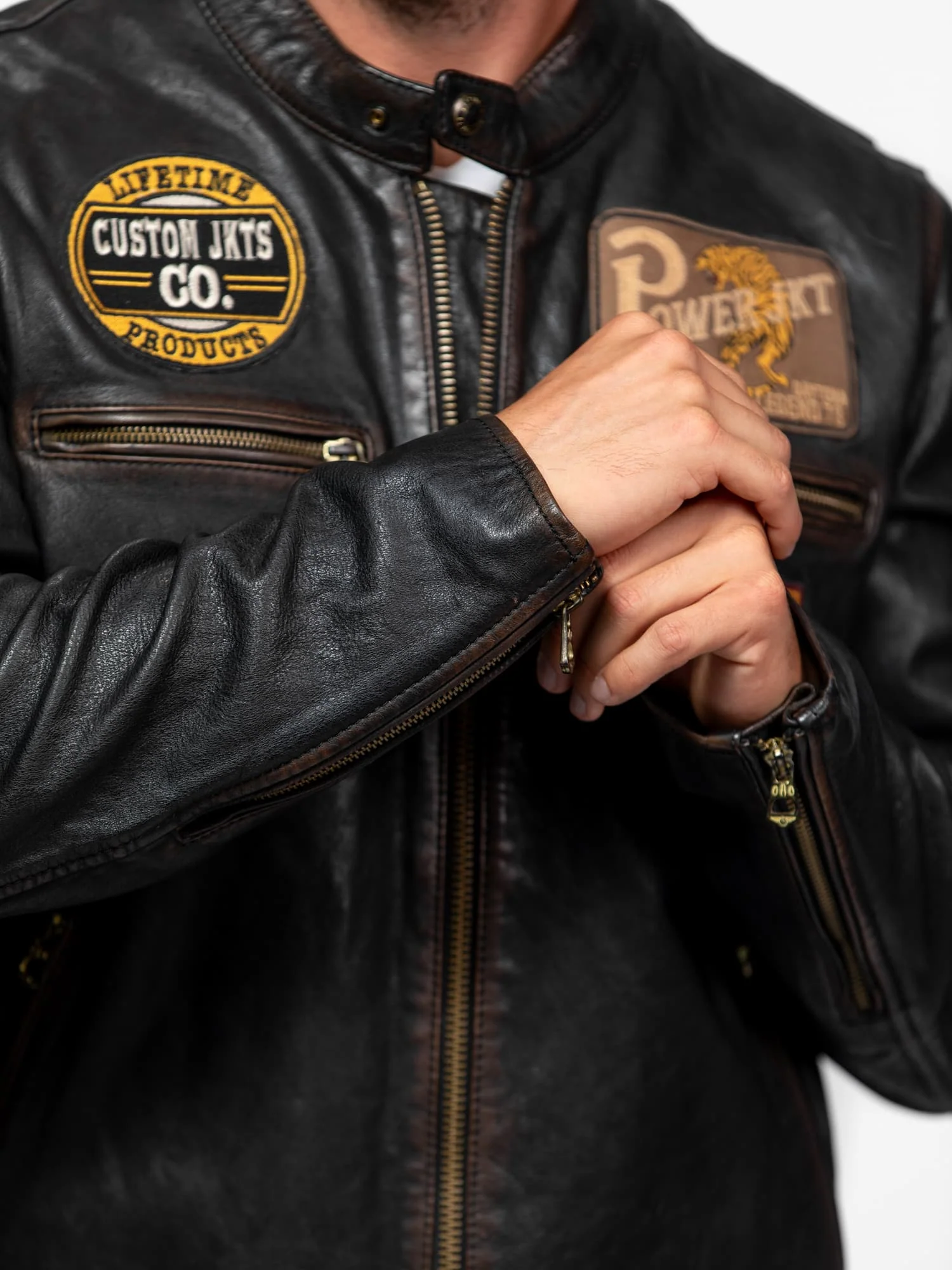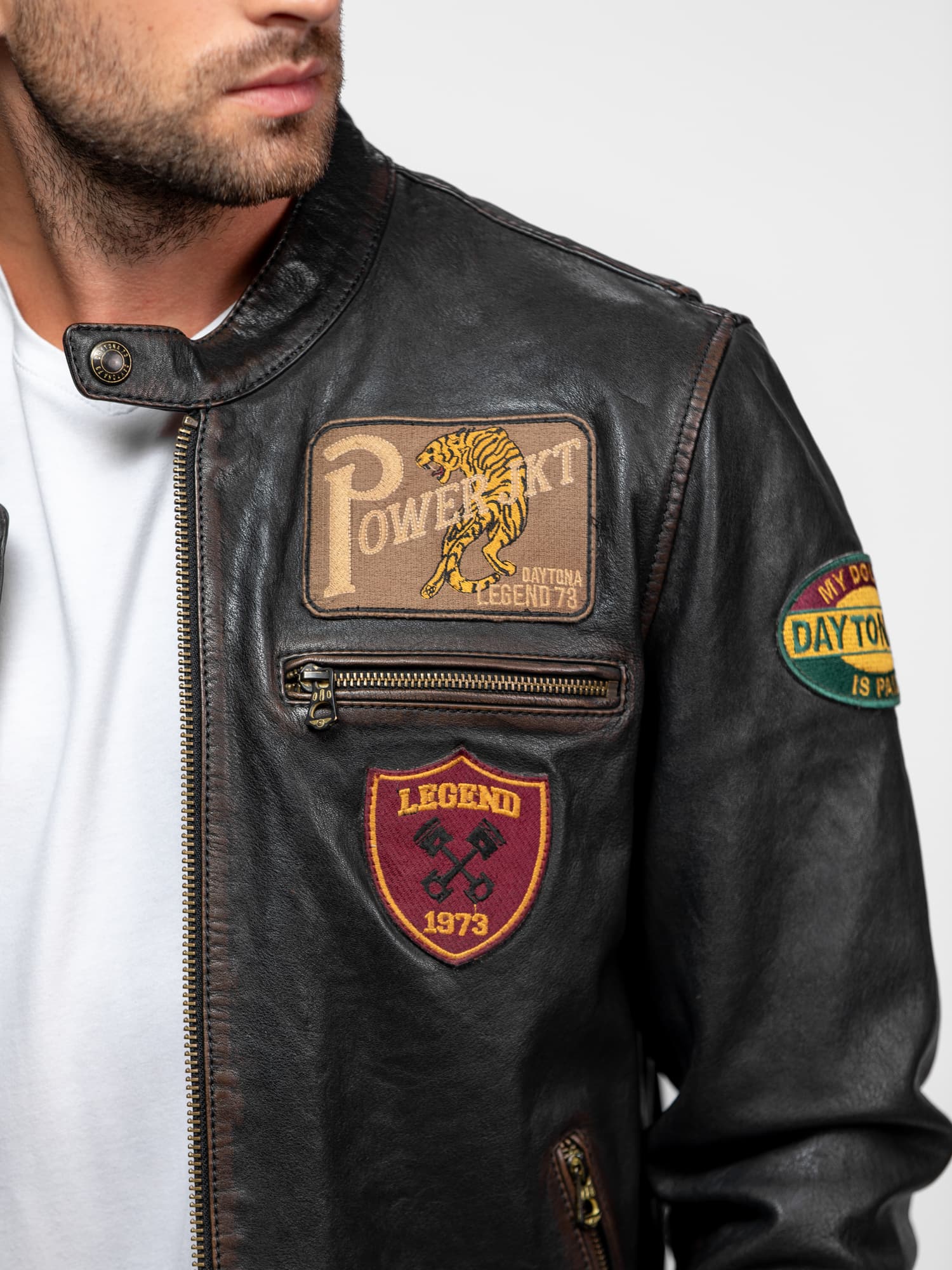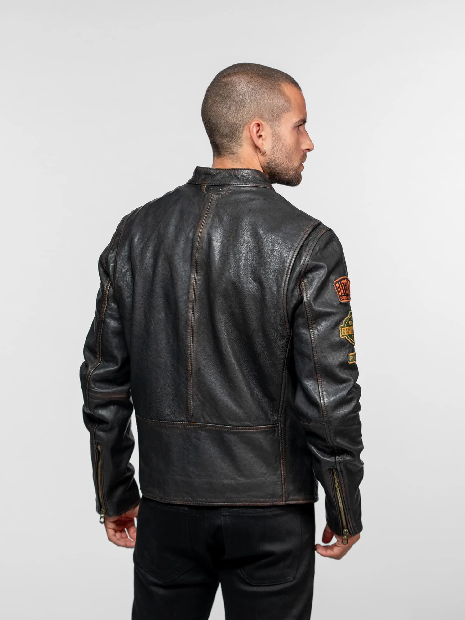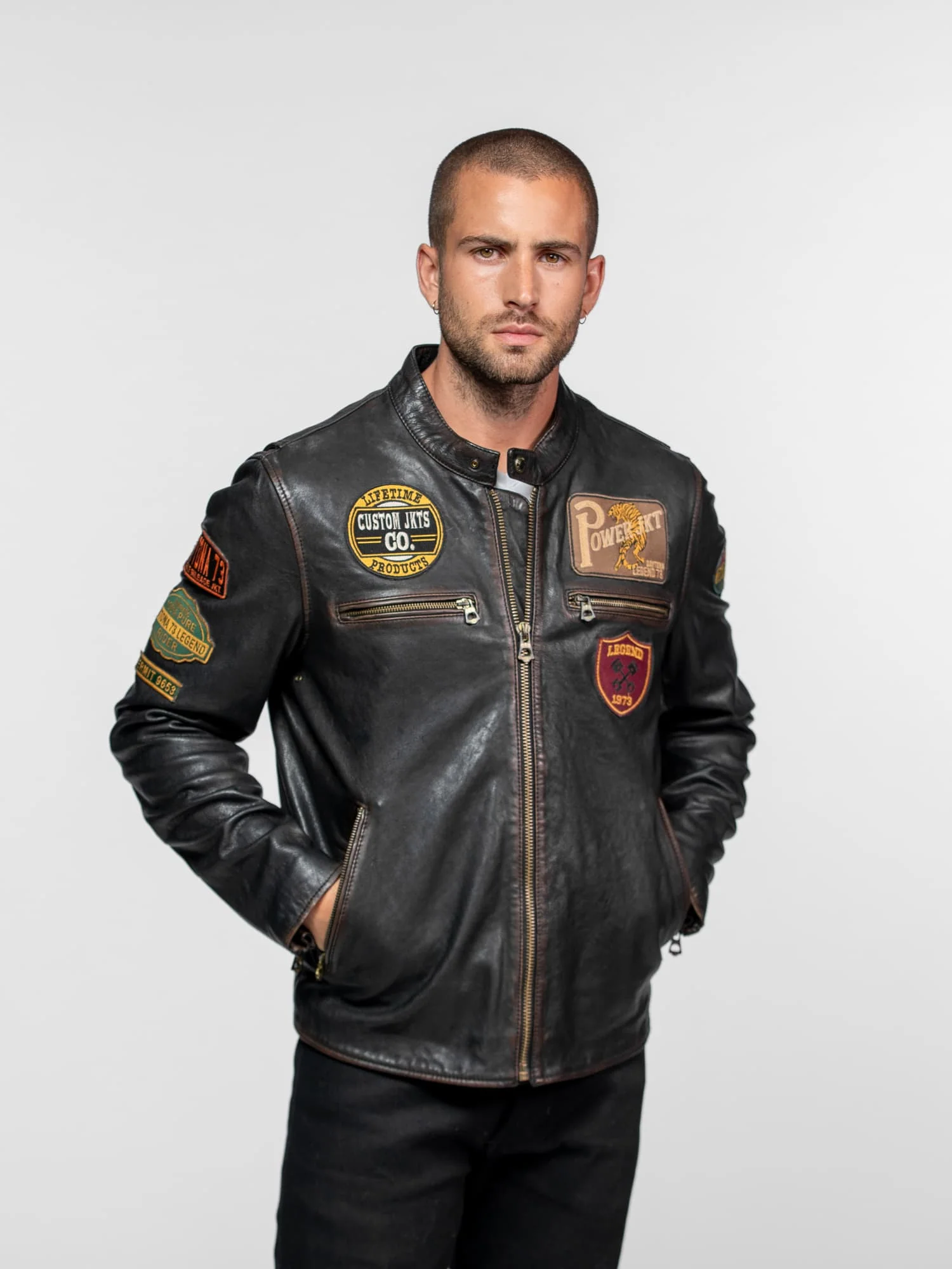 Véritable blouson de caractère, ce modèle a été fabriqué dans un cuir d’agneau vieilli avec des patchs brodés au style vintage. Devenu un modèle iconique pour sa patine unique, ce blouson possède une coupe ajustée et sera probablement le coupe de cœur de votre vestiaire.