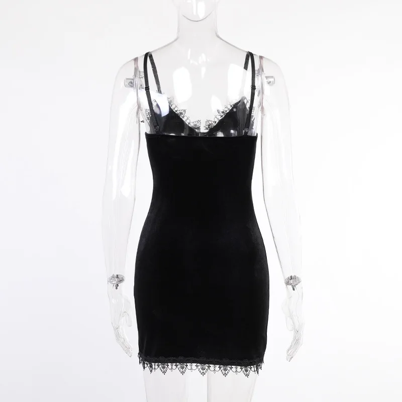 Taillée dans une maille souple et hautement extensible, cette mini robe noire épouse les courbes avec une silhouette gaine irrésistible. Son décolleté en V souligné de dentelle délicate, ses bretelles spaghetti et sa fente latérale asymétrique composent un look gothic chic — idéal pour le club, une soirée ou un rendez-vous nocturne. La taille haute allonge la ligne, le noir profond sculpte la lumière.